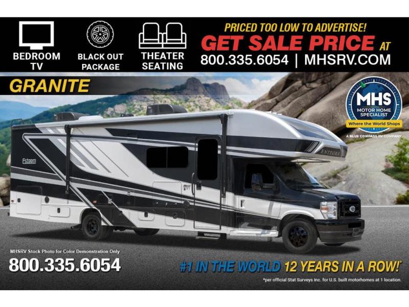 Make one of these Entegra Coach Esteem Class C gas motorhomes your own! The interior design includes solid-surface countertops that pair well with the many technological upgrades. The fully custom-molded ABS surround in the cab area features its signature panoramic window and power shade for a beautiful view while you drive and provide privacy at night. They also come with E-Z Drive Elite which has a computer-balanced driveshaft, Koni FSD shocks, Hellwig helper springs, and a heavy-duty rear stabilizer bar for a smooth ride. Automatic leveling jacks will make set-up a breeze and the electric awning with LED lights will create an outdoor living space where you can relax after unpacking. Inside, you'll enjoy hardwood cabinet doors and drawer fronts, blackout night roller shades, and high-intensity recessed LED ceiling lights to keep your space well lit. There is also a JBL audio system and a BMPRO total coach control system to easily manage your unit's functions!