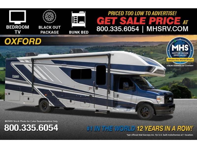 Make one of these Entegra Coach Esteem Class C gas motorhomes your own! The interior design includes solid-surface countertops that pair well with the many technological upgrades. The fully custom-molded ABS surround in the cab area features its signature panoramic window and power shade for a beautiful view while you drive and provide privacy at night. They also come with E-Z Drive Elite which has a computer-balanced driveshaft, Koni FSD shocks, Hellwig helper springs, and a heavy-duty rear stabilizer bar for a smooth ride. Automatic leveling jacks will make set-up a breeze and the electric awning with LED lights will create an outdoor living space where you can relax after unpacking. Inside, you'll enjoy hardwood cabinet doors and drawer fronts, blackout night roller shades, and high-intensity recessed LED ceiling lights to keep your space well lit. There is also a JBL audio system and a BMPRO total coach control system to easily manage your unit's functions!