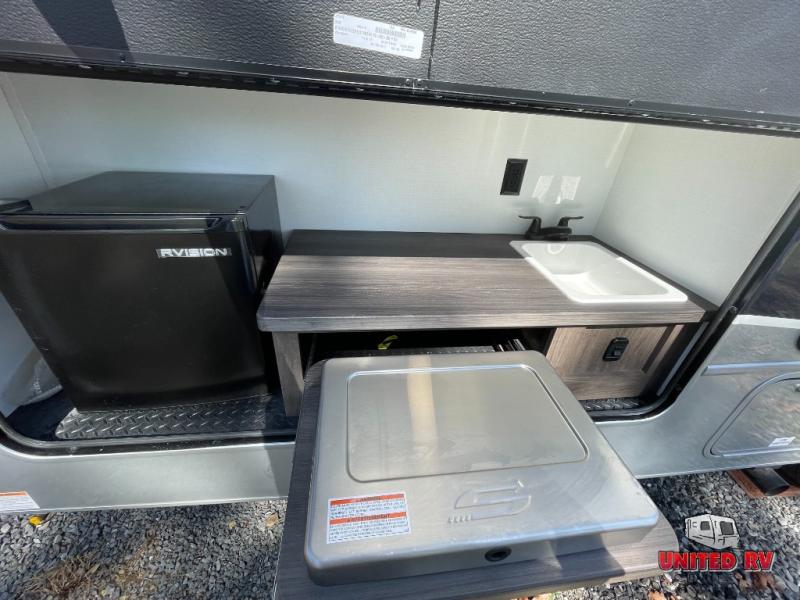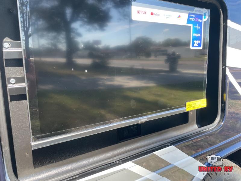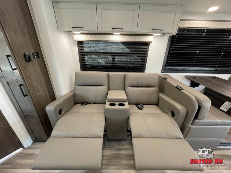 This unit features outside kitchen with entertainment, full body paint, Farmhouse decor, theatre seating, auto level & more!!