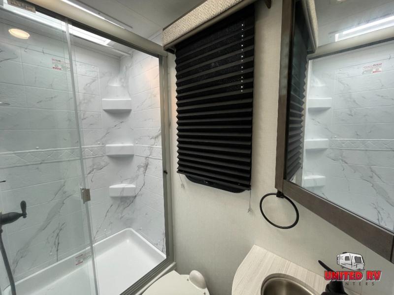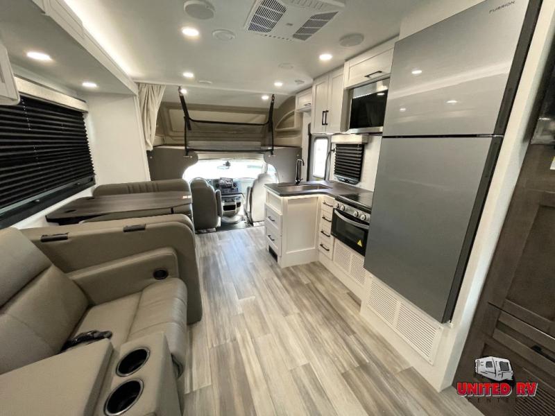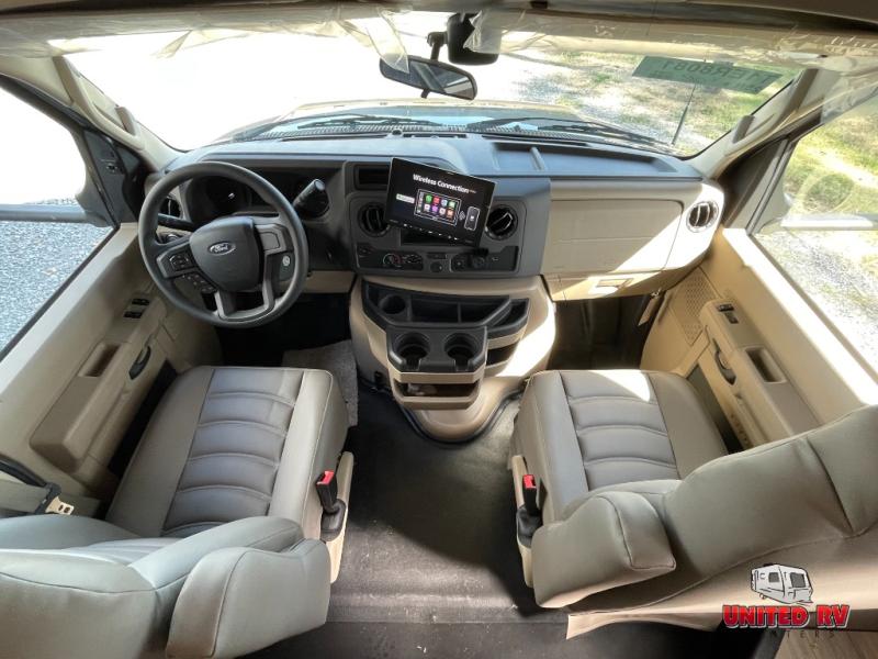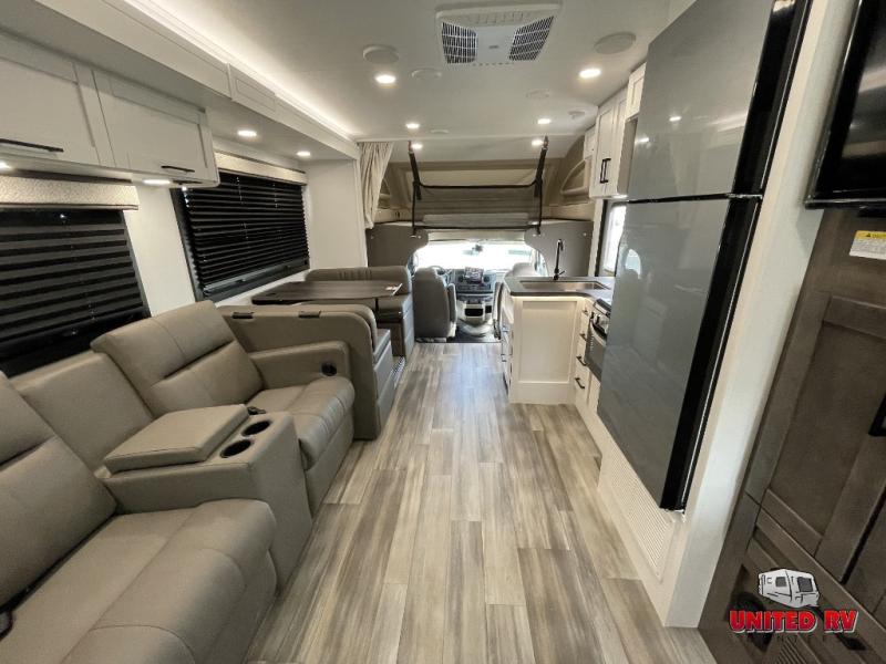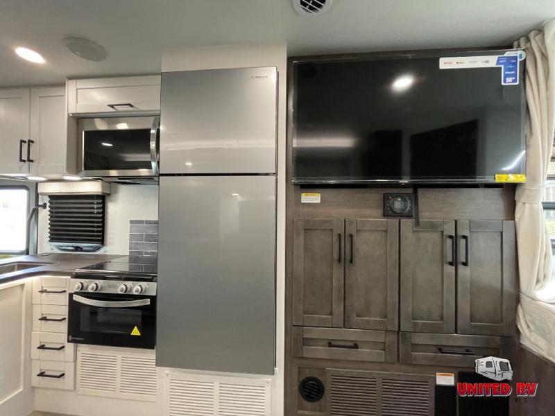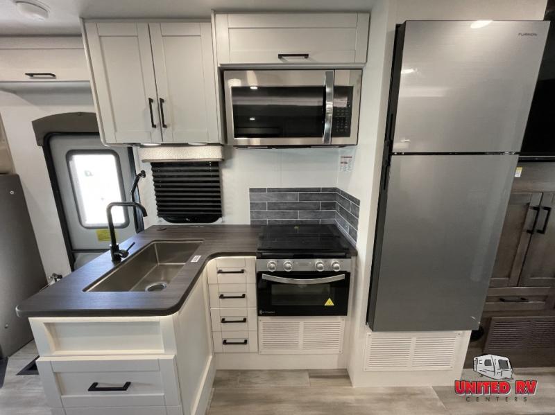 With any Odyssey Class C gas motorhome by Entegra Coach, the driver will appreciate the power from the 325 HP engine, the towing capacity from the 7,500 lb. hitch, the tire pressure monitoring system, the navigation from the Sony infotainment center with Apple CarPlay and Android Auto, plus the backup and side-view cameras when parking and driving down the highway. The kitchen offers full amenities including a recessed stainless steel sink with a cutting board sink cover, LED-lit countertops, a decorative backsplash, and a pop-up charging station with 110 outlet and USB plugs to keep your smart phones charged. Get ready for luxury in a Class C, choose your favorite today!