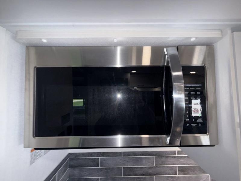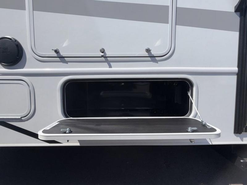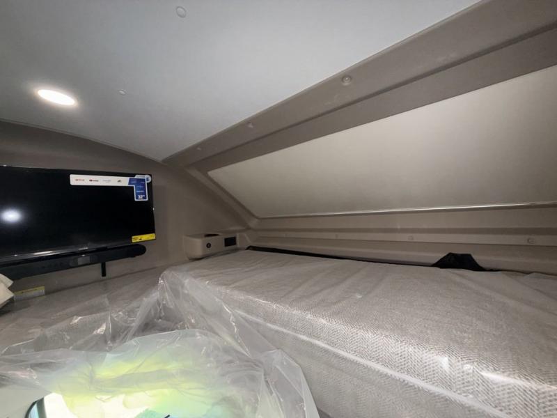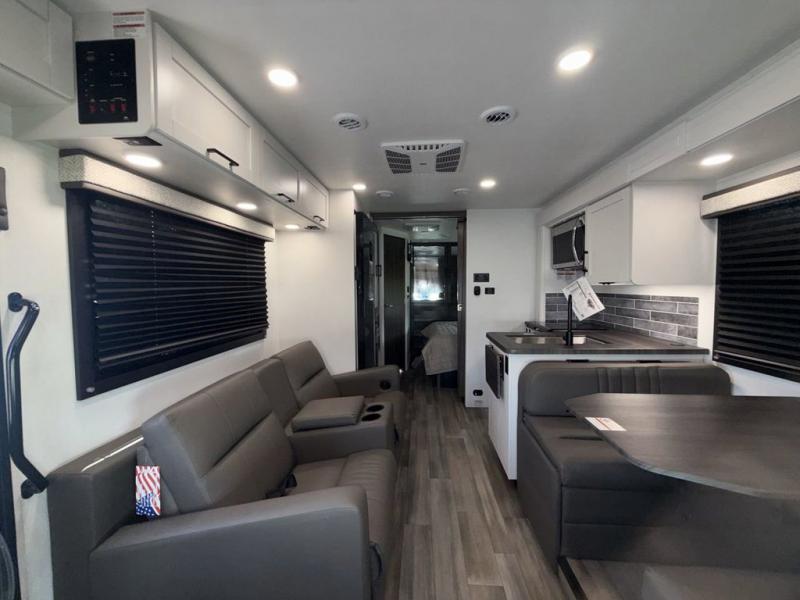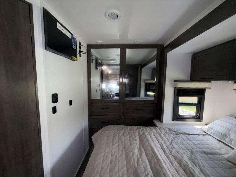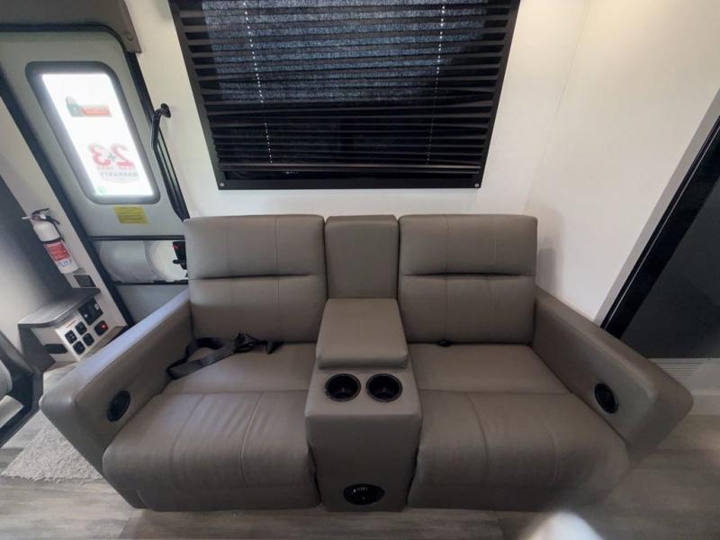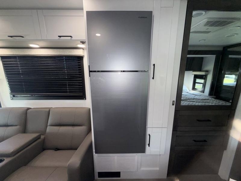 Sleep like a king after driving the scenic byways, hiking the trails and exploring the campgrounds. The rear bedroom offers a king bed slide, a wardrobe, a TV option, and a sliding door to close off the bedroom with an additional wardrobe and the corner full bathroom. The combined kitchen and living area is spacious thanks to another slide which includes a booth dinette, and kitchen amenities including a counter extension, sink, the Furrion all-in-one-cooktop and oven and a residential-size microwave. And the 8 cu. ft. refrigerator and pantry are next to the sofa so you can easily grab a beverage before sitting down. The furniture doubles as sleeping space, and the cab-over bunk is always available.