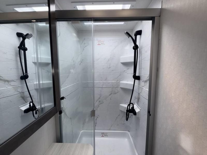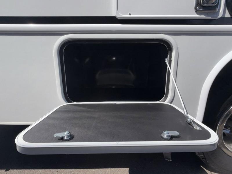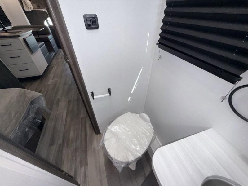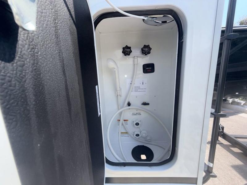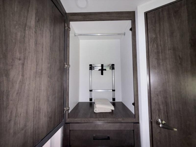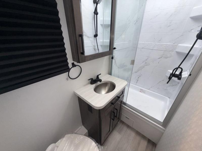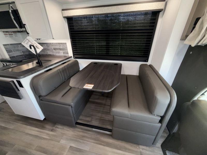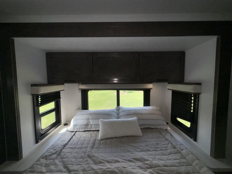 Sleep like a king after driving the scenic byways, hiking the trails and exploring the campgrounds. The rear bedroom offers a king bed slide, a wardrobe, a TV option, and a sliding door to close off the bedroom with an additional wardrobe and the corner full bathroom. The combined kitchen and living area is spacious thanks to another slide which includes a booth dinette, and kitchen amenities including a counter extension, sink, the Furrion all-in-one-cooktop and oven and a residential-size microwave. And the 8 cu. ft. refrigerator and pantry are next to the sofa so you can easily grab a beverage before sitting down. The furniture doubles as sleeping space, and the cab-over bunk is always available.