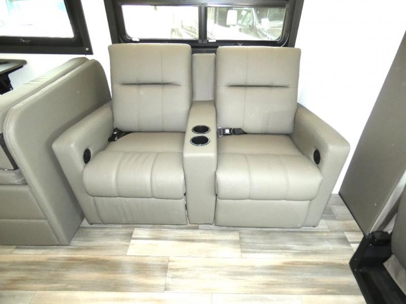 With any Odyssey Class C gas motorhome by Entegra Coach, the driver will appreciate the power from the 325 HP engine, the towing capacity from the 7,500 lb. hitch, the tire pressure monitoring system, the navigation from the Sony infotainment center with Apple CarPlay and Android Auto, plus the backup and side-view cameras when parking and driving down the highway. The kitchen offers full amenities including a recessed stainless steel sink with a cutting board sink cover, LED-lit pressed countertops, a decorative backsplash, and a pop-up charging station with 110 outlet and USB plugs to keep your smart phones charged. Get ready for luxury in a Class C, choose your favorite today!