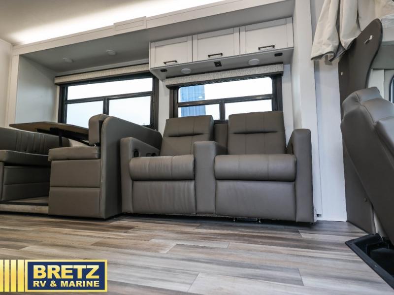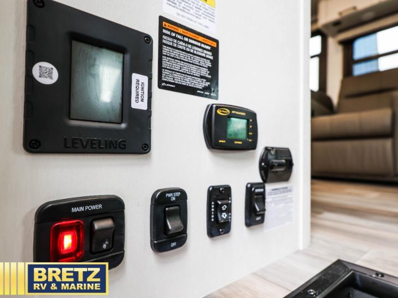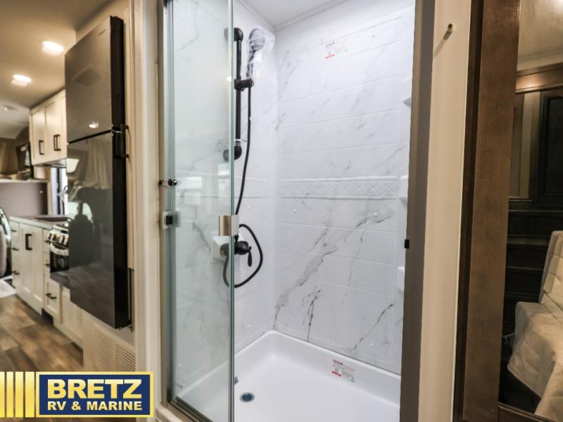 This coach allows you to take vacations in comfort and luxury with a spacious bedroom that includes a queen bed slide, dual wardrobes and a TV option for nighttime viewing, plus a way to close off the bedroom for privacy. The split bathroom gives you the ability to take a shower while another is brushing their teeth in the private toilet and sink room. You will find the main living and kitchen area to be spacious as well with a slide out that includes a booth dinette and sofa. And the cook will love the galley kitchen including the residential-size microwave and Furrion all-in-one cooktop and oven. And the cab-over bunk plus the furniture offers extra sleeping space. There are many more features to enjoy, take a look!