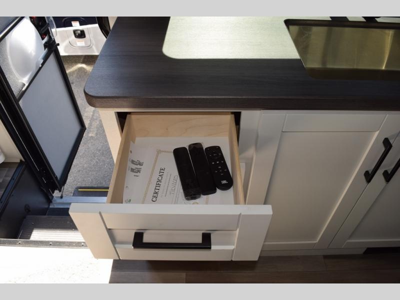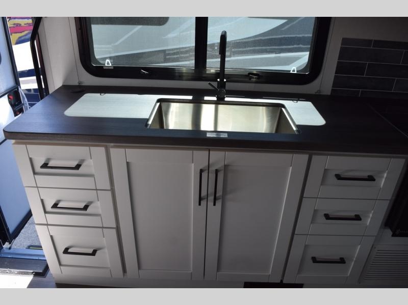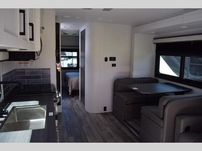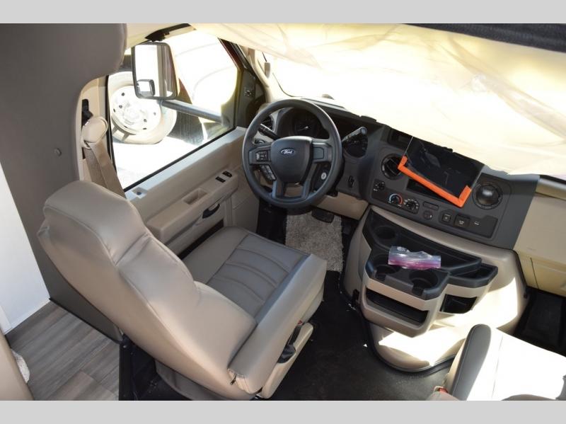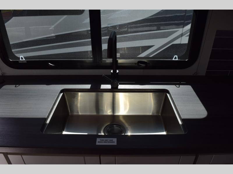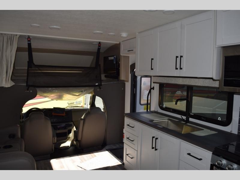 With any Odyssey Class C gas motorhome by Entegra Coach, the driver will appreciate the power from the 325 HP engine, the towing capacity from the 7,500 lb. hitch, the tire pressure monitoring system, the navigation from the Sony infotainment center with Apple CarPlay and Android Auto, plus the backup and side-view cameras when parking and driving down the highway. The kitchen offers full amenities including a recessed stainless steel sink with a cutting board sink cover, LED-lit pressed countertops, a decorative backsplash, and a pop-up charging station with 110 outlet and USB plugs to keep your smart phones charged. Get ready for luxury in a Class C, choose your favorite today!