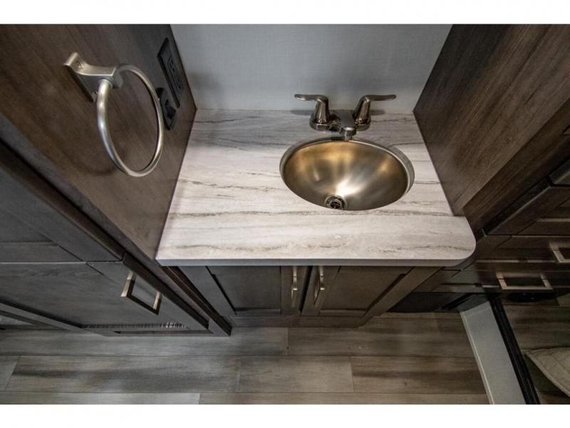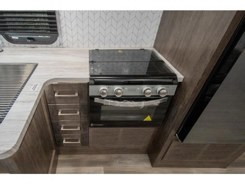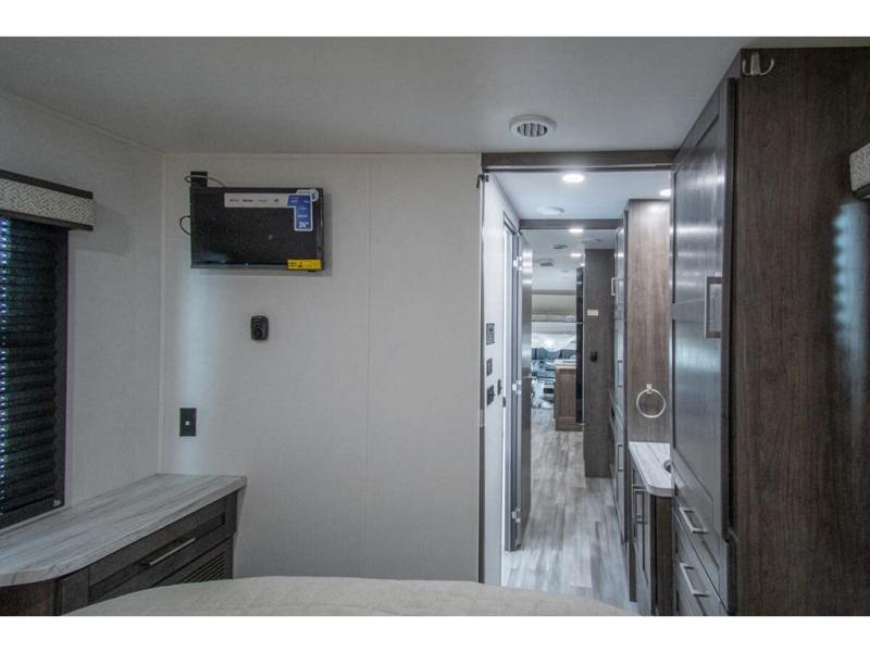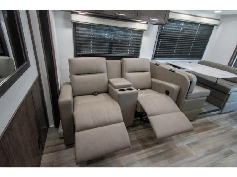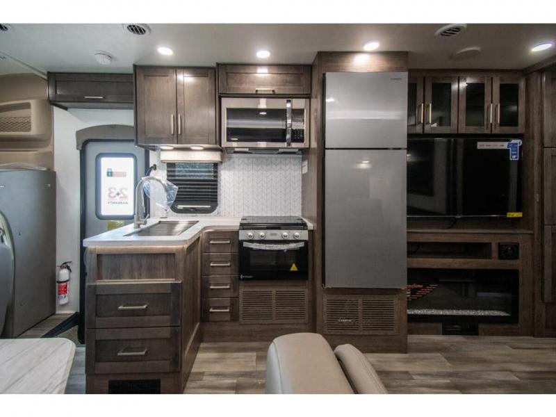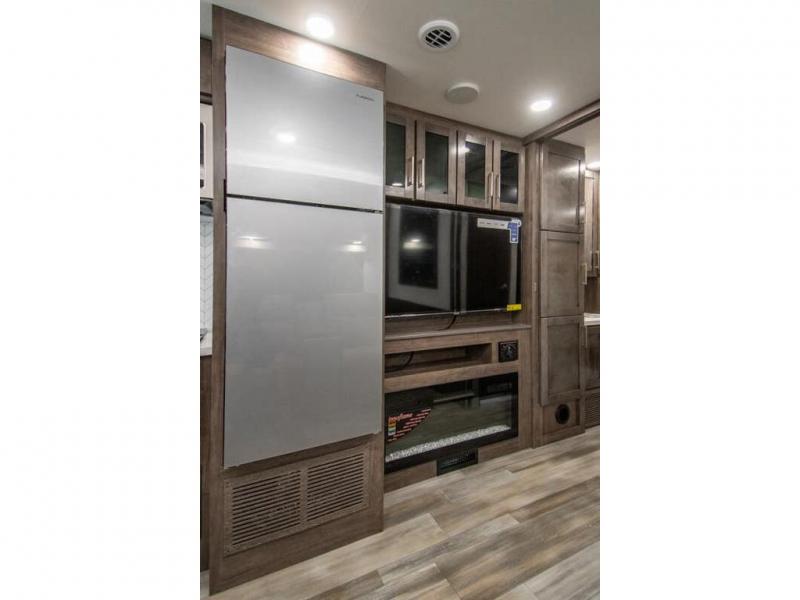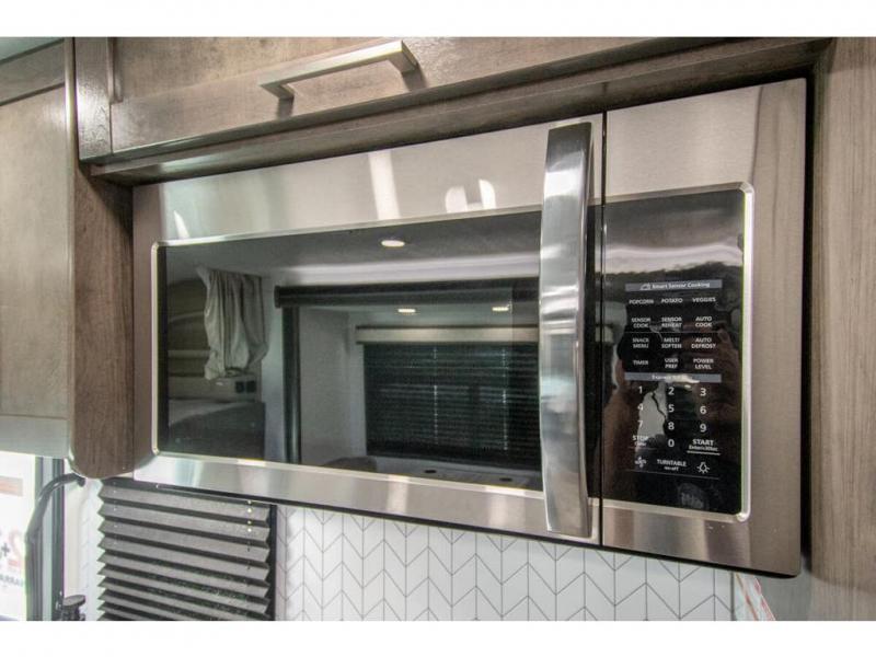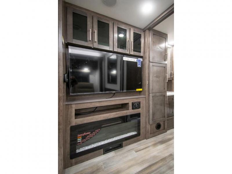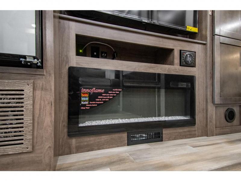 Relax inside while sitting on the sofa, at the booth dinette or on the swivel captains chairs while enjoying the fireplace and 50" TV, or unwind outside under the 18' electric awning while watching the exterior TV. After shopping in town or hiking the trails you can get cleaned up in the private toilet and shower room then brush your teeth in the bathroom sink a few steps outside the door. The private bedroom includes a space saving sliding door, a unique rear queen bed slide, plus storage. The cook will enjoy making meals using the residential-size microwave and Furrion all-in-one cooktop and oven, then storing leftovers in the 8 cu. ft. refrigerator. And the L-shaped counter with sink will come in handy.