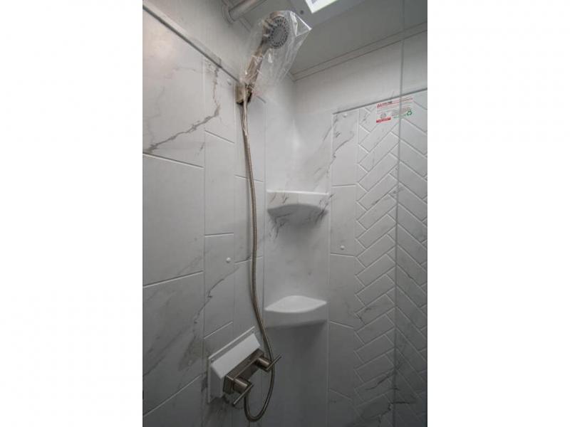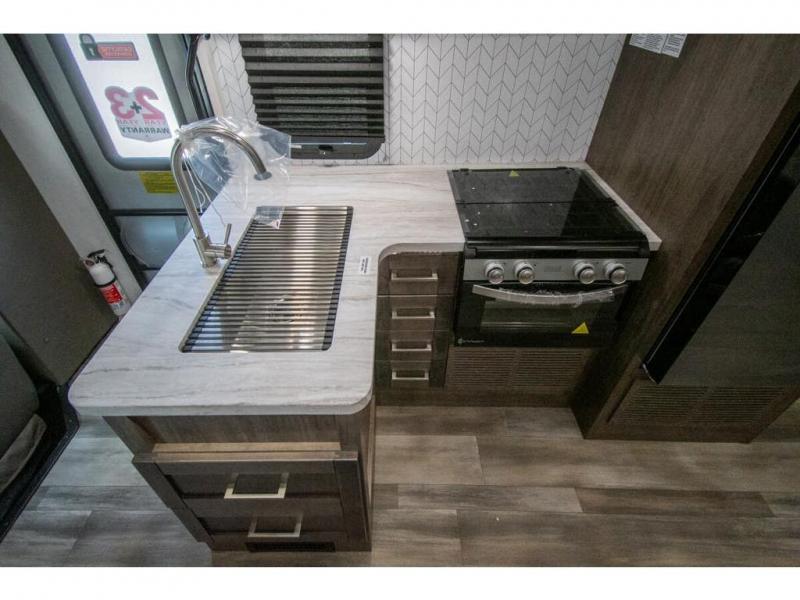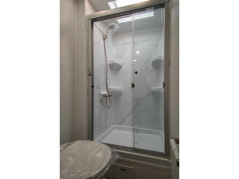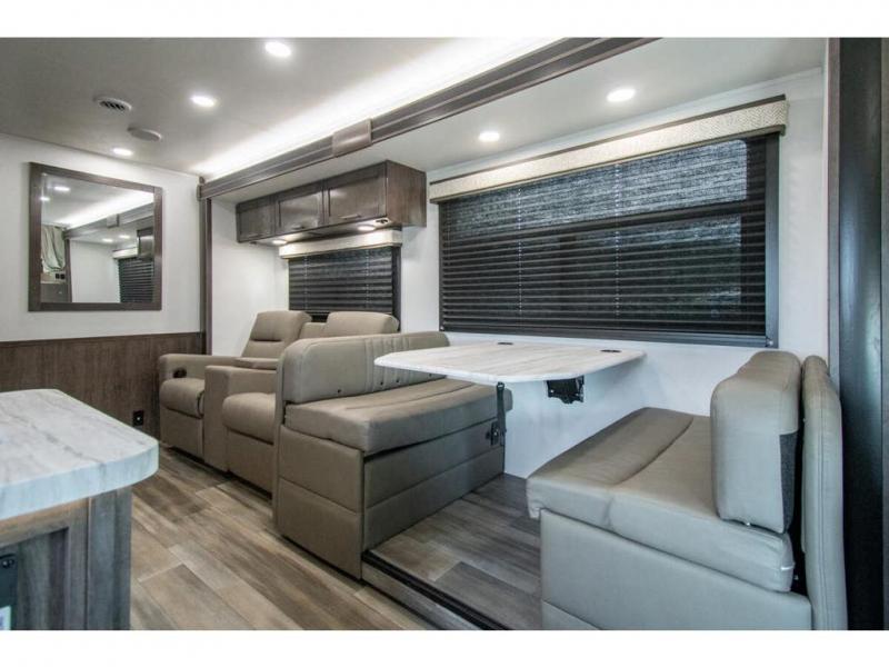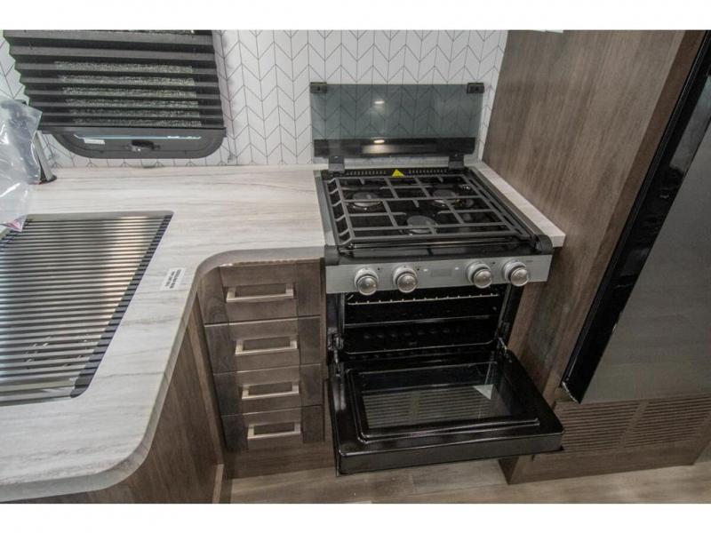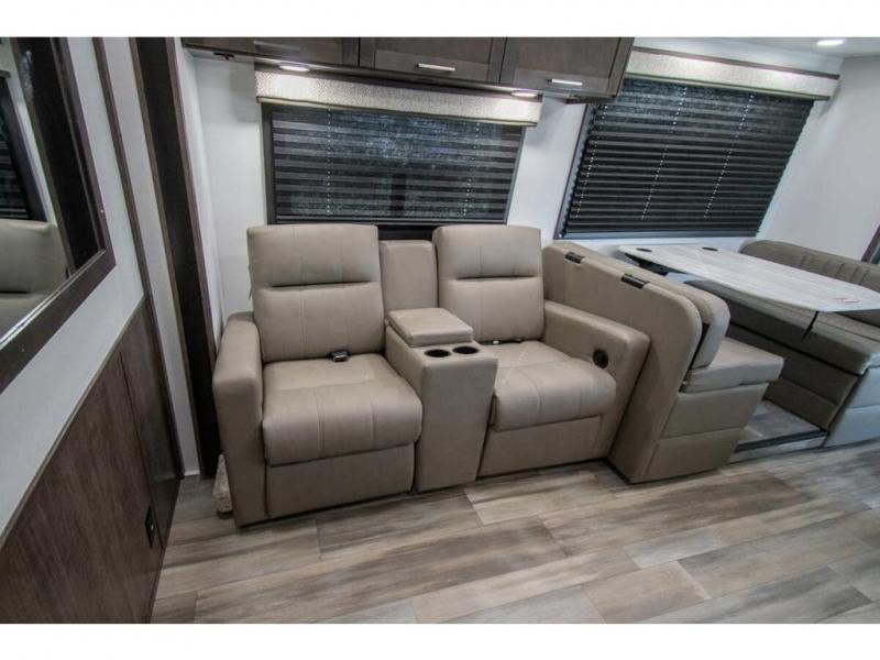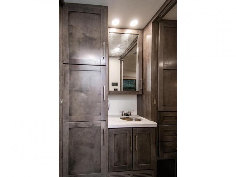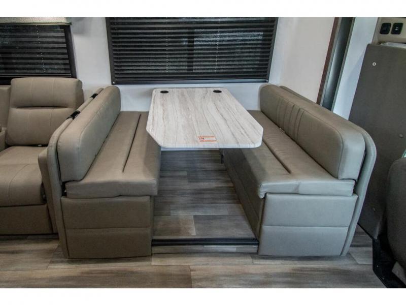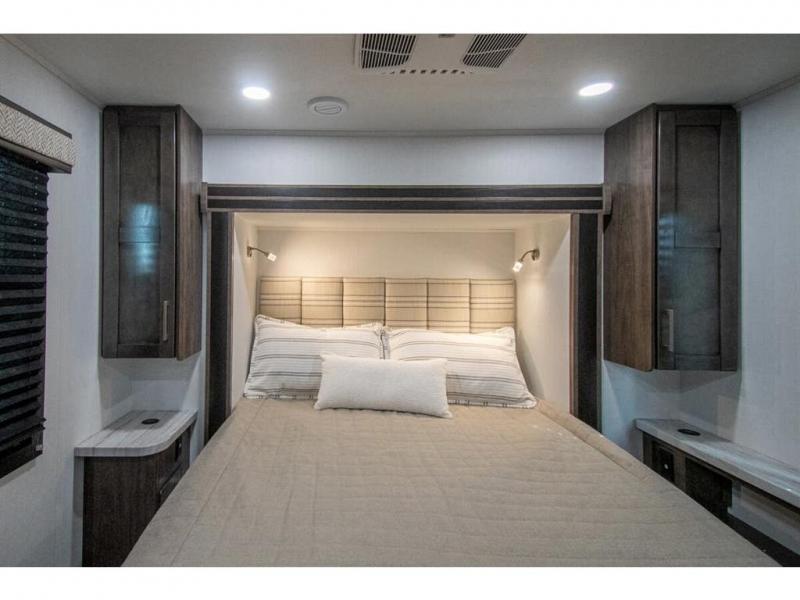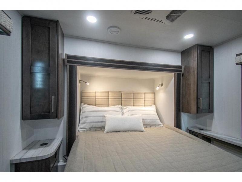 Relax inside while sitting on the sofa, at the booth dinette or on the swivel captains chairs while enjoying the fireplace and 50" TV, or unwind outside under the 18' electric awning while watching the exterior TV. After shopping in town or hiking the trails you can get cleaned up in the private toilet and shower room then brush your teeth in the bathroom sink a few steps outside the door. The private bedroom includes a space saving sliding door, a unique rear queen bed slide, plus storage. The cook will enjoy making meals using the residential-size microwave and Furrion all-in-one cooktop and oven, then storing leftovers in the 8 cu. ft. refrigerator. And the L-shaped counter with sink will come in handy.