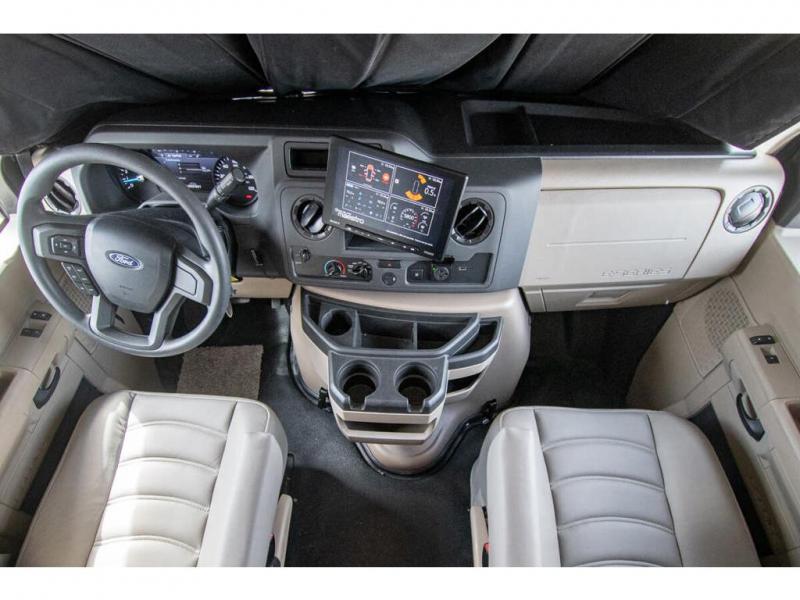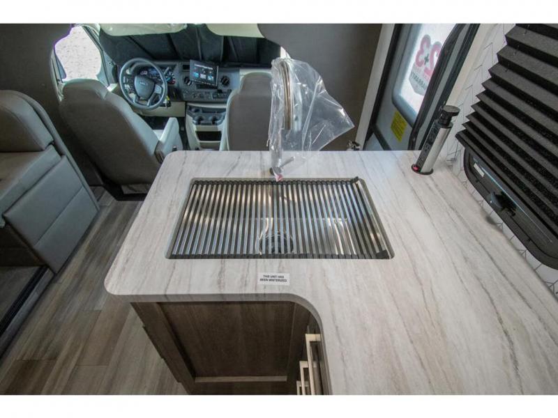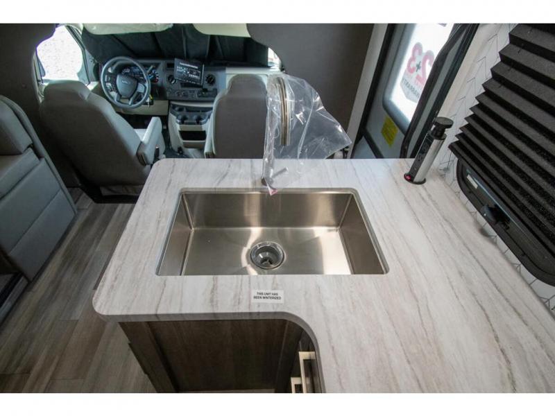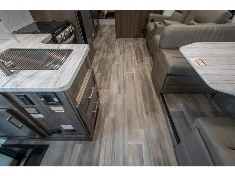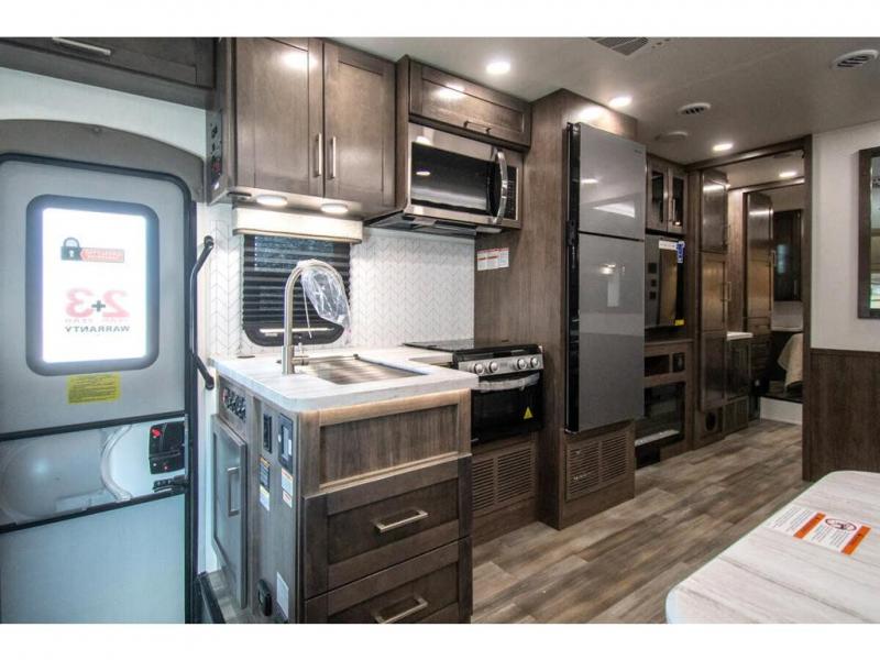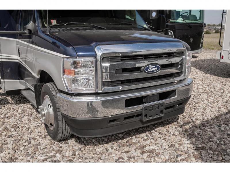With any Odyssey Class C gas motorhome by Entegra Coach, the driver will appreciate the power from the 325 HP engine, the towing capacity from the 7,500 lb. hitch, the tire pressure monitoring system, the navigation from the Sony infotainment center with Apple CarPlay and Android Auto, plus the backup and side-view cameras when parking and driving down the highway. The kitchen offers full amenities including a recessed stainless steel sink with a cutting board sink cover, LED-lit pressed countertops, a decorative backsplash, and a pop-up charging station with 110 outlet and USB plugs to keep your smart phones charged. Get ready for luxury in a Class C, choose your favorite today!