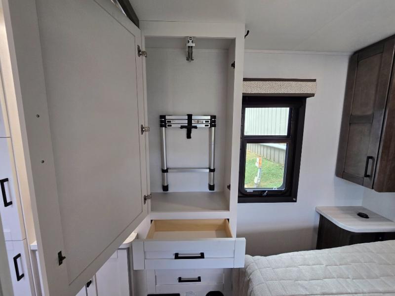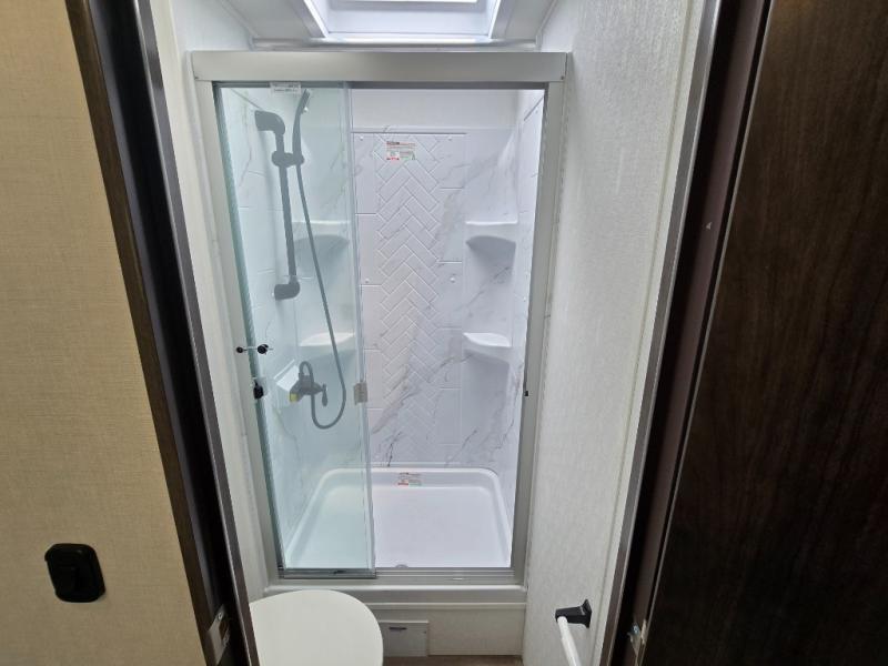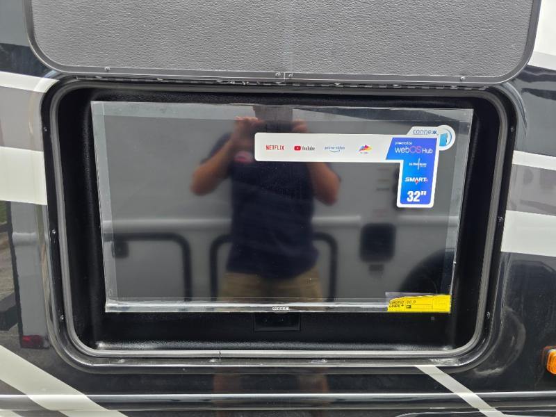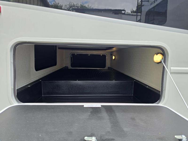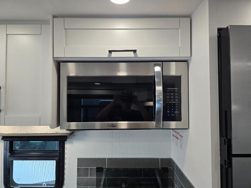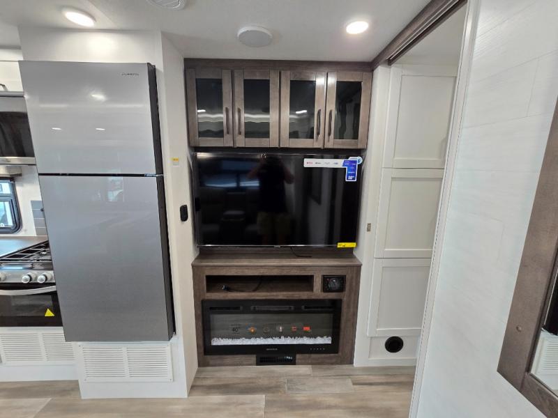 Relax inside while sitting on the sofa, at the booth dinette or on the swivel captains chairs while enjoying the fireplace and 50" TV, or unwind outside under the 18' electric awning while watching the exterior TV. After shopping in town or hiking the trails you can get cleaned up in the private toilet and shower room then brush your teeth in the bathroom sink a few steps outside the door. The private bedroom includes a space saving sliding door, a unique rear queen bed slide, plus storage. The cook will enjoy making meals using the residential-size microwave and Furrion all-in-one cooktop and oven, then storing leftovers in the 8 cu. ft. refrigerator. And the L-shaped counter with sink will come in handy.