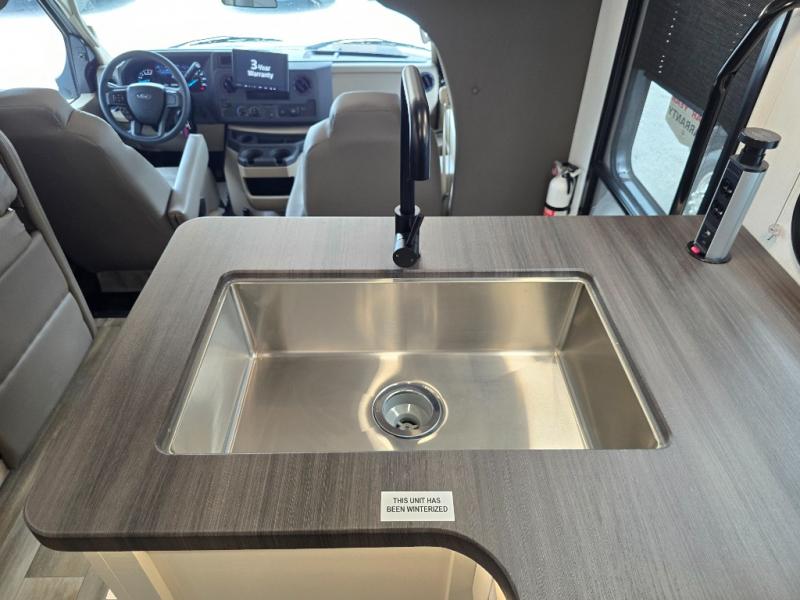 With any Odyssey Class C gas motorhome by Entegra Coach, the driver will appreciate the power from the 325 HP engine, the towing capacity from the 7,500 lb. hitch, the tire pressure monitoring system, the navigation from the Sony infotainment center with Apple CarPlay and Android Auto, plus the backup and side-view cameras when parking and driving down the highway. The kitchen offers full amenities including a recessed stainless steel sink with a cutting board sink cover, LED-lit pressed countertops, a decorative backsplash, and a pop-up charging station with 110 outlet and USB plugs to keep your smart phones charged. Get ready for luxury in a Class C, choose your favorite today!