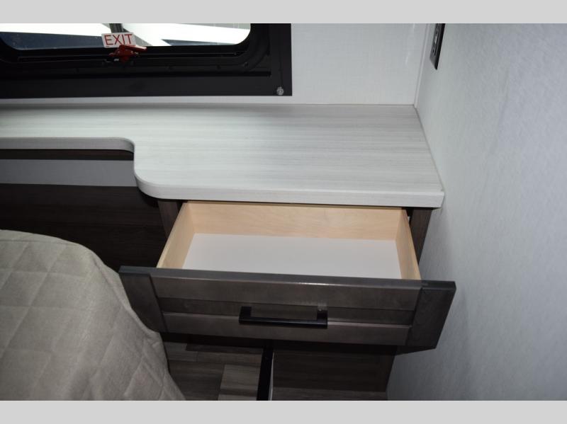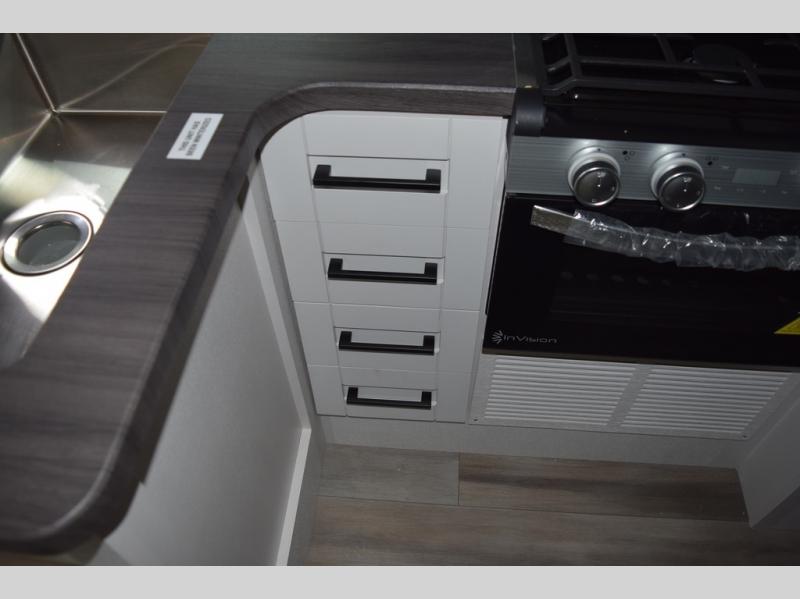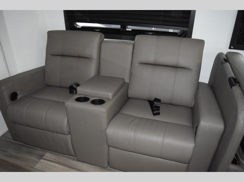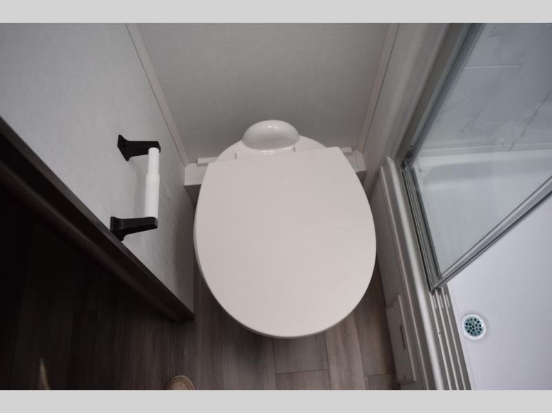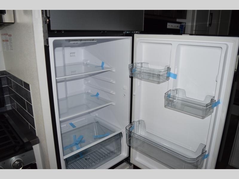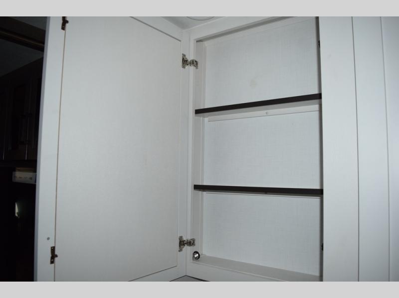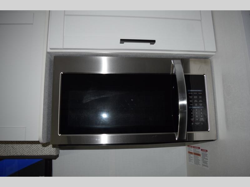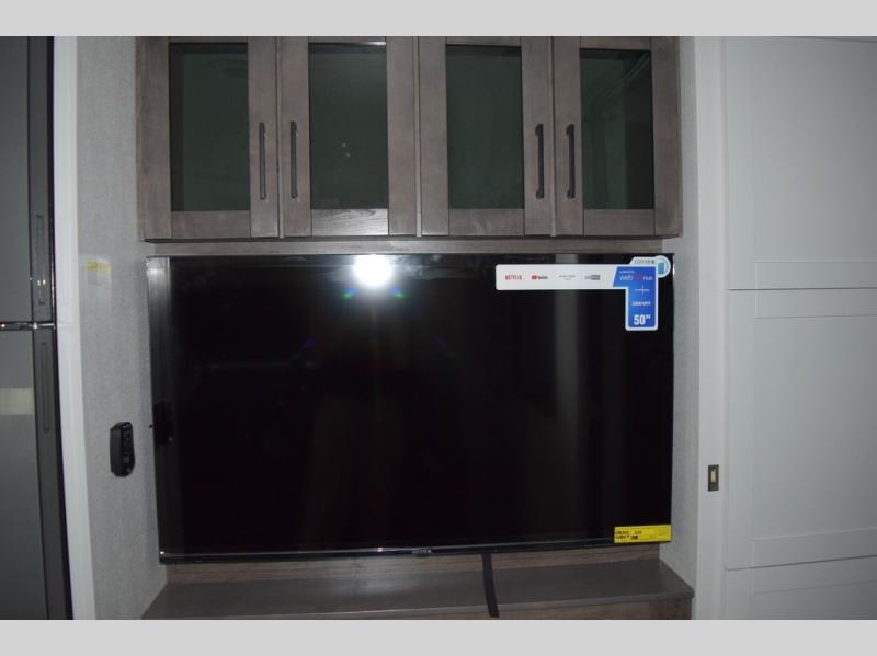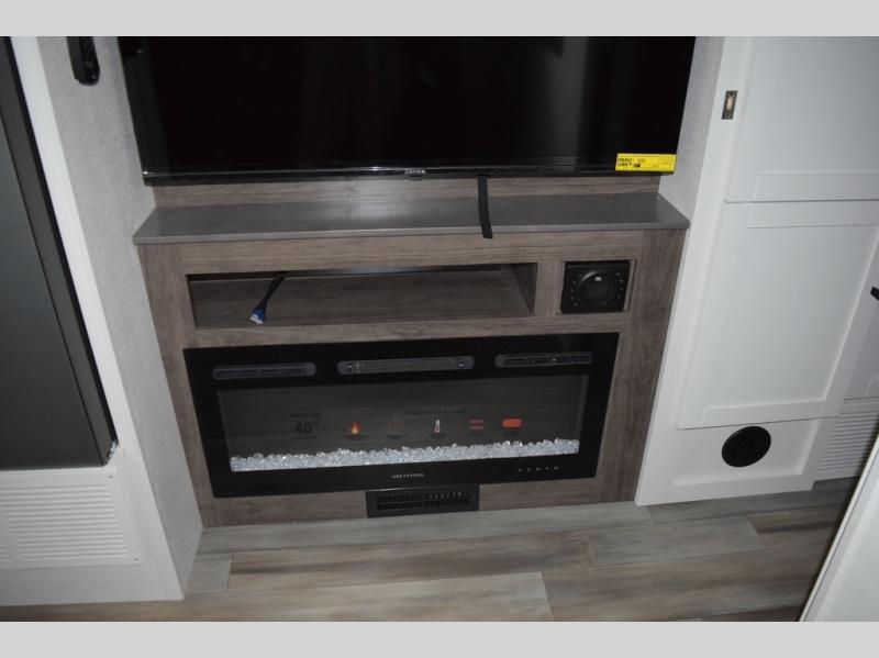 Relax inside while sitting on the sofa, at the booth dinette or on the swivel captains chairs while enjoying the fireplace and 50" TV, or unwind outside under the 18' electric awning while watching the exterior TV. After shopping in town or hiking the trails you can get cleaned up in the private toilet and shower room then brush your teeth in the bathroom sink a few steps outside the door. The private bedroom includes a space saving sliding door, a unique rear queen bed slide, plus storage. The cook will enjoy making meals using the residential-size microwave and Furrion all-in-one cooktop and oven, then storing leftovers in the 8 cu. ft. refrigerator. And the L-shaped counter with sink will come in handy.