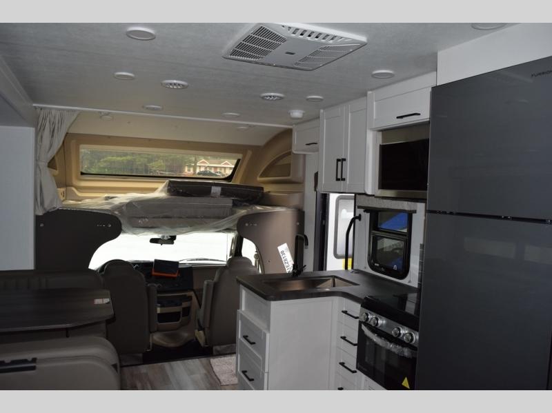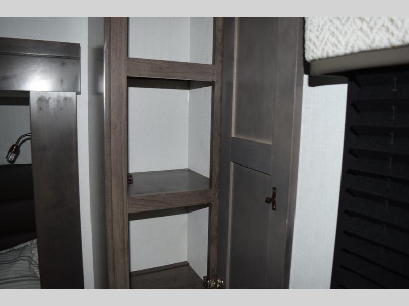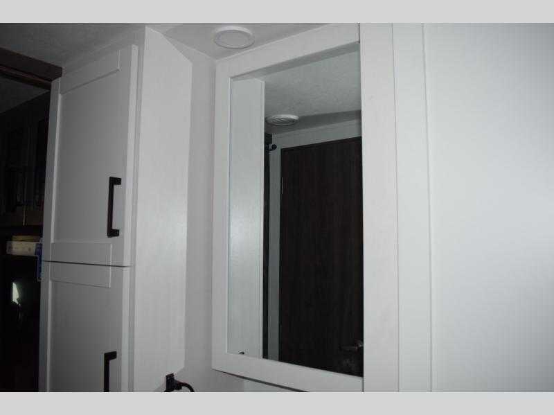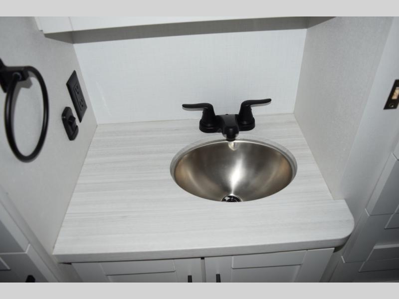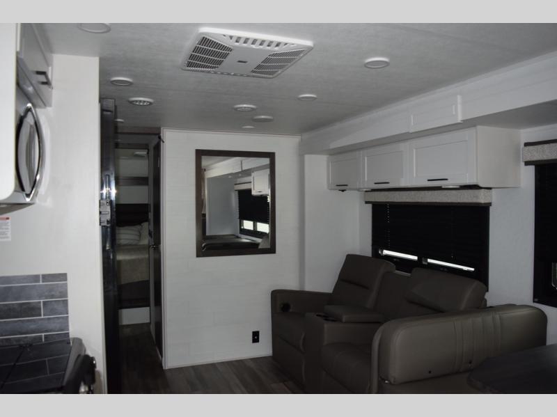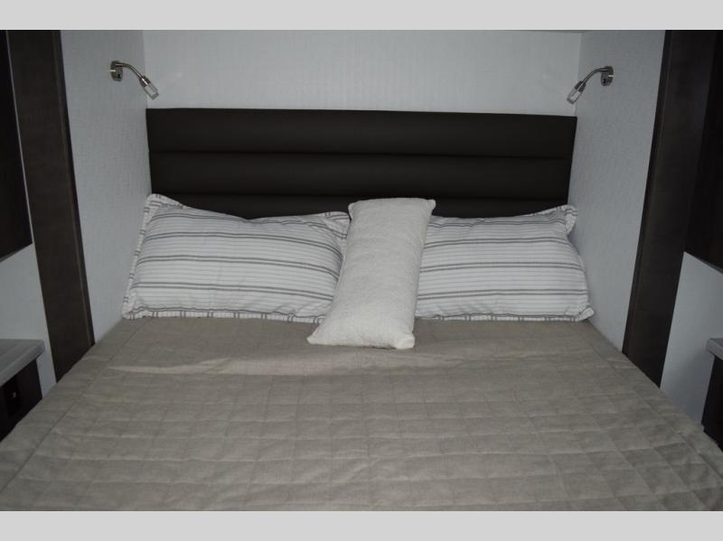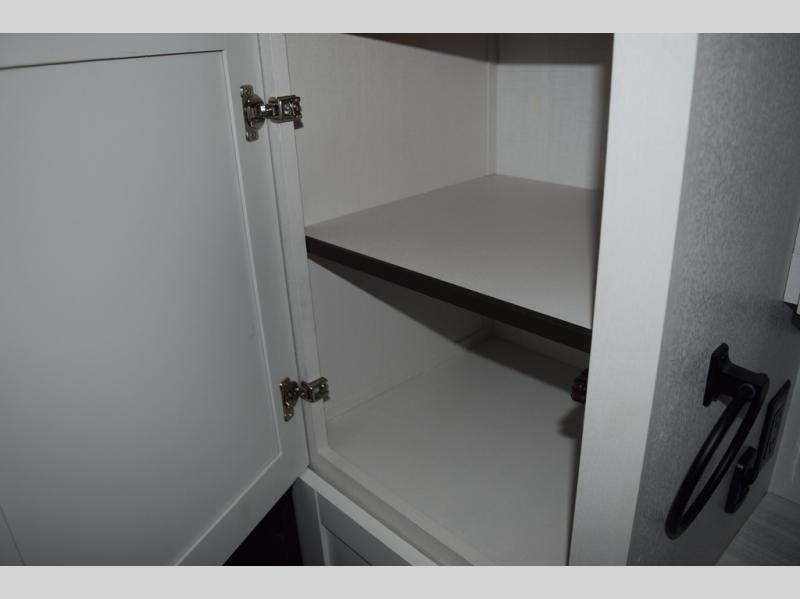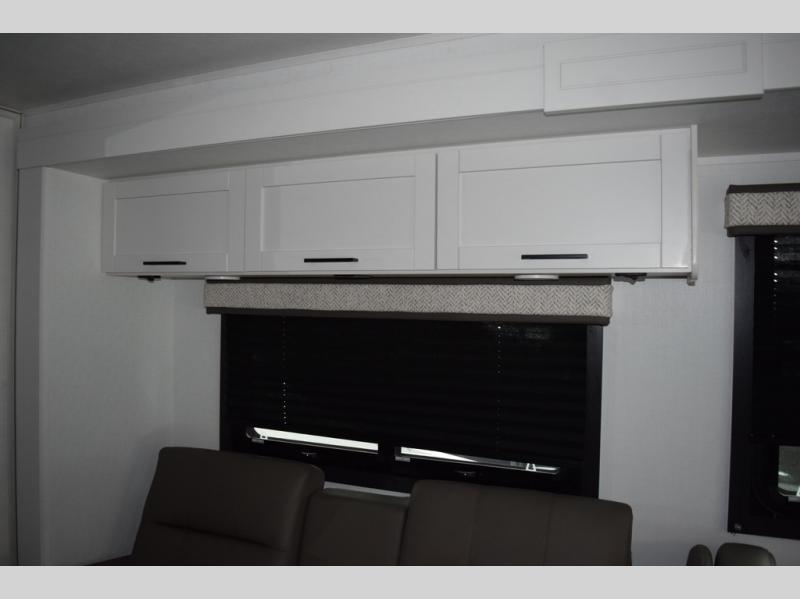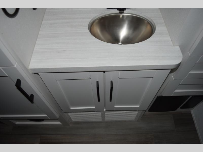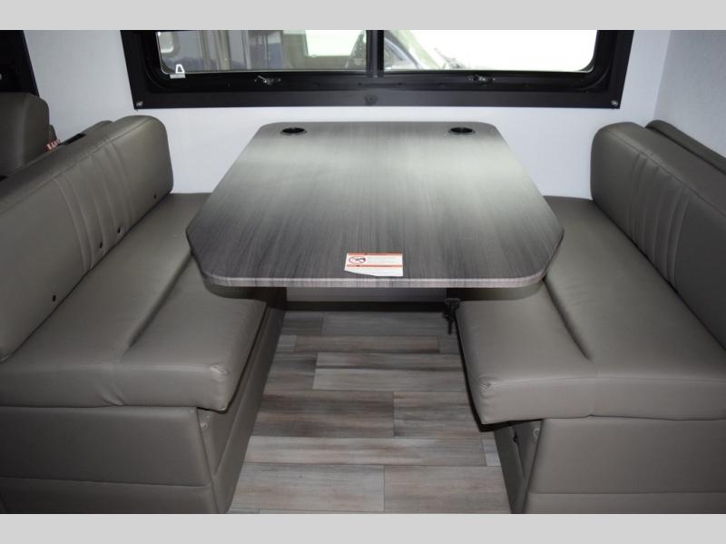 Relax inside while sitting on the sofa, at the booth dinette or on the swivel captains chairs while enjoying the fireplace and 50" TV, or unwind outside under the 18' electric awning while watching the exterior TV. After shopping in town or hiking the trails you can get cleaned up in the private toilet and shower room then brush your teeth in the bathroom sink a few steps outside the door. The private bedroom includes a space saving sliding door, a unique rear queen bed slide, plus storage. The cook will enjoy making meals using the residential-size microwave and Furrion all-in-one cooktop and oven, then storing leftovers in the 8 cu. ft. refrigerator. And the L-shaped counter with sink will come in handy.
