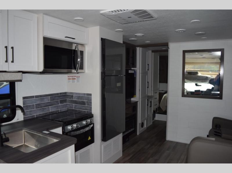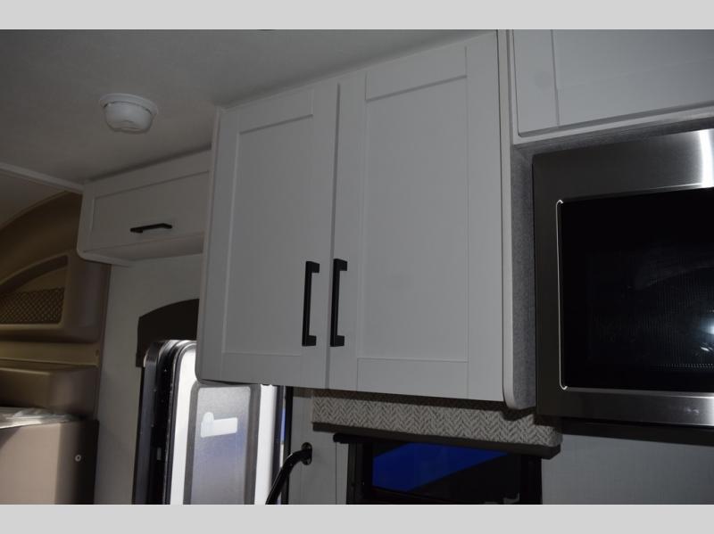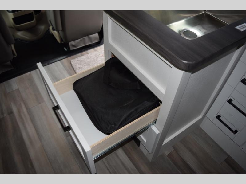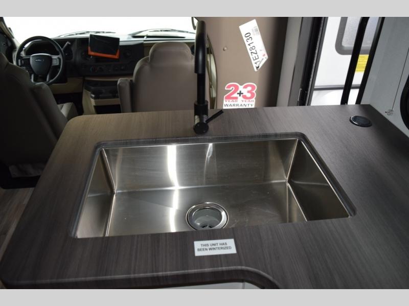 With any Odyssey Class C gas motorhome by Entegra Coach, the driver will appreciate the power from the 325 HP engine, the towing capacity from the 7,500 lb. hitch, the tire pressure monitoring system, the navigation from the Sony infotainment center with Apple CarPlay and Android Auto, plus the backup and side-view cameras when parking and driving down the highway. The kitchen offers full amenities including a recessed stainless steel sink with a cutting board sink cover, LED-lit pressed countertops, a decorative backsplash, and a pop-up charging station with 110 outlet and USB plugs to keep your smart phones charged. Get ready for luxury in a Class C, choose your favorite today!