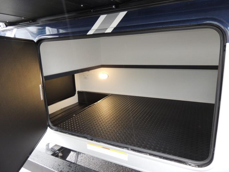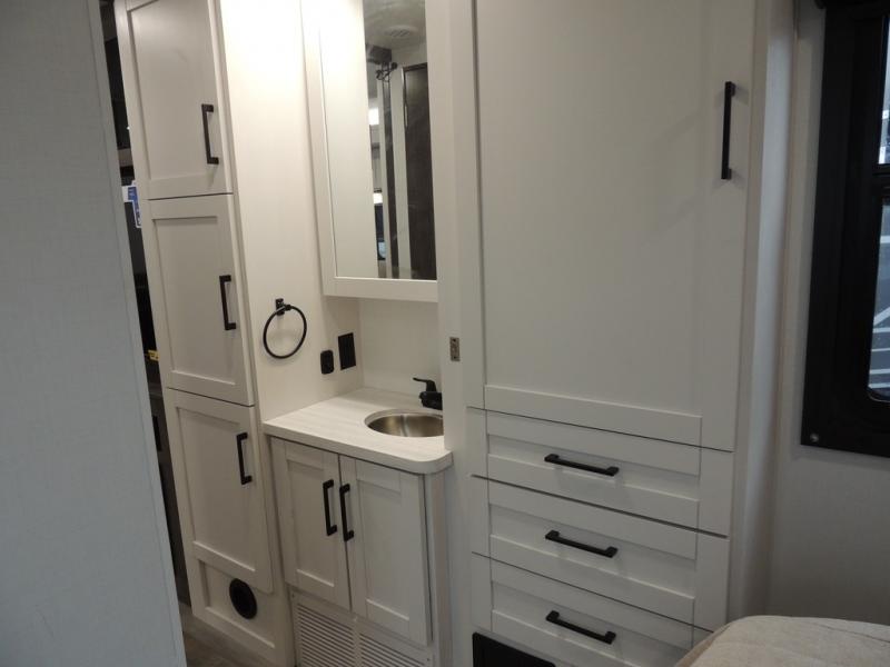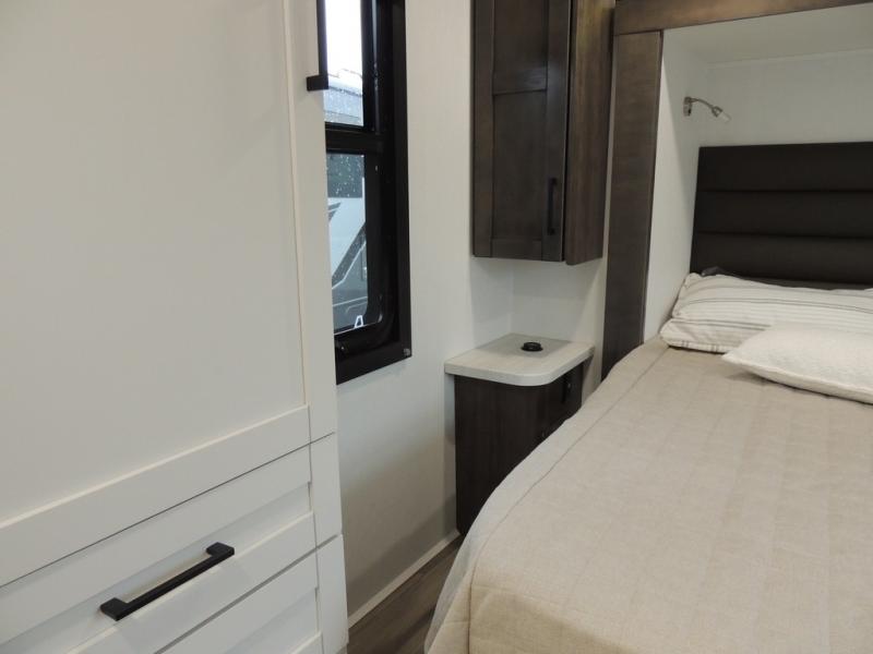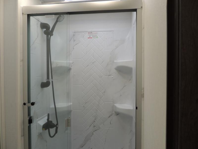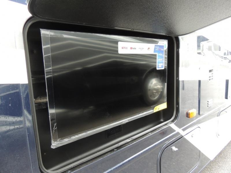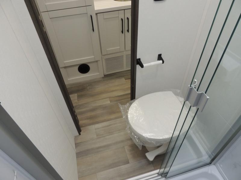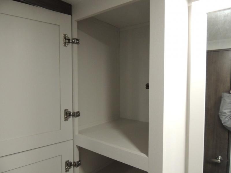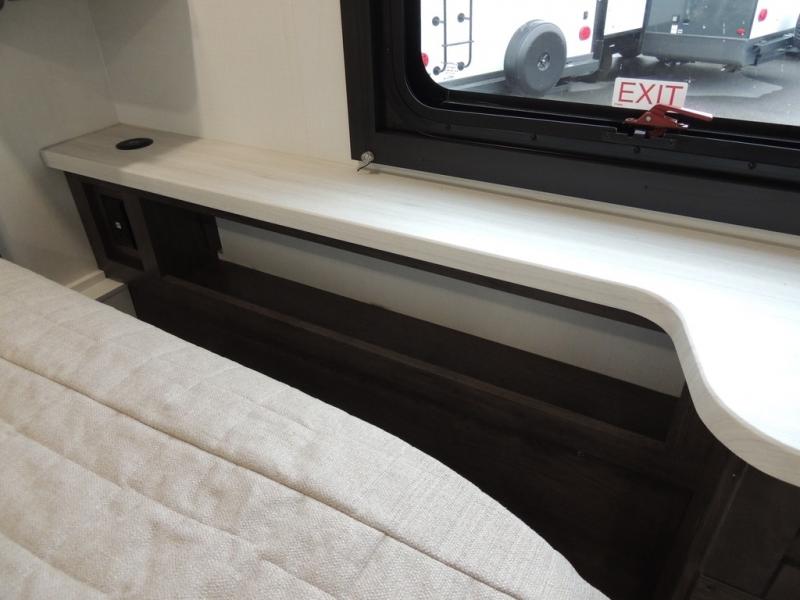 Relax inside while sitting on the sofa, at the booth dinette or on the swivel captains chairs while enjoying the fireplace and 50" TV, or unwind outside under the 18' electric awning while watching the exterior TV. After shopping in town or hiking the trails you can get cleaned up in the private toilet and shower room then brush your teeth in the bathroom sink a few steps outside the door. The private bedroom includes a space saving sliding door, a unique rear queen bed slide, plus storage. The cook will enjoy making meals using the residential-size microwave and Furrion all-in-one cooktop and oven, then storing leftovers in the 8 cu. ft. refrigerator. And the L-shaped counter with sink will come in handy.