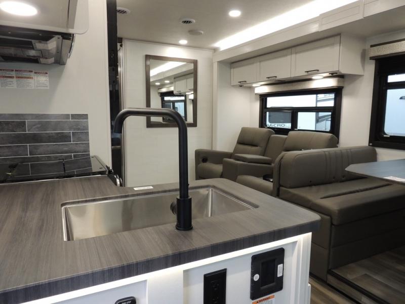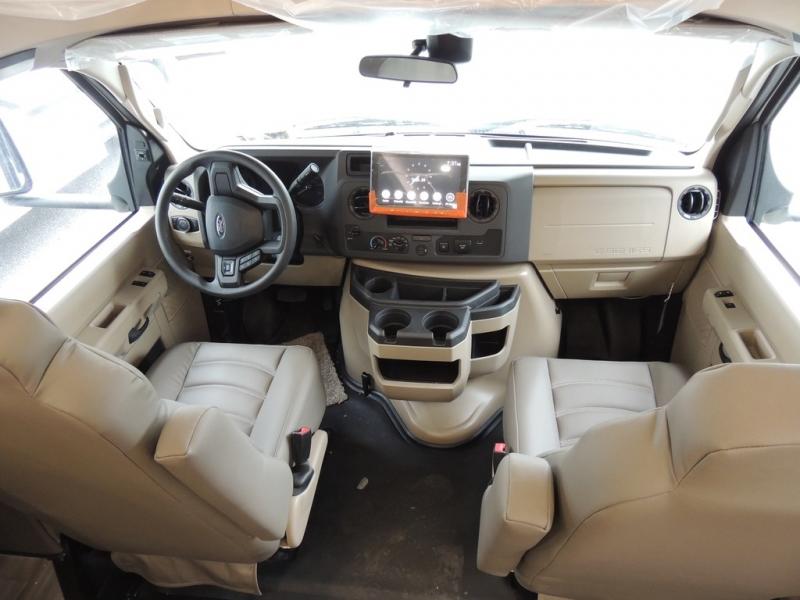 With any Odyssey Class C gas motorhome by Entegra Coach, the driver will appreciate the power from the 325 HP engine, the towing capacity from the 7,500 lb. hitch, the tire pressure monitoring system, the navigation from the Sony infotainment center with Apple CarPlay and Android Auto, plus the backup and side-view cameras when parking and driving down the highway. The kitchen offers full amenities including a recessed stainless steel sink with a cutting board sink cover, LED-lit pressed countertops, a decorative backsplash, and a pop-up charging station with 110 outlet and USB plugs to keep your smart phones charged. Get ready for luxury in a Class C, choose your favorite today!