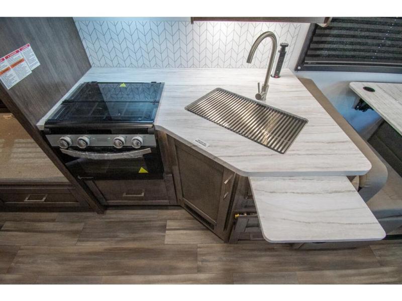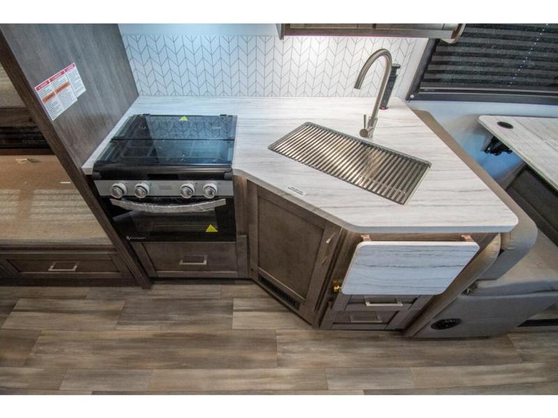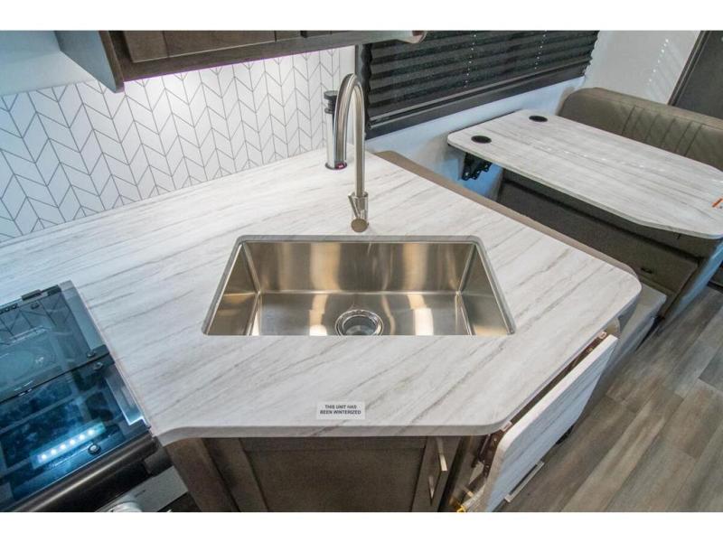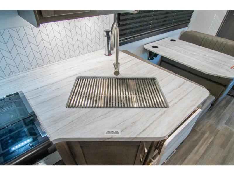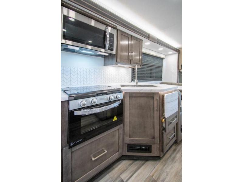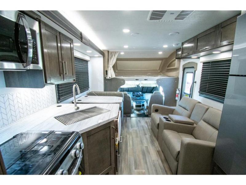 With any Odyssey Class C gas motorhome by Entegra Coach, the driver will appreciate the power from the 325 HP engine, the towing capacity from the 7,500 lb. hitch, the tire pressure monitoring system, the navigation from the Sony infotainment center with Apple CarPlay and Android Auto, plus the backup and side-view cameras when parking and driving down the highway. The kitchen offers full amenities including a recessed stainless steel sink with a cutting board sink cover, LED-lit pressed countertops, a decorative backsplash, and a pop-up charging station with 110 outlet and USB plugs to keep your smart phones charged. Get ready for luxury in a Class C, choose your favorite today!