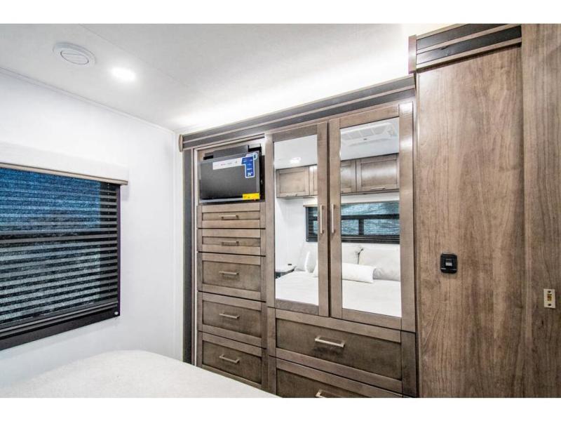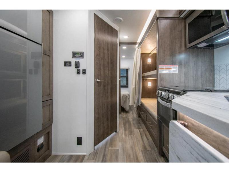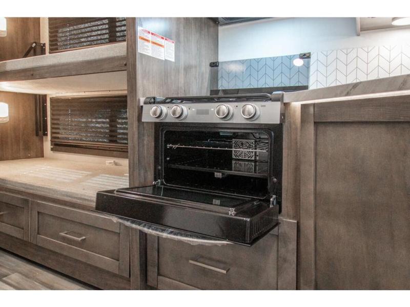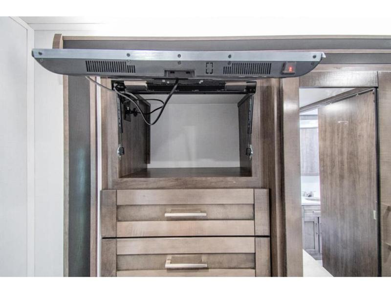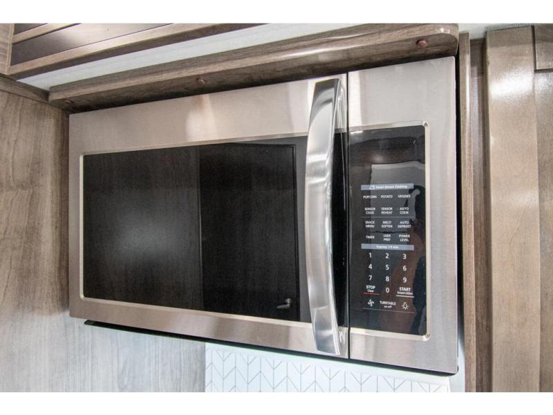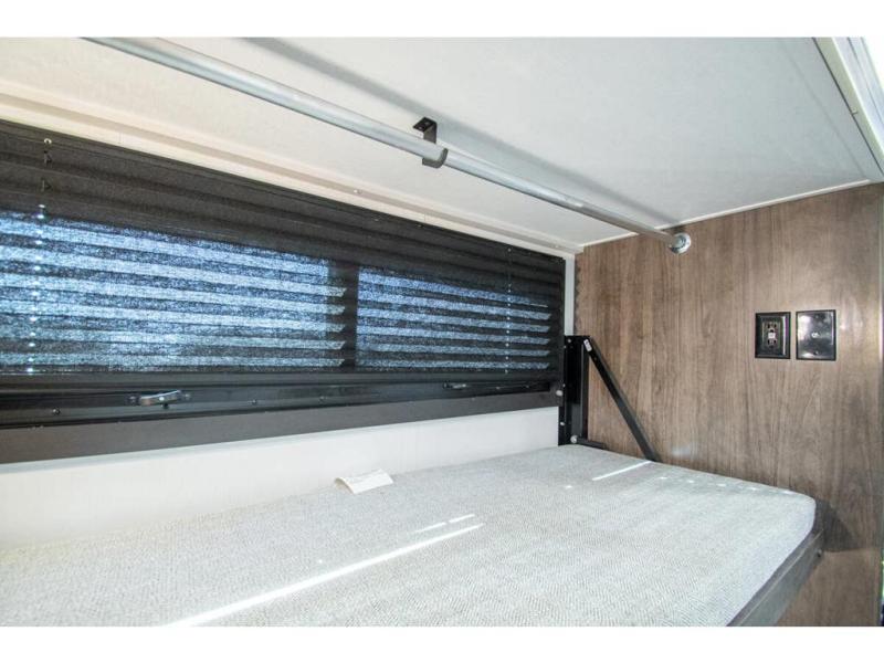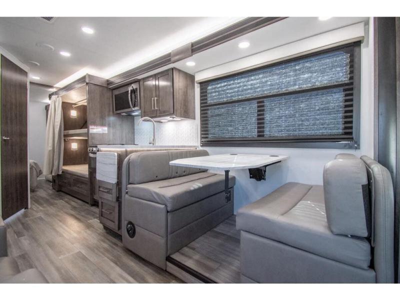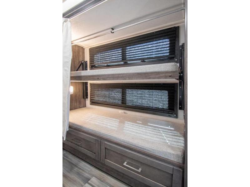 Gather your family and load up for travel games, camping games and all around comfort and luxury! The full-wall slide provides extra floor space from just behind the swivel captains chairs all the way back to the private rear bedroom with a queen bed and clothing storage. The bunk beds are across from the main entry to the bathroom, and your kids or grandkids will love this space as well as the front cab-over bunk. You even have more sleeping space provided by the booth dinette and sofa once easily set up for bedtime. And the cook will have a residential-size microwave, a Furrion all-in-one cooktop and oven, plus an 8 cu. ft. refrigerator to keep everyone fed, and the pantry will hold the snacks. Everyone can also enjoy the 18' electric awning while at the campsite either day or night thanks to the LED lights, and the exterior TV will allow you to watch the big game in the great outdoors.
