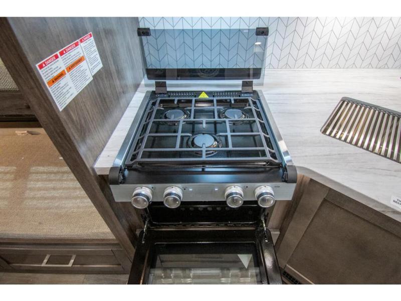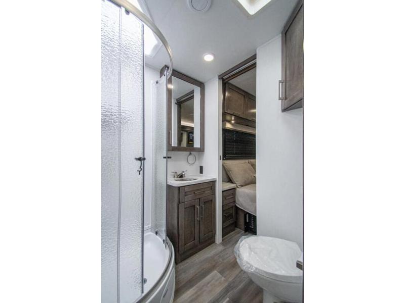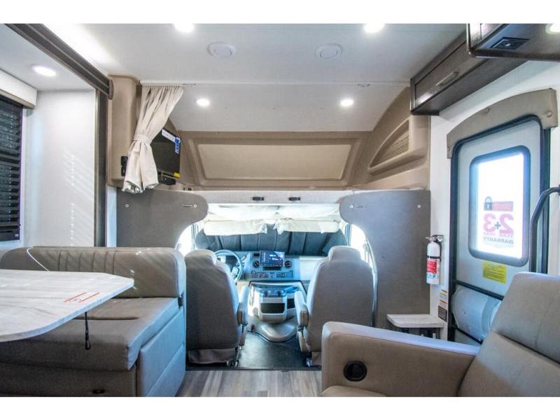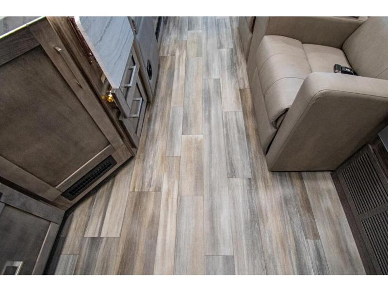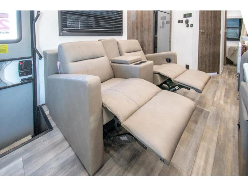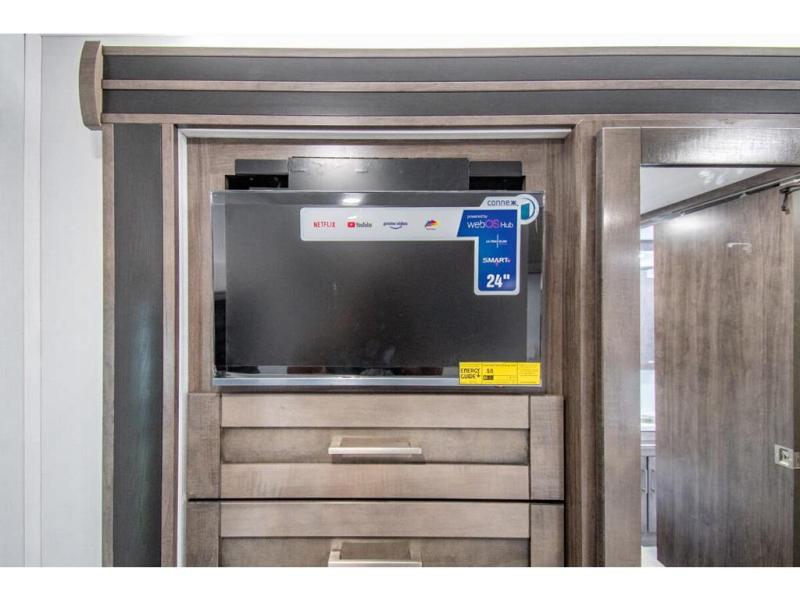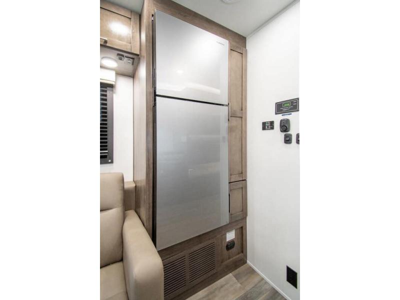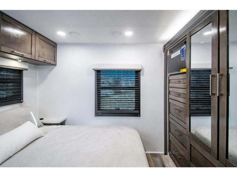 Gather your family and load up for travel games, camping games and all around comfort and luxury! The full-wall slide provides extra floor space from just behind the swivel captains chairs all the way back to the private rear bedroom with a queen bed and clothing storage. The bunk beds are across from the main entry to the bathroom, and your kids or grandkids will love this space as well as the front cab-over bunk. You even have more sleeping space provided by the booth dinette and sofa once easily set up for bedtime. And the cook will have a residential-size microwave, a Furrion all-in-one cooktop and oven, plus an 8 cu. ft. refrigerator to keep everyone fed, and the pantry will hold the snacks. Everyone can also enjoy the 18' electric awning while at the campsite either day or night thanks to the LED lights, and the exterior TV will allow you to watch the big game in the great outdoors.