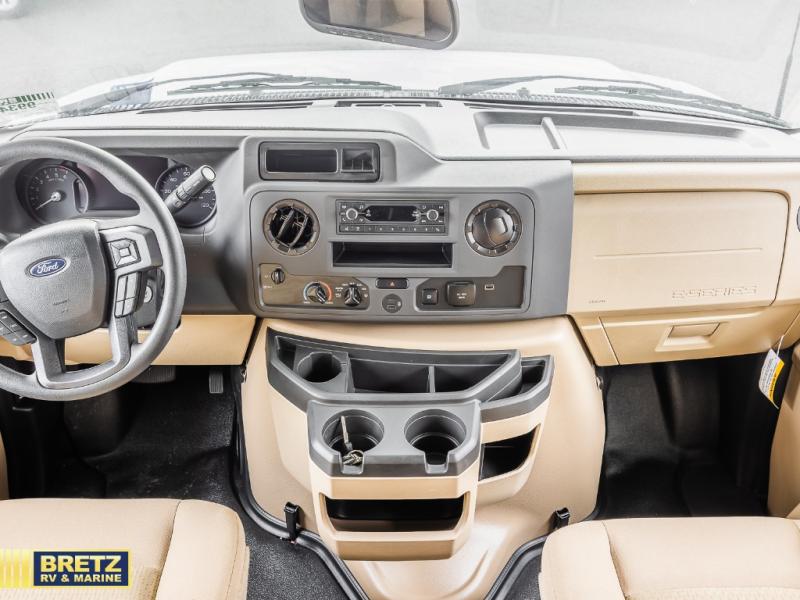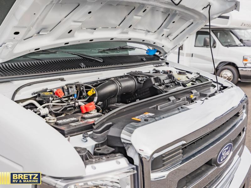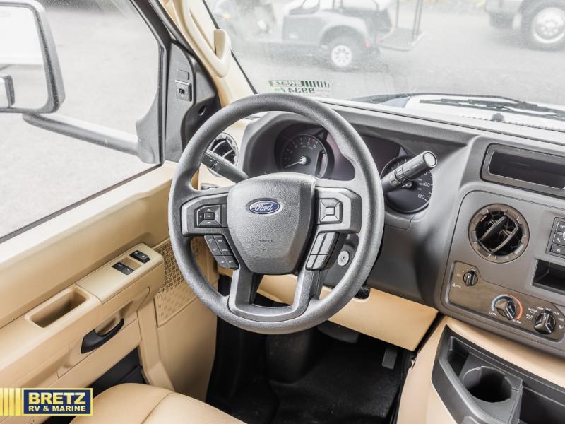 The Odyssey SE Class C gas motorhome by Entegra Coach is constructed with TuffShell vacuum-bond laminated sidewalls, a one-piece, seamless fiberglass front cap, and bead-foam insulation for added durability and strength. Whether you choose a model with a Ford E-350 chassis, Ford E-450 or Chevy 4500 chassis, you will get a durable coach made to last. The driver will also love the power steering, tilt steering wheel, and auxiliary start switch. The 7' interior ceiling height will provide plenty of space to stretch out and the high-intensity, recessed LED lights will make your space feel more like home. All of your power needs will be met with a 4,000-watt generator and 12V house battery, plus there is a 13.5K BTU A/C and 30K BTU furnace to keep you comfortable all year long. There are a couple additions you might want to add to further customize your Odyssey SE, like the optional automatic hydraulic leveling jacks and the optional 200W solar panel for some off-grid camping!