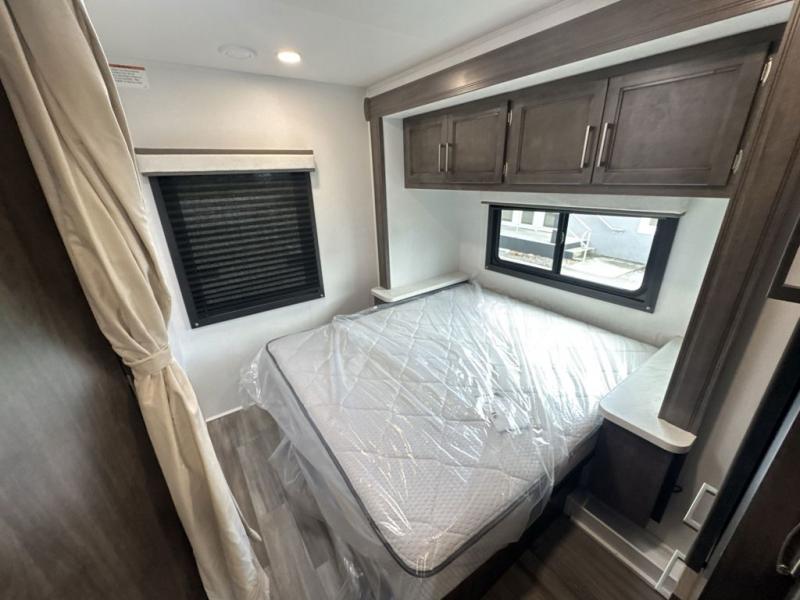 Make your trips complete in this coach that can sleep four to five each night. There is a cab-over bunk with a 750 lb. capacity for guests, and an RV queen bed slide out in the rear corner bedroom. The booth dinette can be used to dine at, play games, and even sleep an additional guest or two little ones. A two-burner cooktop comes standard in the kitchen, along with a convection microwave, a stainless-steel sink, and a 10-cu. ft. refrigerator. You will also appreciate having a full bath on board, and the 13' electric awning outside will provide a place to relax with a cold drink!