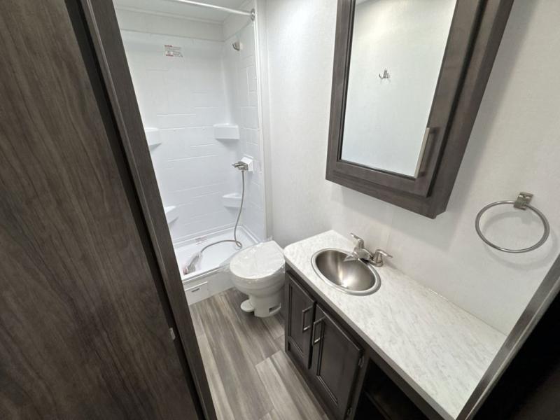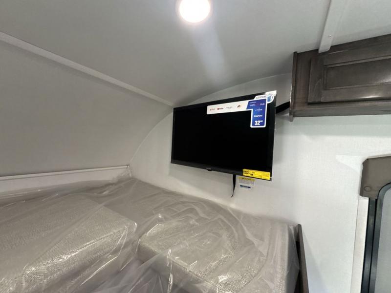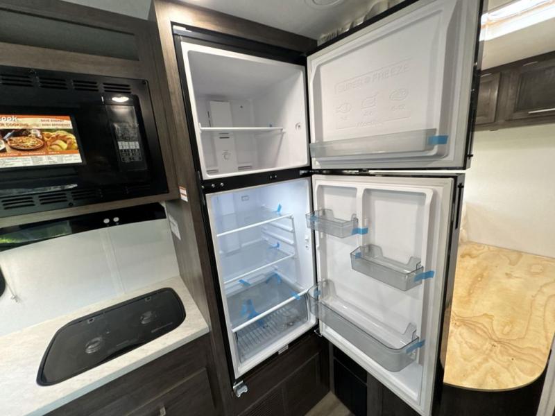 This coach will feel a little more like home with a booth dinette and full bath onboard! You can dine here, play games, and even let guests sleep here. There is additional sleeping space in the cab-over bunk and the rear corner 60" x 74" queen bed. You will find everything you need to cook meals each day, including a two-burner cooktop with a flush cover, a convection microwave, plus a 10-cu. ft. 12V refrigerator to store perishables.
