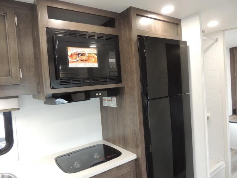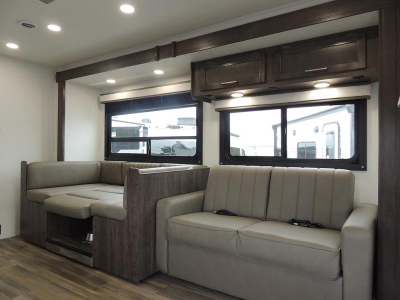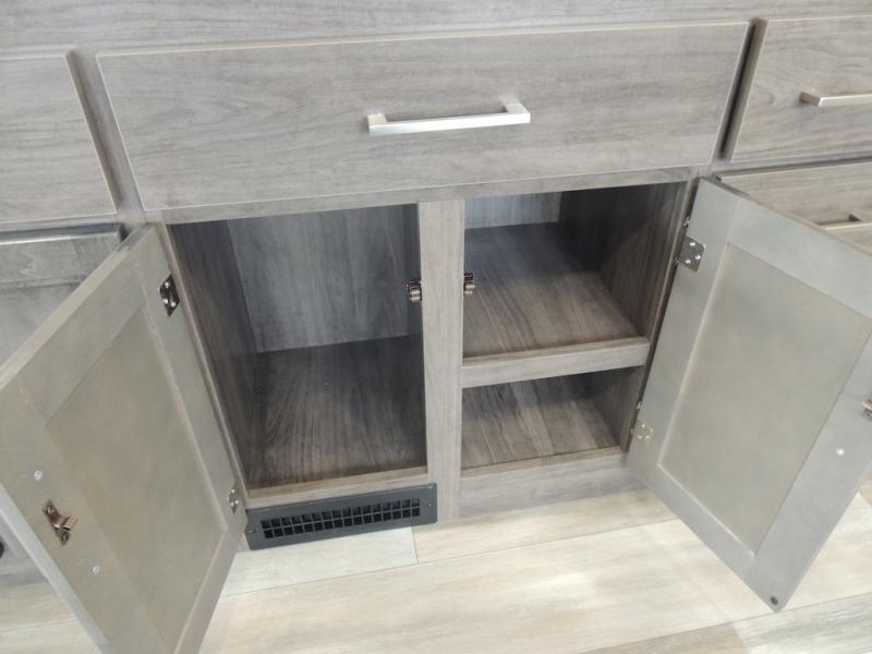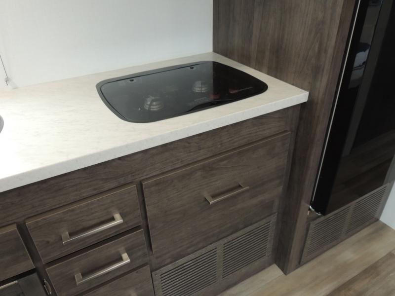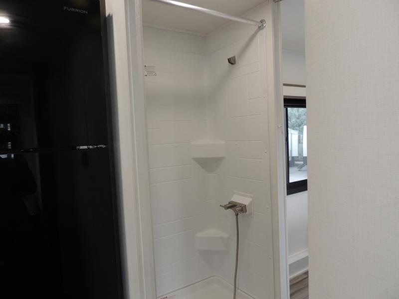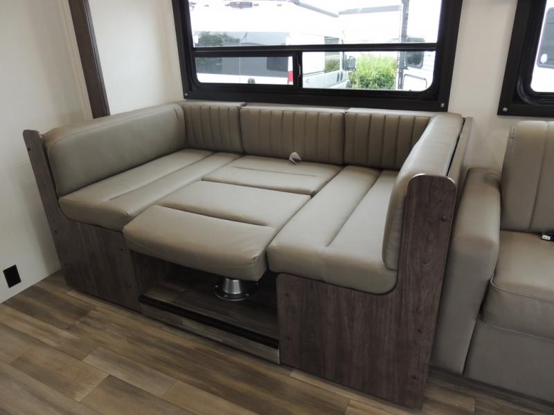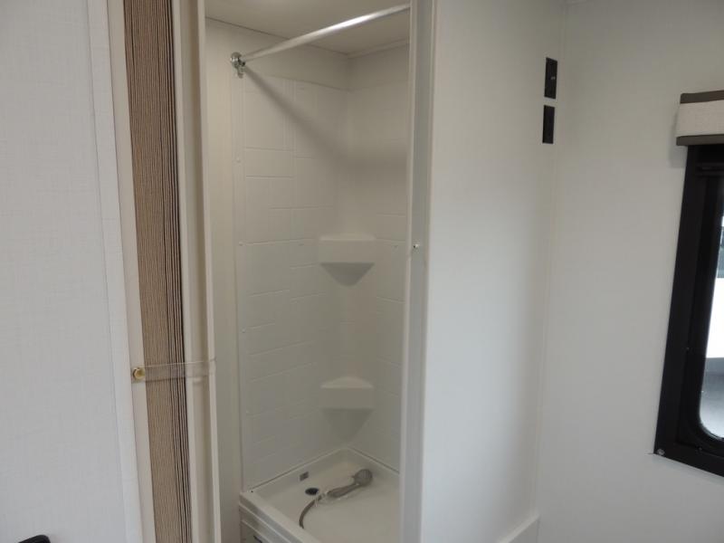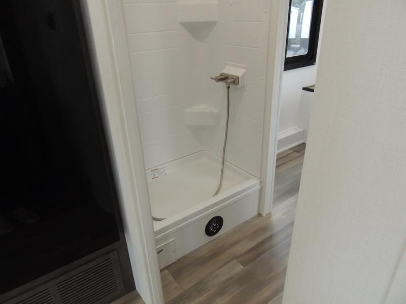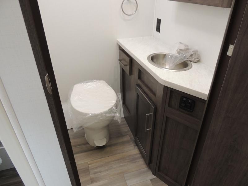 Travel in style in this spacious coach for seven to eight! Once you park at the campsite, you can start lunch on two-burner cooktop or in the convection microwave oven. There is a U-shaped dinette, jack-knife sofa, and cab-over bunk for dining, seating, and sleeping space. You'll find your own space in the rear bedroom with an RV queen bed, large wardrobe, and a privacy curtain. The 24" x 36" independent shower is right across from the private toilet and sink, allowing two people to use this space at once!