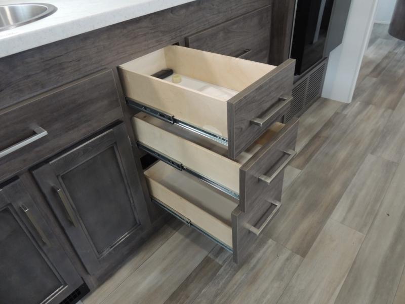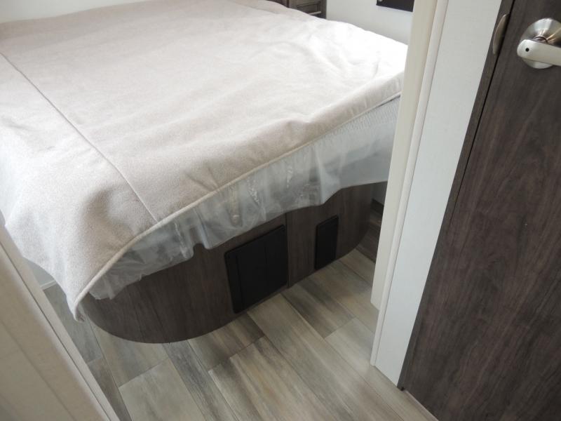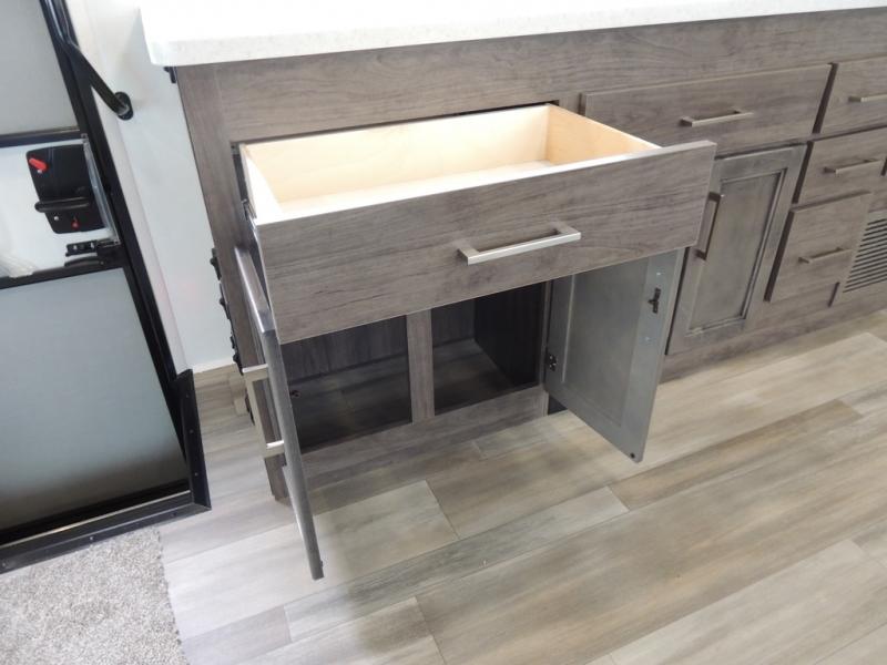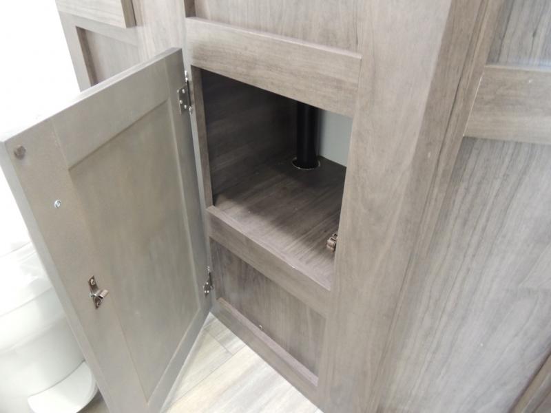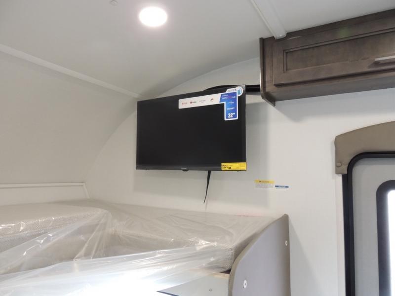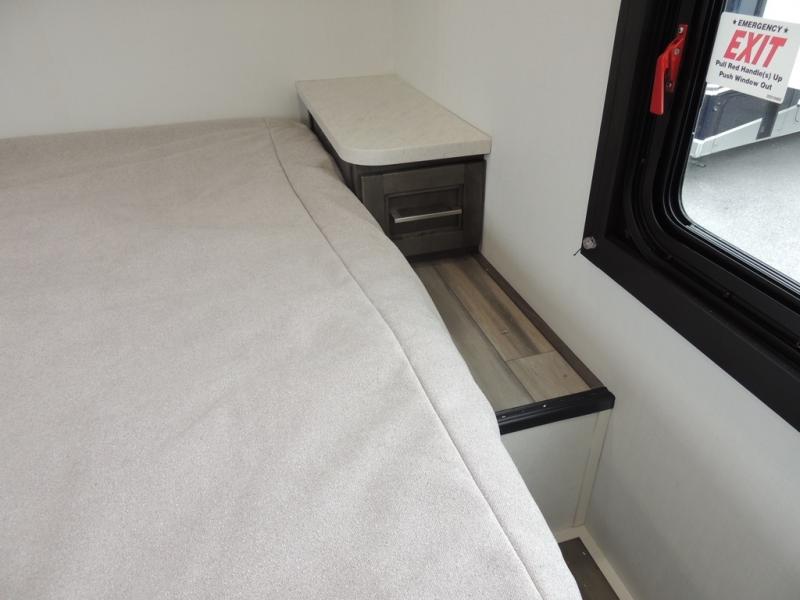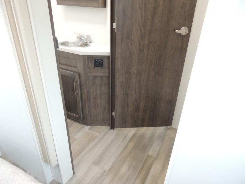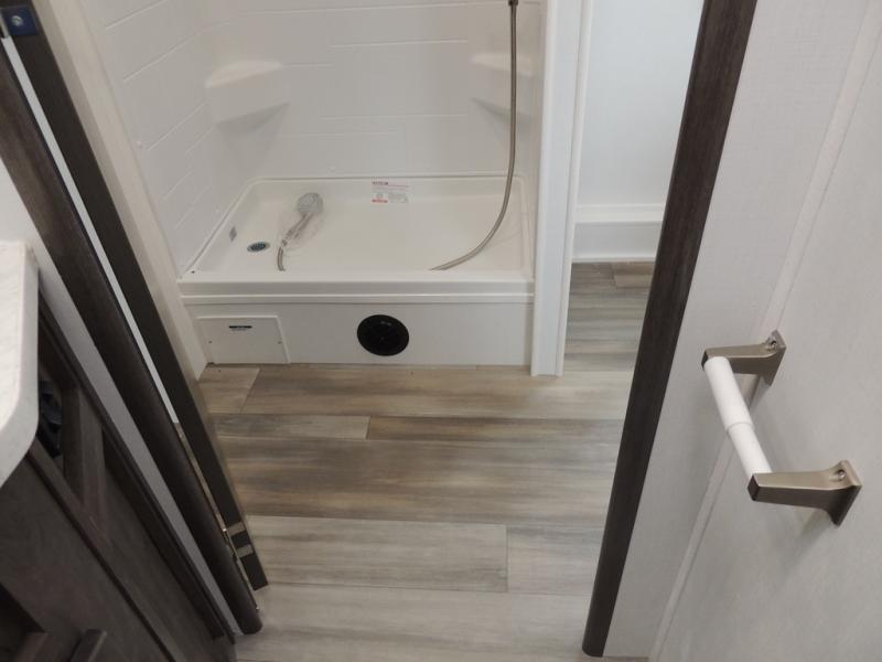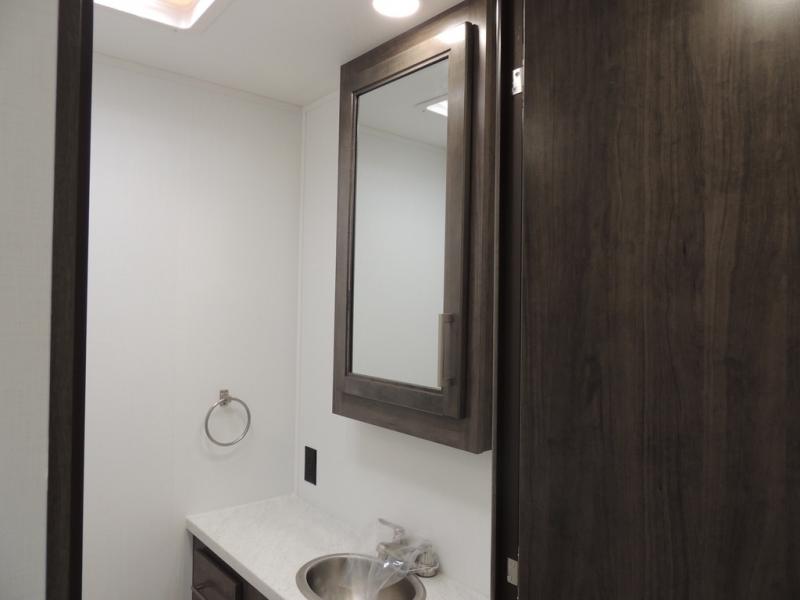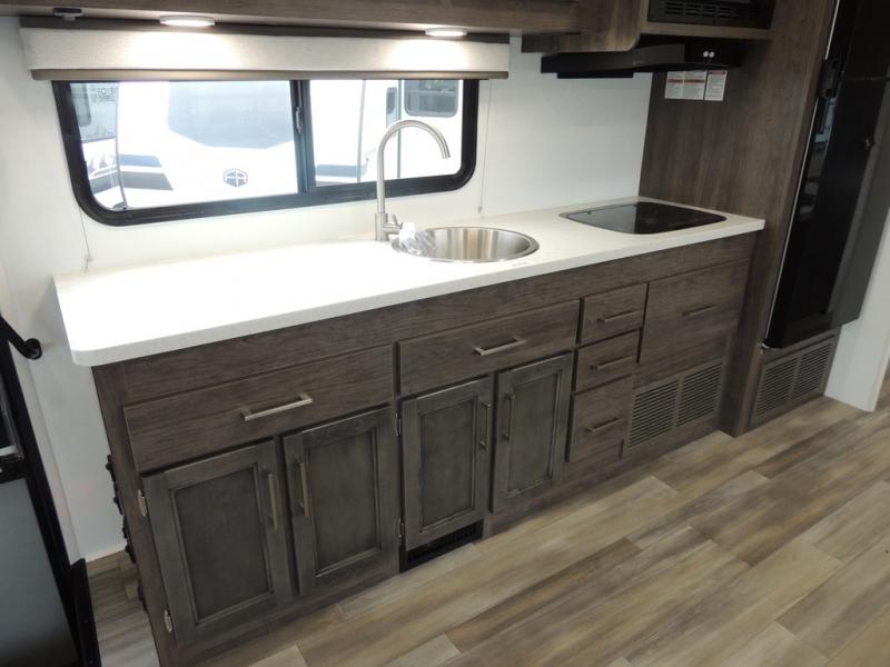 Travel in style in this spacious coach for seven to eight! Once you park at the campsite, you can start lunch on two-burner cooktop or in the convection microwave oven. There is a U-shaped dinette, jack-knife sofa, and cab-over bunk for dining, seating, and sleeping space. You'll find your own space in the rear bedroom with an RV queen bed, large wardrobe, and a privacy curtain. The 24" x 36" independent shower is right across from the private toilet and sink, allowing two people to use this space at once!
