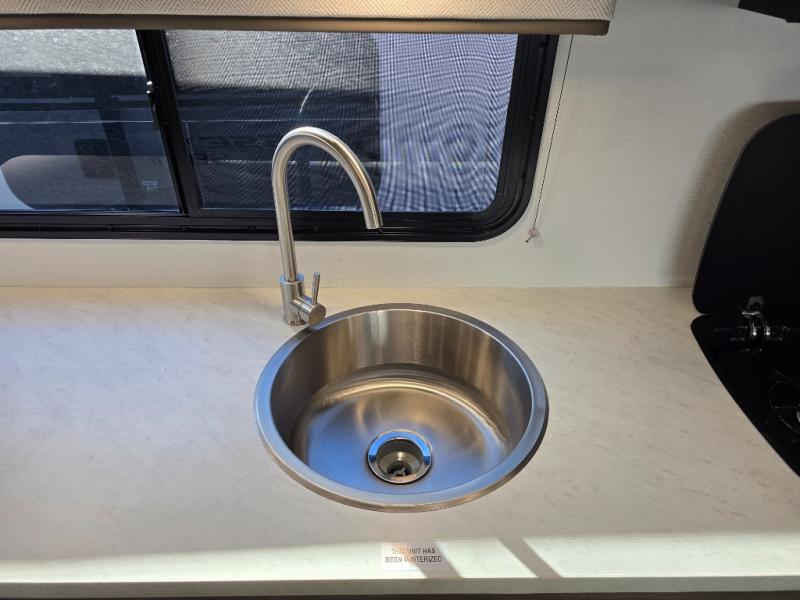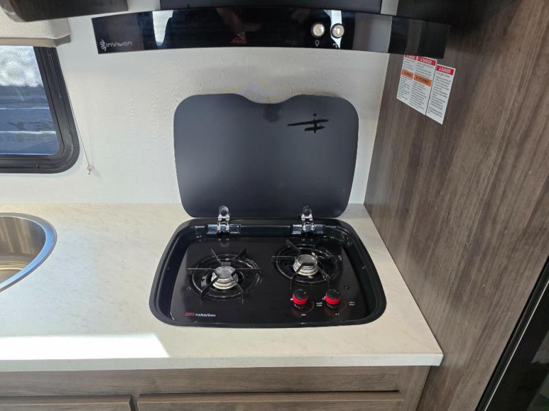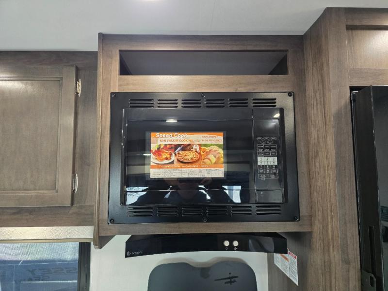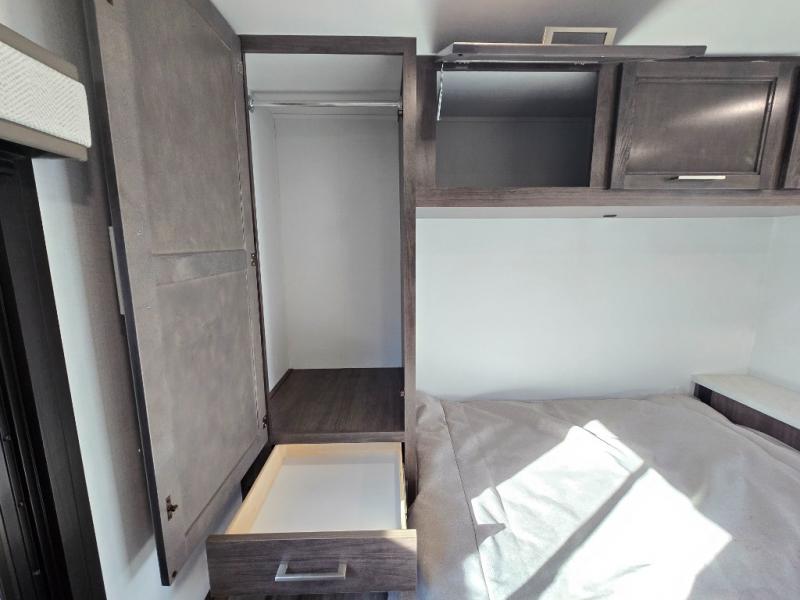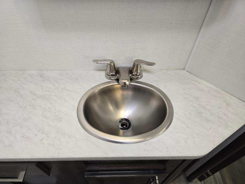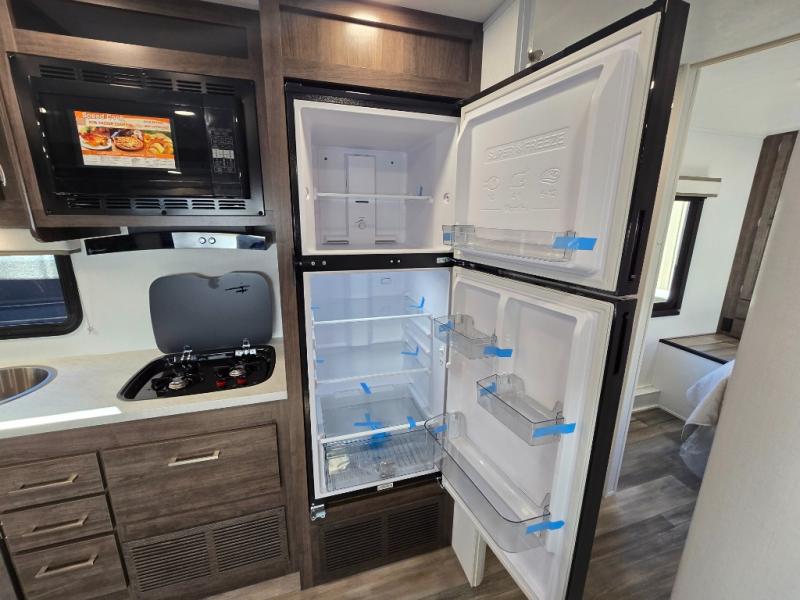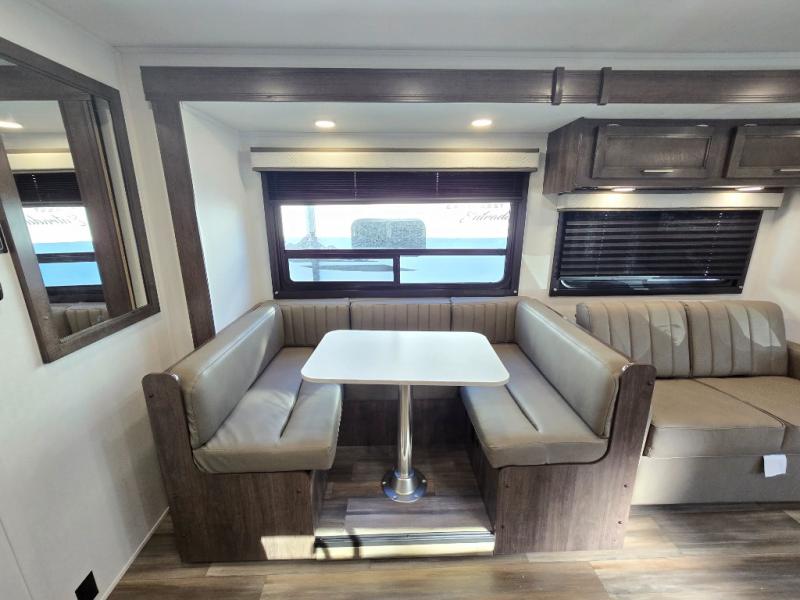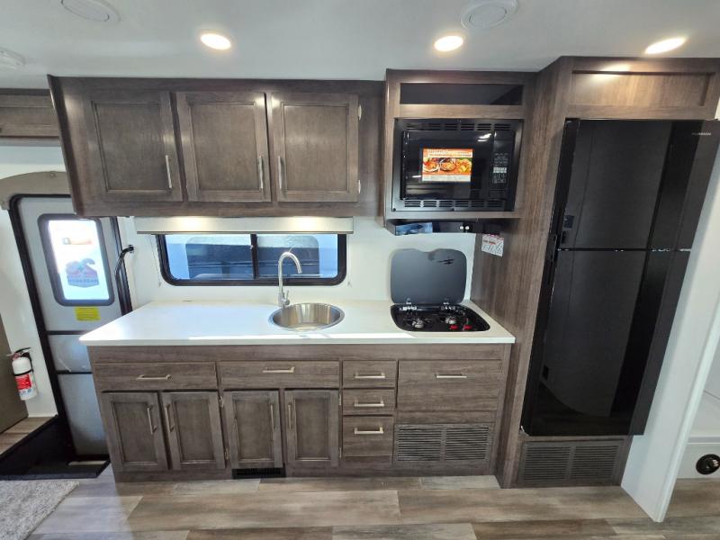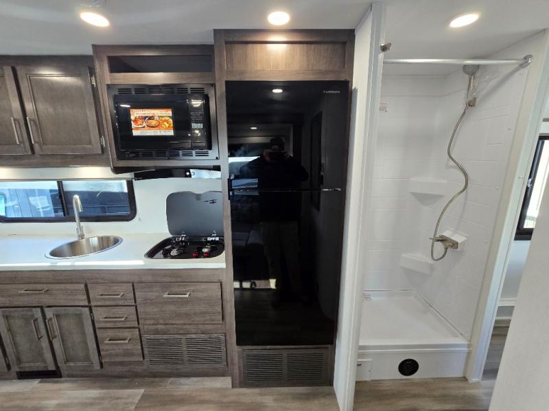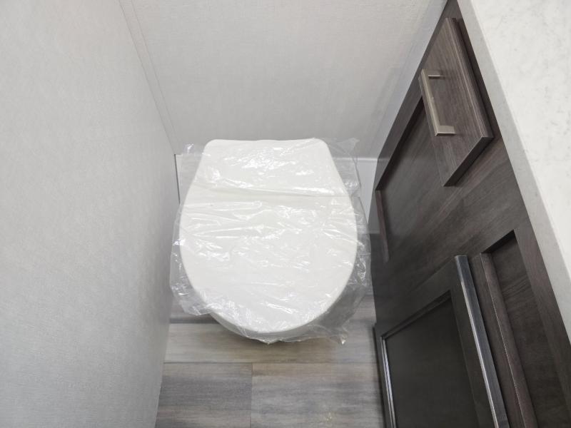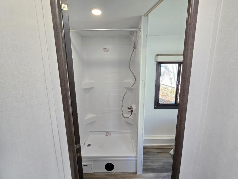 Travel in style in this spacious coach for seven to eight! Once you park at the campsite, you can start lunch on two-burner cooktop or in the convection microwave oven. There is a U-shaped dinette, jack-knife sofa, and cab-over bunk for dining, seating, and sleeping space. You'll find your own space in the rear bedroom with an RV queen bed, large wardrobe, and a privacy curtain. The 24" x 36" independent shower is right across from the private toilet and sink, allowing two people to use this space at once!