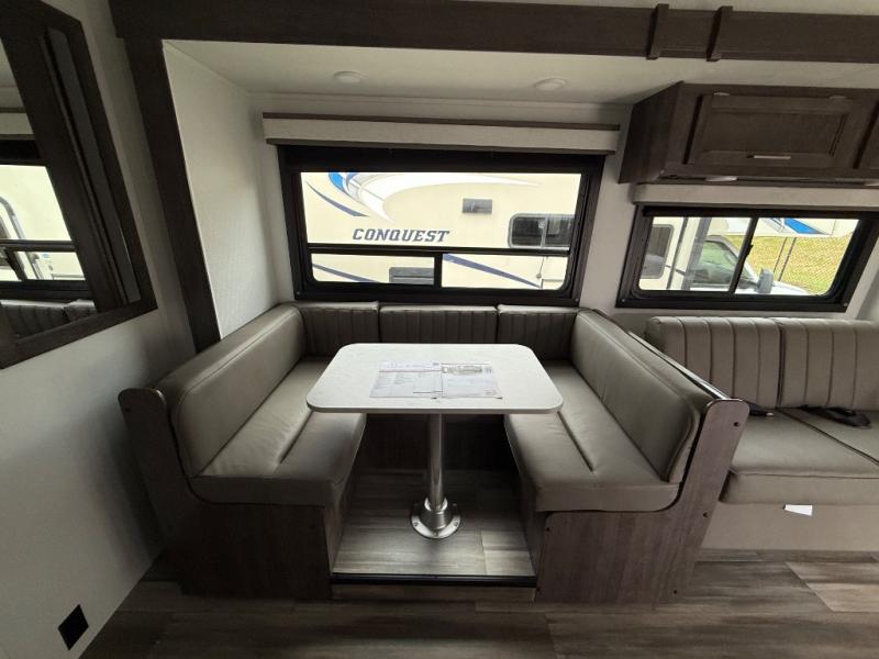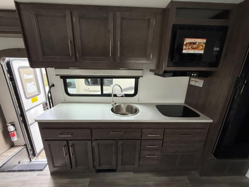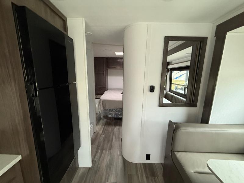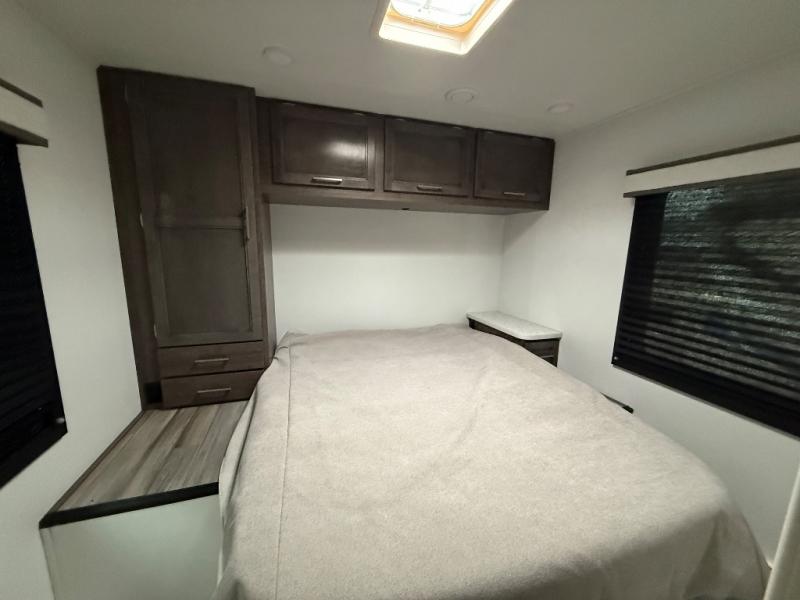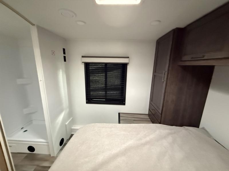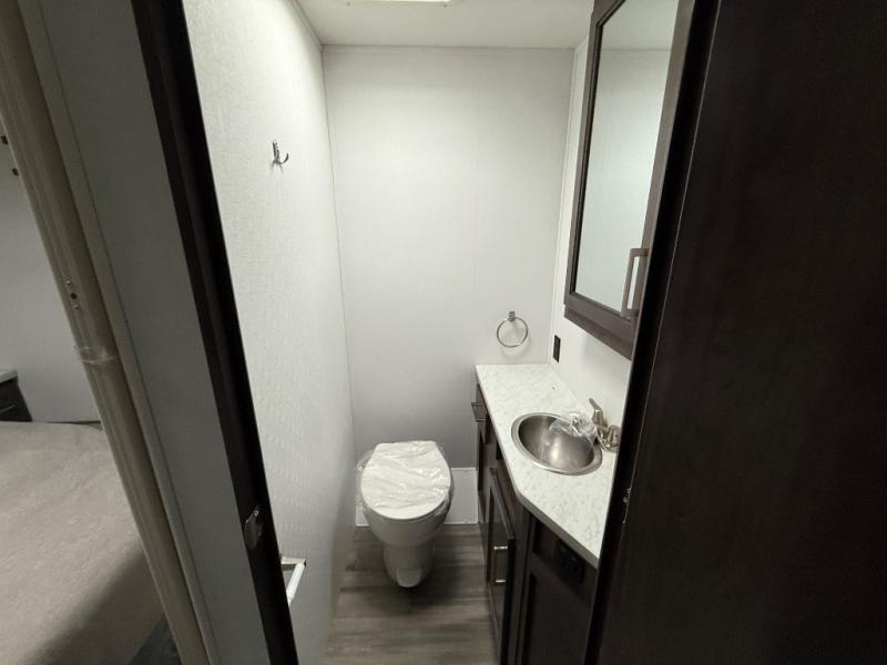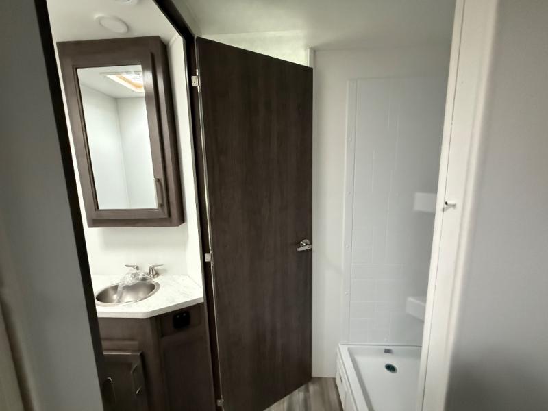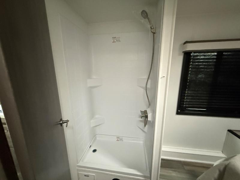 Travel in style in this spacious coach for seven to eight! Once you park at the campsite, you can start lunch on two-burner cooktop or in the convection microwave oven. There is a U-shaped dinette, jack-knife sofa, and cab-over bunk for dining, seating, and sleeping space. You'll find your own space in the rear bedroom with an RV queen bed, large wardrobe, and a privacy curtain. The 24" x 36" independent shower is right across from the private toilet and sink, allowing two people to use this space at once!