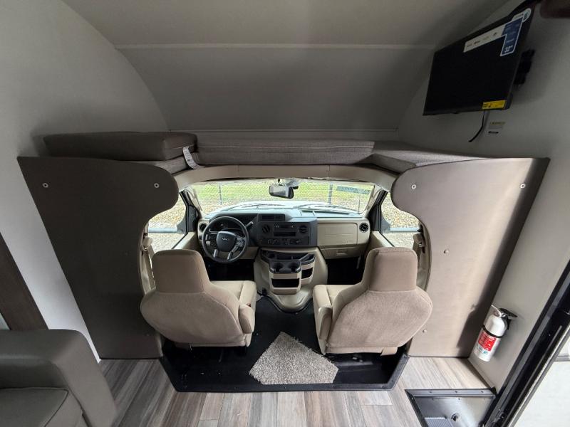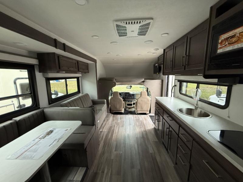 The Odyssey SE Class C gas motorhome by Entegra Coach is constructed with TuffShell vacuum-bond laminated sidewalls, a one-piece, seamless fiberglass front cap, and bead-foam insulation for added durability and strength. Whether you choose a model with a Ford E-350 chassis, Ford E-450 or Chevy 4500 chassis, you will get a durable coach made to last. The driver will also love the power steering, tilt steering wheel, and auxiliary start switch. The 7' interior ceiling height will provide plenty of space to stretch out and the high-intensity, recessed LED lights will make your space feel more like home. All of your power needs will be met with a 4,000-watt generator and 12V house battery, plus there is a 13.5K BTU A/C and 30K BTU furnace to keep you comfortable all year long. There are a couple additions you might want to add to further customize your Odyssey SE, like the optional automatic hydraulic leveling jacks and the optional 200W solar panel for some off-grid camping!
