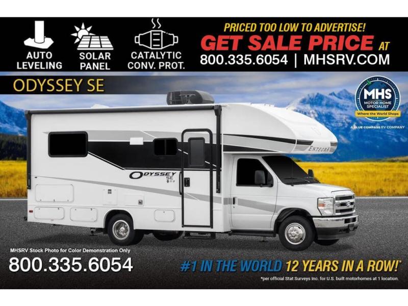 The Odyssey SE Class C gas motorhome by Entegra Coach is constructed with TuffShell vacuum-bond laminated sidewalls, a one-piece, seamless fiberglass front cap, and bead-foam insulation for added durability and strength. Whether you choose a model with a Ford E-350 chassis, Ford E-450 or Chevy 4500 chassis, you will get a durable coach made to last. The driver will also love the power steering, tilt steering wheel, and auxiliary start switch. The 7' interior ceiling height will provide plenty of space to stretch out and the high-intensity, recessed LED lights will make your space feel more like home. All of your power needs will be met with a 4,000-watt generator and 12V house battery, plus there is a 13.5K BTU A/C and 30K BTU furnace to keep you comfortable all year long. There are a couple additions you might want to add to further customize your Odyssey SE, like the optional automatic hydraulic leveling jacks and the optional 200W solar panel for some off-grid camping!
