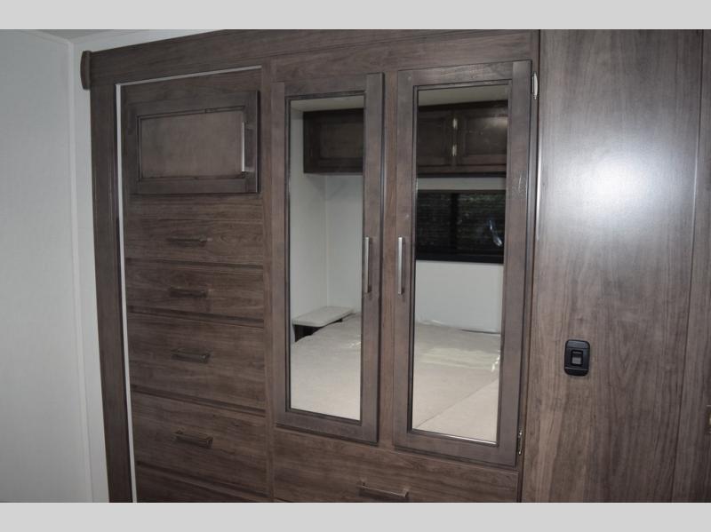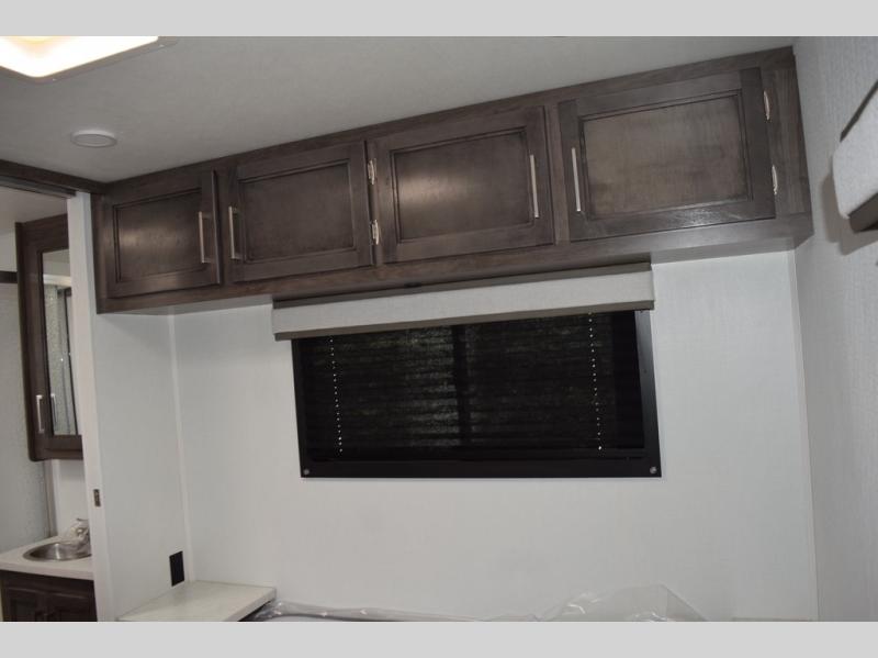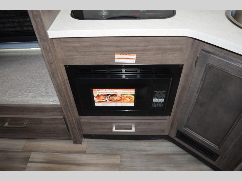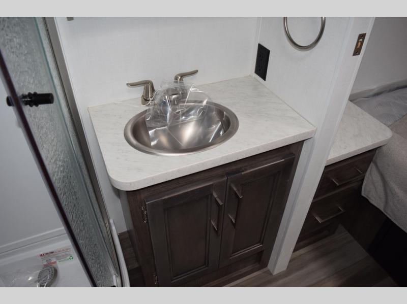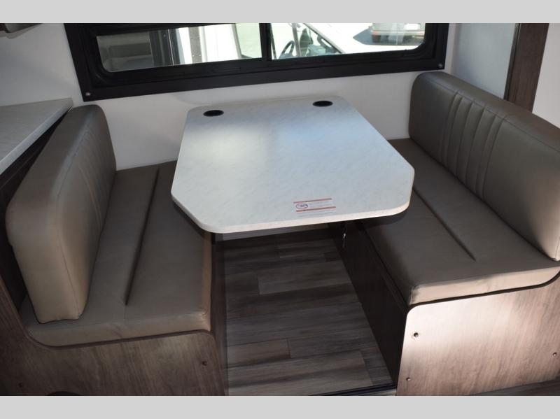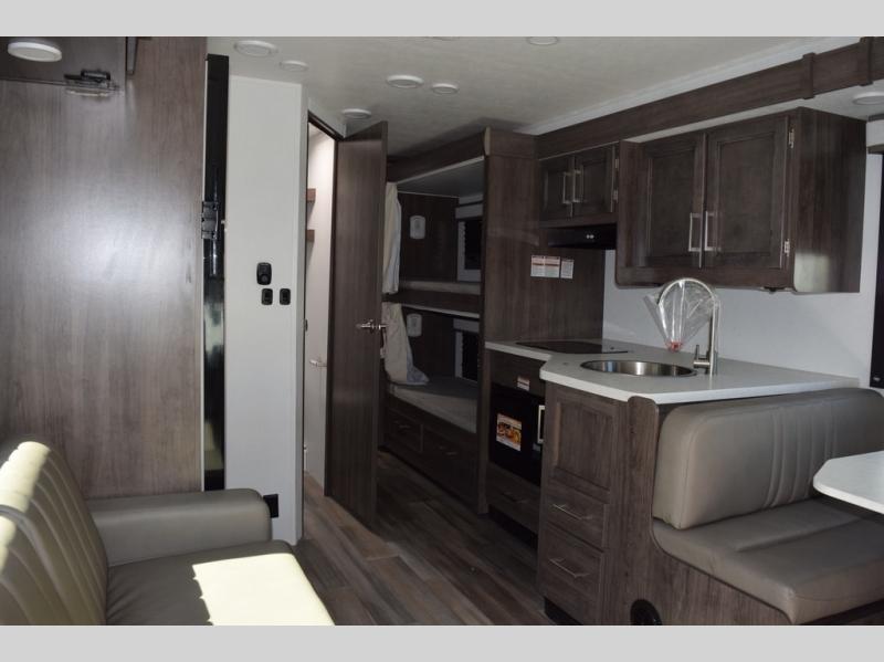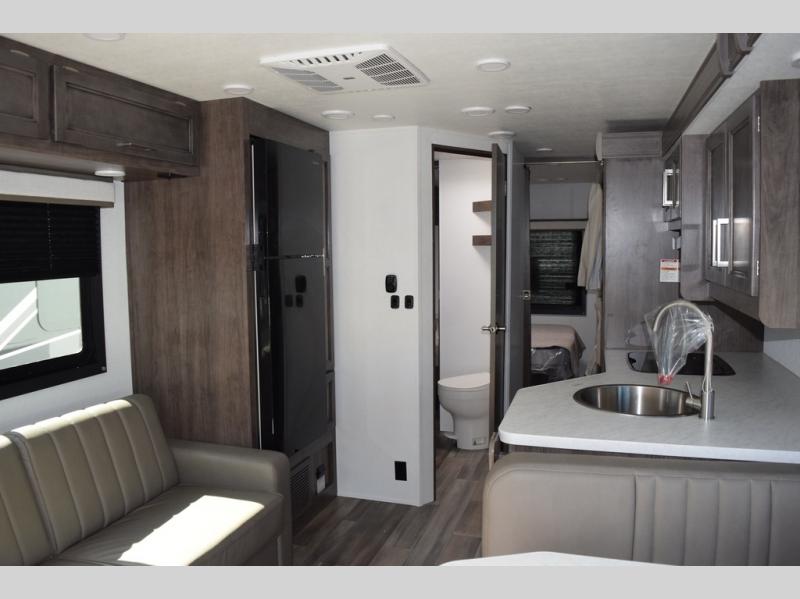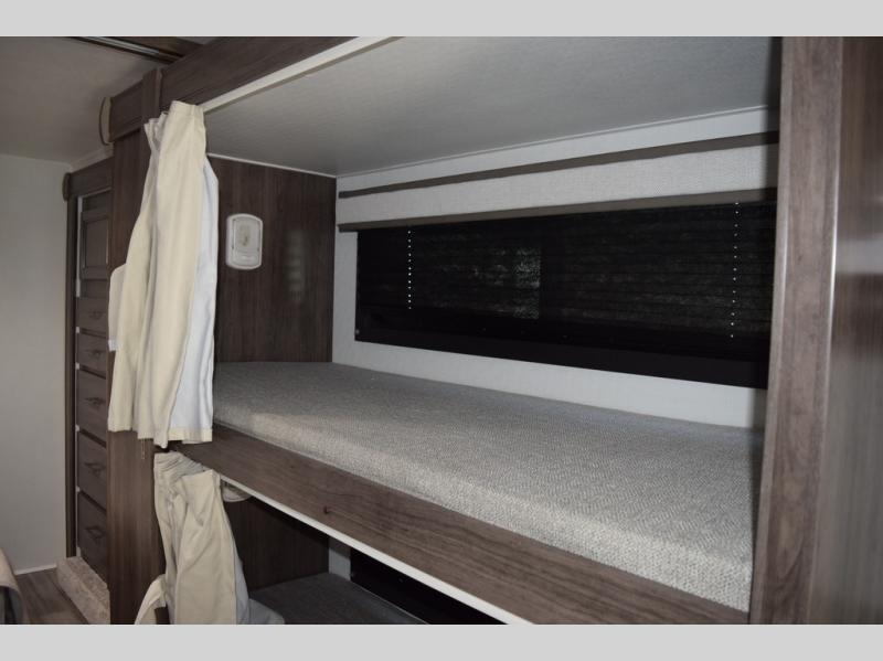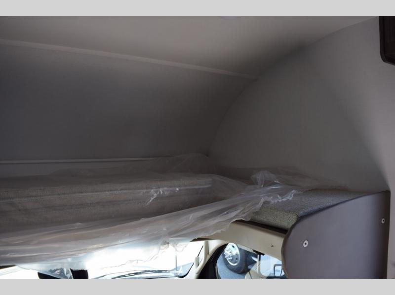 The whole family will love traveling in this motorhome! The kiddos will get a good night's rest on the set of 28" x 72" bunk beds, and you will get a good night's rest on the 60" x 74" queen bed in the rear private bedroom. You even have access to the dual entry bathroom which has a 32" radius shower to freshen up in each morning. Head to the kitchen where you can prepare your best home cooked meals on the two burner cooktop, keep your perishables fresh in the 10 cu. ft. refrigerator, and enjoy your delicious meals at the 42" x 70" booth dinette. Relax on the 68" tri-fold sofa after a fun day at the beach, and also turn it into an extra sleeping space, plus there is a cab over bunk for a friend or two to tag along!