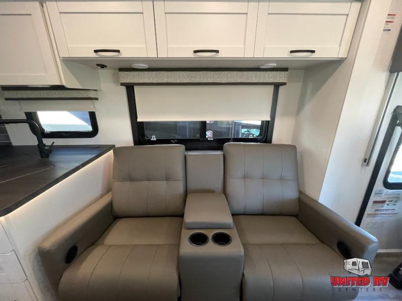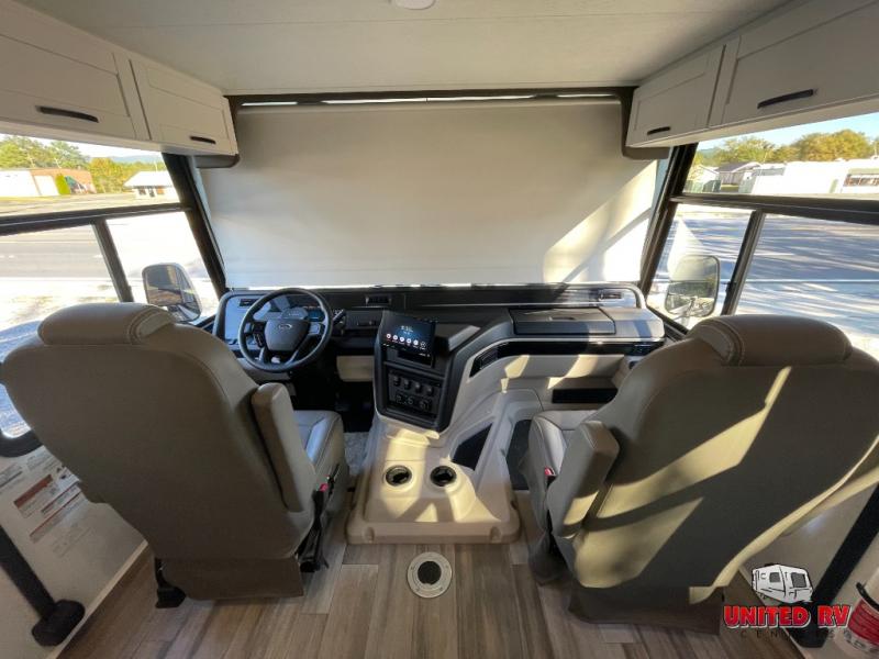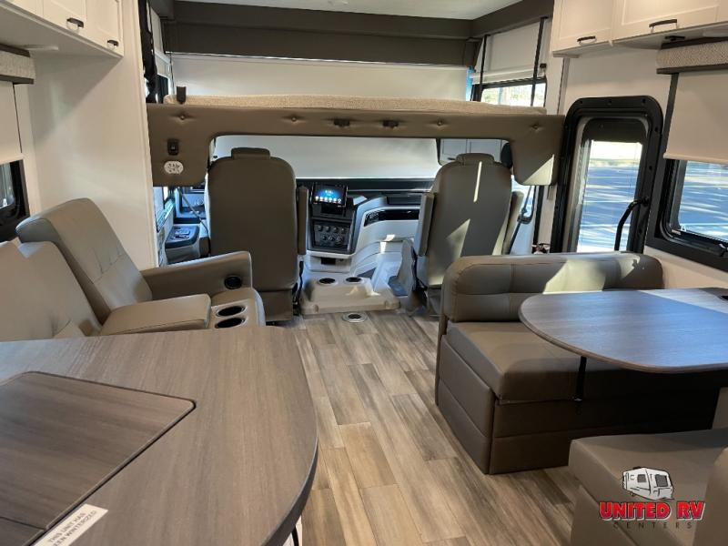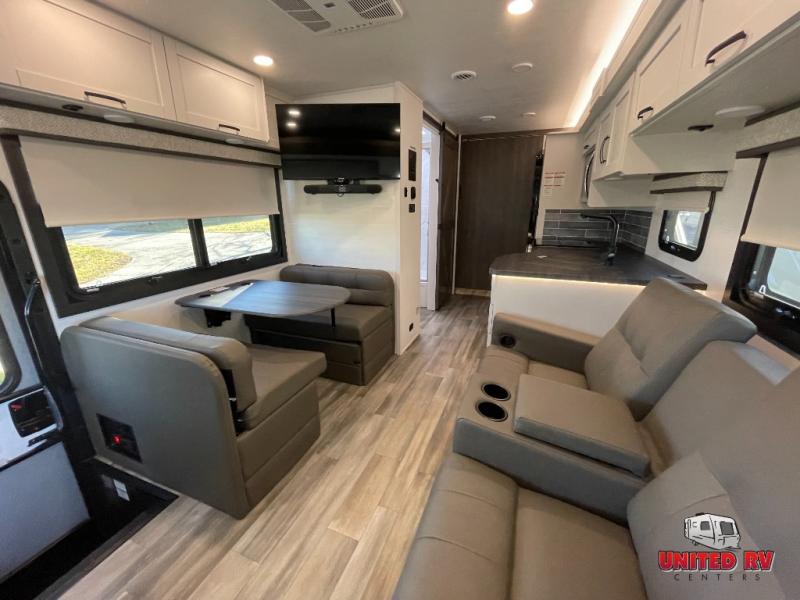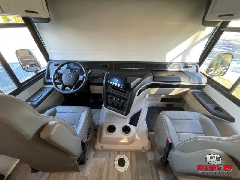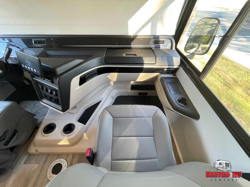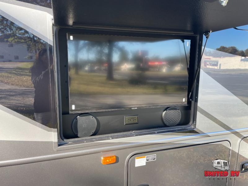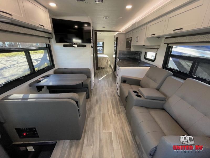This Vision Class A gas motorhome has excellent interior living space with a full-wall slide! You'll fully enjoy the kitchen and the amenities it provides, like a residential-size microwave, a 10 cu. ft. 12V refrigerator, a Furrion all-in-one cooktop and oven, and a pantry. The 68" jack-knife sofa and booth dinette offer you lounging space after a full day of traveling, and the 39" LED HD Smart TV offers you some entertainment when you don't want to be active anymore. The exterior portion of this coach is also excellently appointed with an outdoor kitchen, exterior entertainment center with LED HD Smart TV, radio, and speakers, and a 23' electric awning with LED lights. You also have great choices of options for this coach with the optional theater seating, LED HDTV in the bedroom, or drop-down overhead cab bunk.