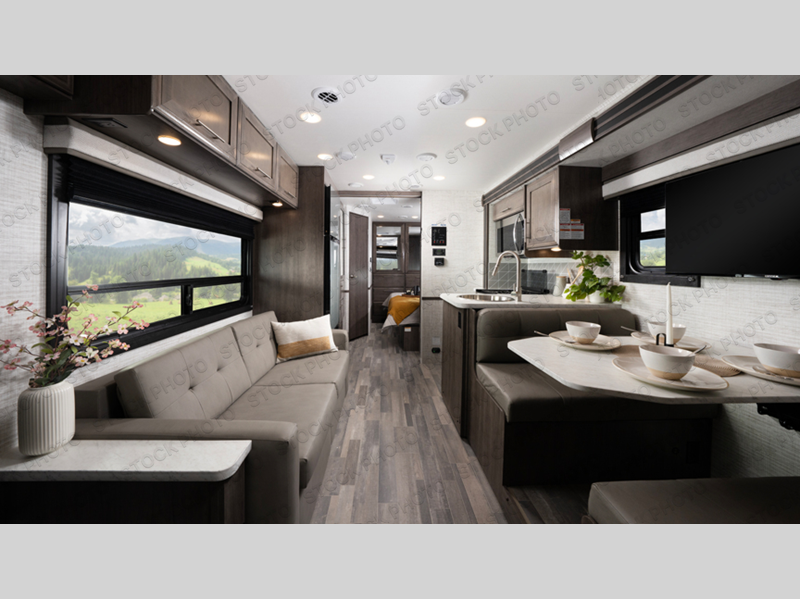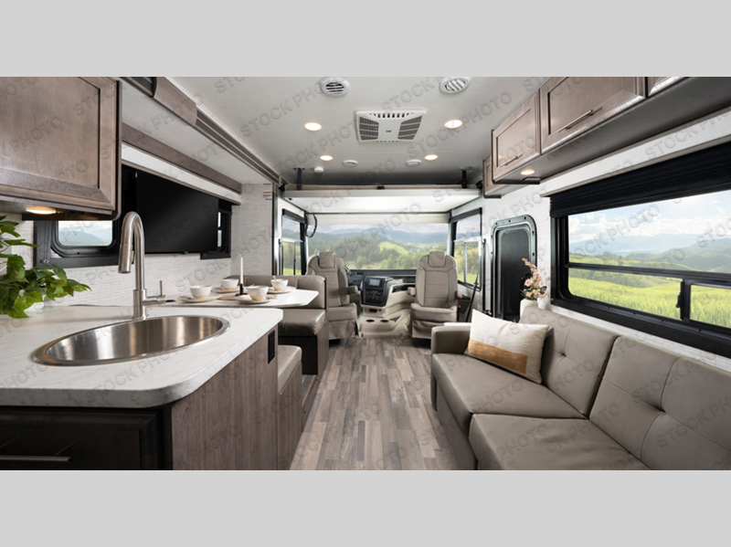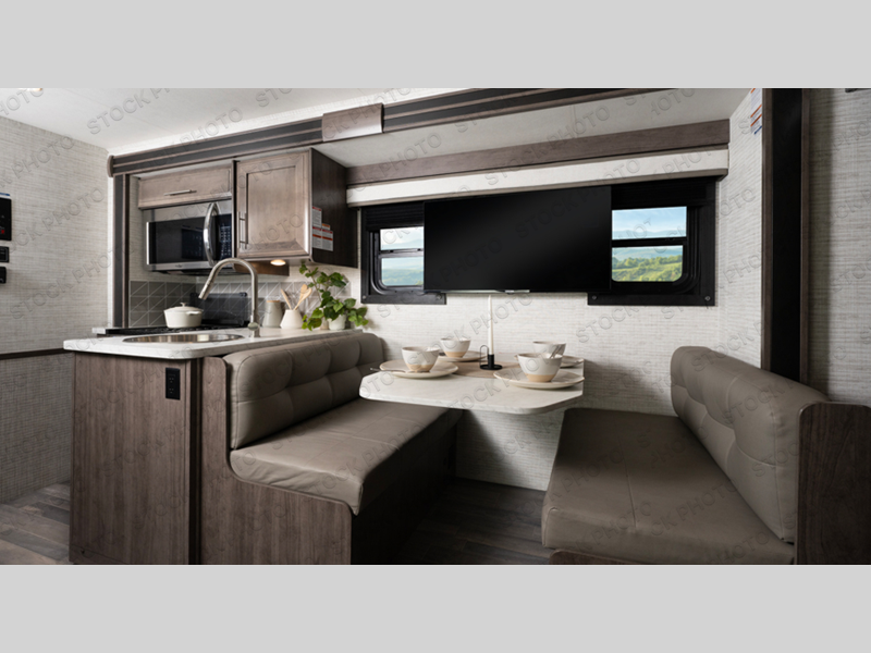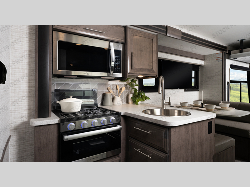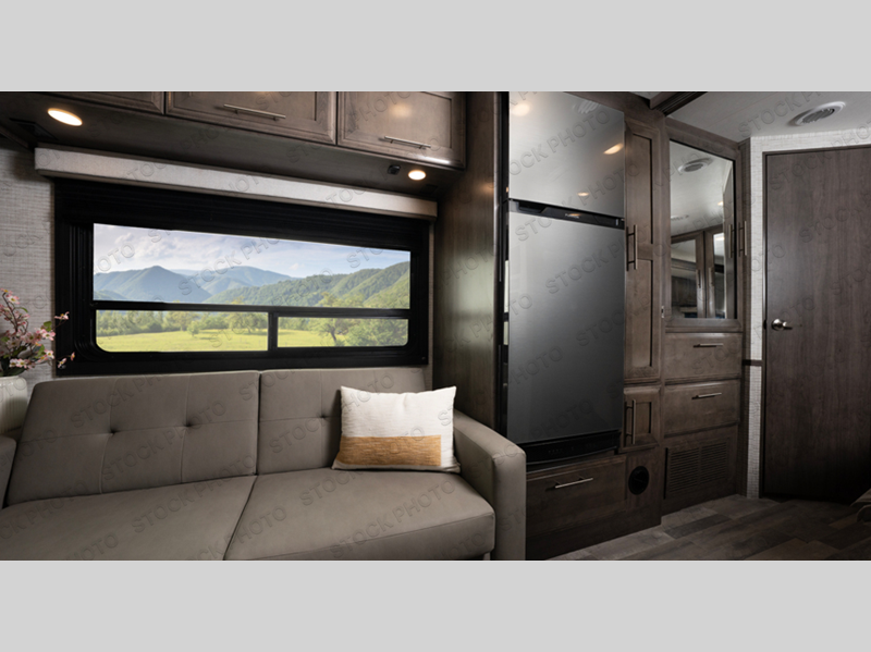 This coach is perfect for your crew of four to five, with the ability to sleep more if you choose the optional drop-down overhead bunk. Once you've arrived at your destination, the swivel captain's seats can be turned around to face the main living area so you can visit with those on the jack-knife sofa and booth dinette. A full kitchen, including a two burner cooktop and convection microwave oven will let you make meals each day, and the 10 cu. ft. 12V refrigerator will keep your food fresh. You'll love having your own space in the rear corner private bedroom that includes a king bed slide out and a spacious wardrobe. And you'll find the full bath in the other rear corner for quick and easy access at night!