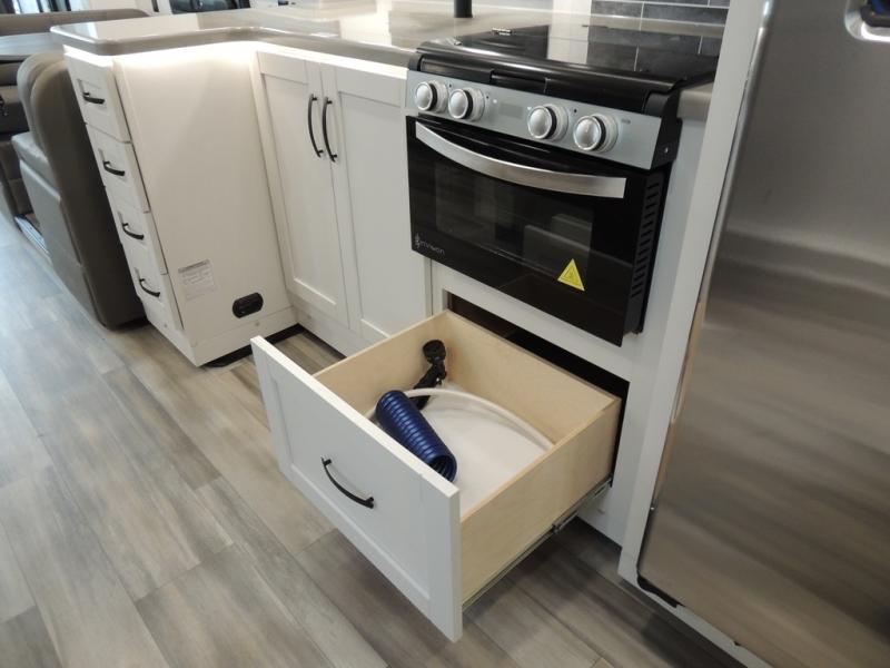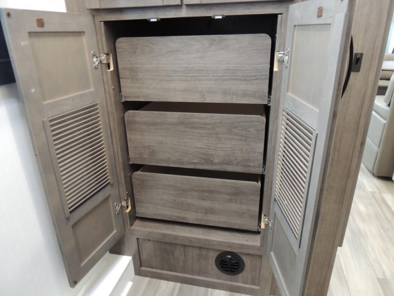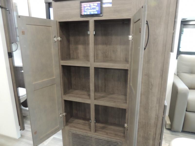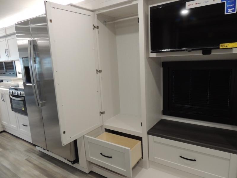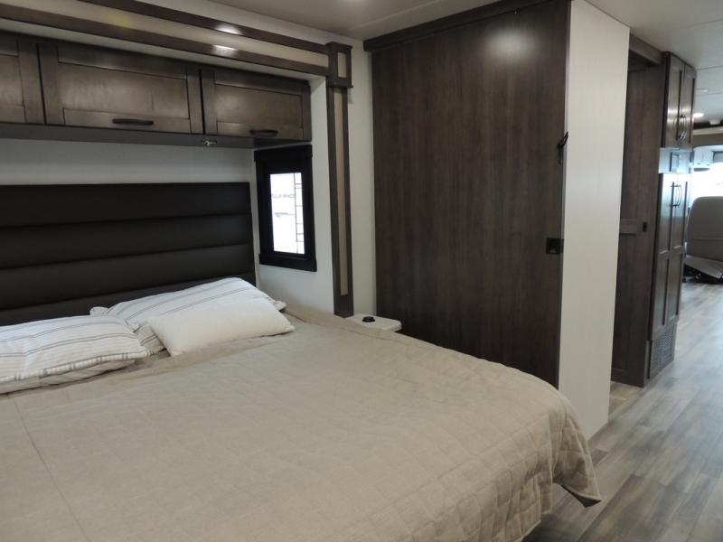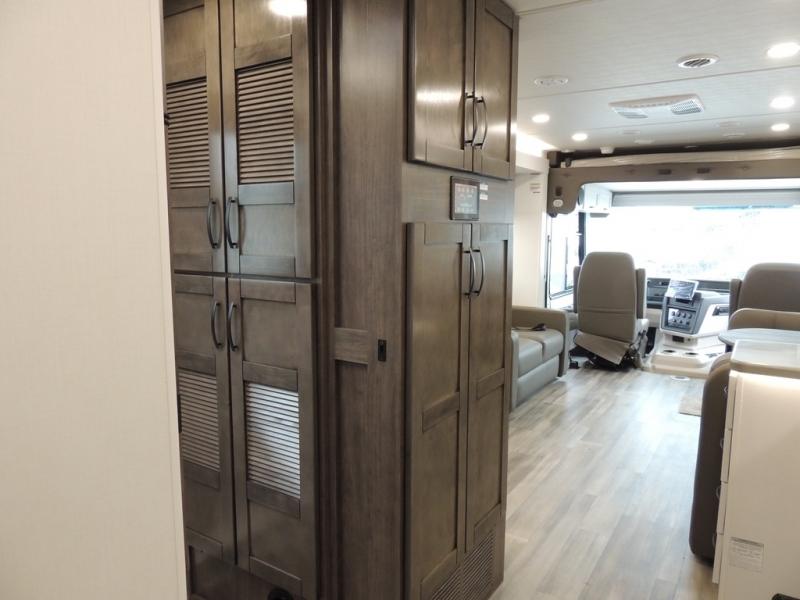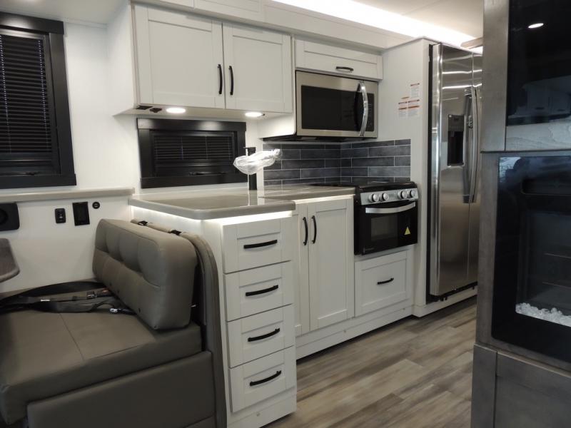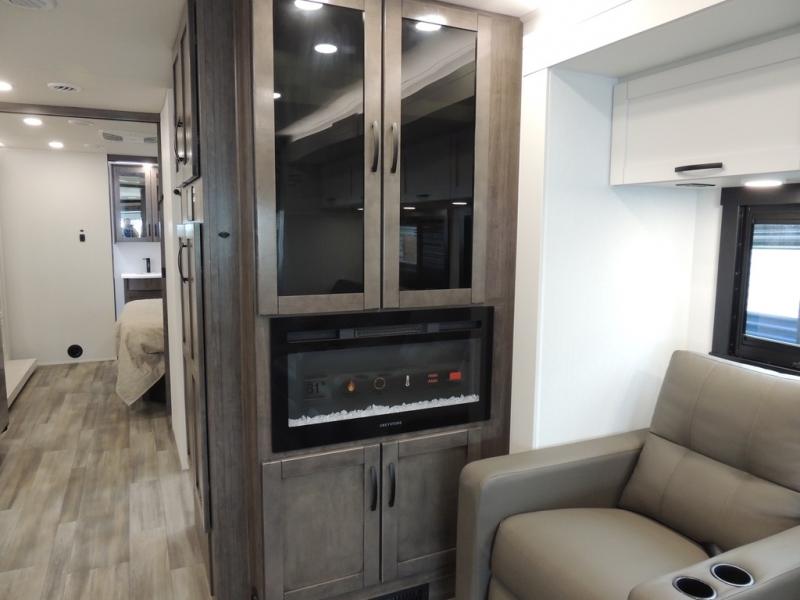 Picture yourself sitting in one of the swivel cab seats with your favorite beverage resting on the removable cockpit table in this Vision XL Class A gas motorhome! When you enter this coach, you will be greeted with a warm and comfortable living environment that has a theater sofa, hide-a-bed sofa, and 38" x 70" booth dinette for lounging, and the fireplace and 50" LED HD Smart TV will add to the coziness. For storing your favorite foods, you can use the residential refrigerator and pantry, and your dishes can be kept in the hutch or overhead cabinets. Conveniently located across from the kitchen is the half bathroom which has an area prepped for an optional washer/dryer, and the walk-around king-size bed in the master suite creates an exceptionally comfortable space to spend your nights.