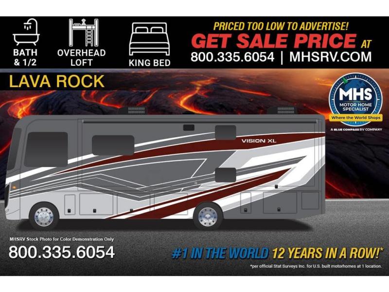 Picture yourself sitting in one of the swivel cab seats with your favorite beverage resting on the removable cockpit table in this Vision XL Class A gas motorhome! When you enter this coach, you will be greeted with a warm and comfortable living environment that has a theater sofa, hide-a-bed sofa, and 38" x 70" booth dinette for lounging, and the fireplace and 50" LED HD Smart TV will add to the coziness. For storing your favorite foods, you can use the residential refrigerator and pantry, and your dishes can be kept in the hutch or overhead cabinets. Conveniently located across from the kitchen is the half bathroom which has an area prepped for an optional washer/dryer, and the walk-around king-size bed in the master suite creates an exceptionally comfortable space to spend your nights.