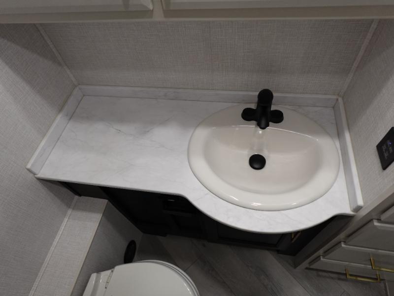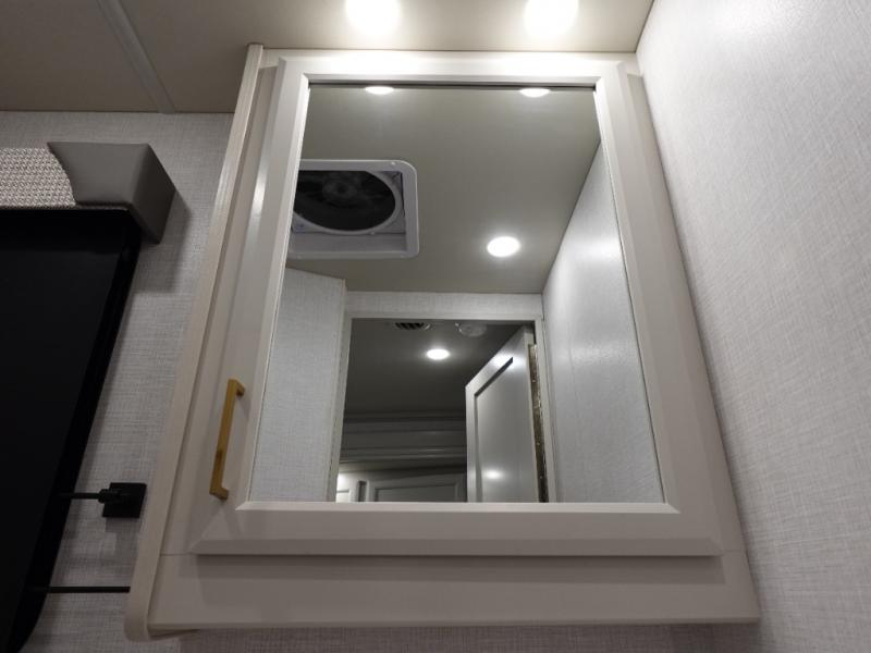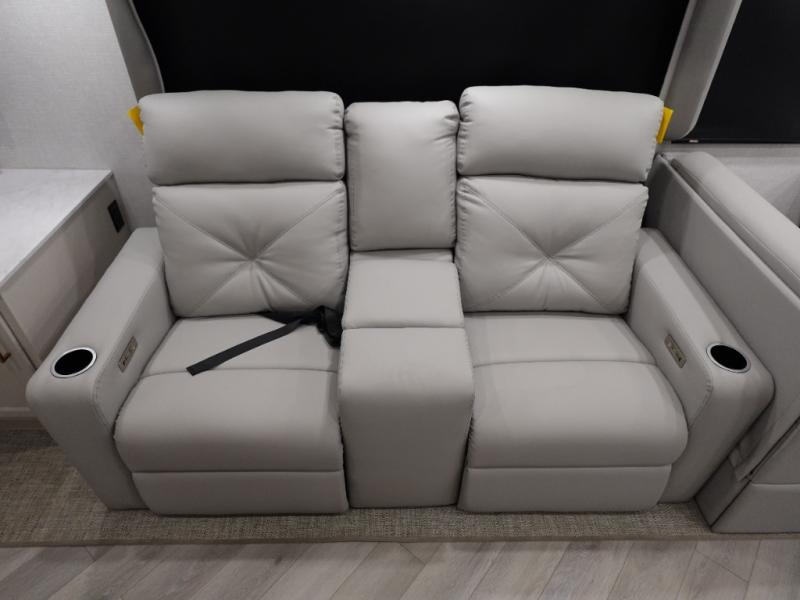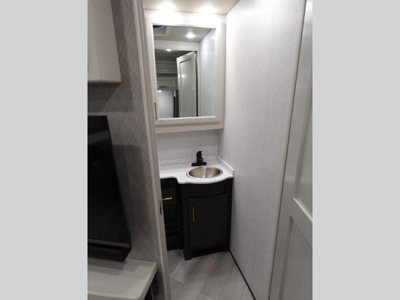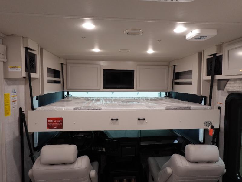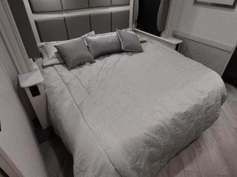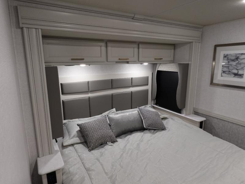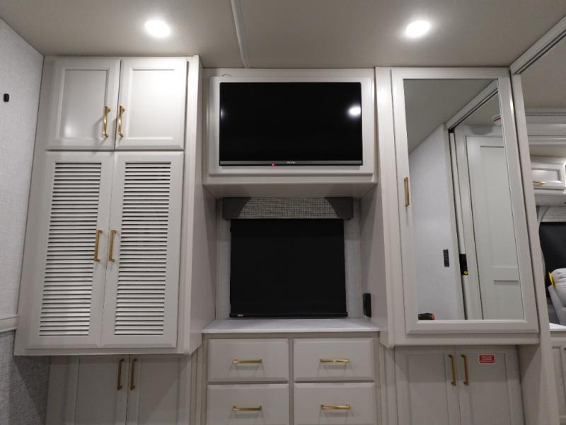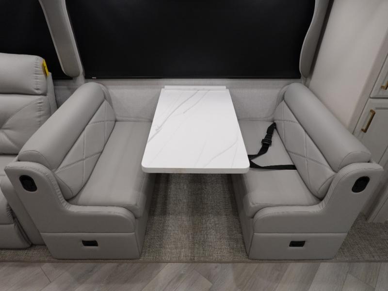 When you are ready to travel the countryside, this coach will get you there in comfort with luxury and residential features that you deserve. The driver and passenger will love the automotive style dash with color monitor and workstation, plus the pedestal table in between. Once you have setup for the evening, you might enjoy reclining back in the chairs or sitting on the theater seats, along with the rest EZ dinette and the Hide-A-Loft power overhead bunk. Your guests can use the mid-coach half bath while you have your own master suite with a king bed slide and storage, plus a full rear bathroom all to yourself.