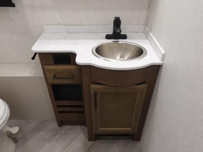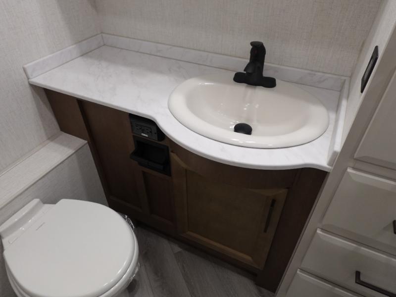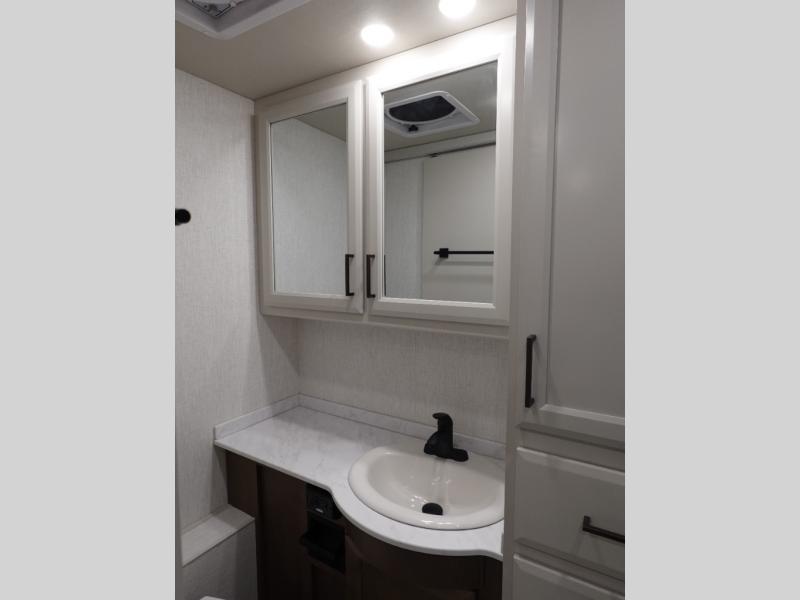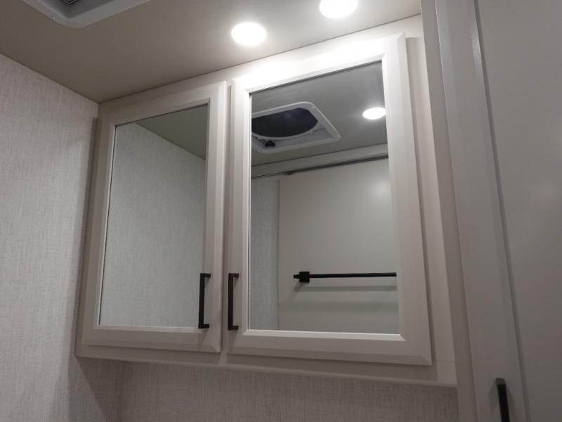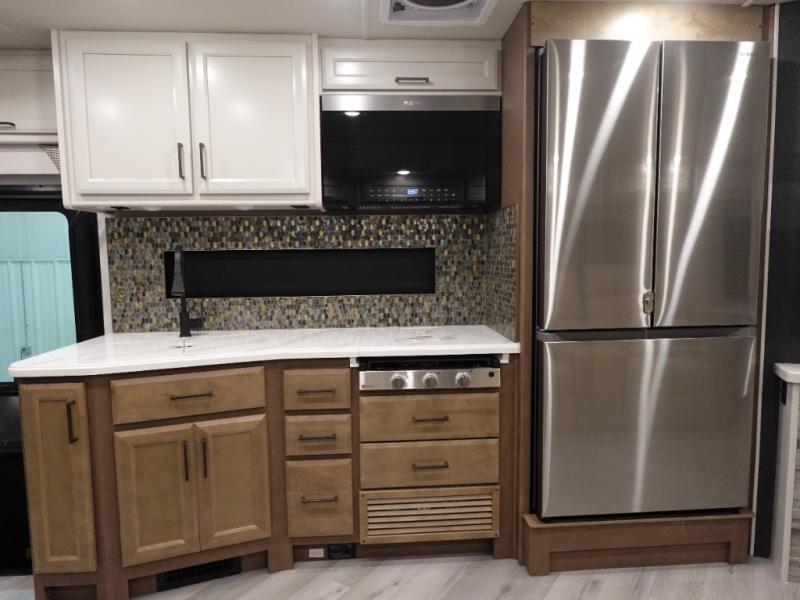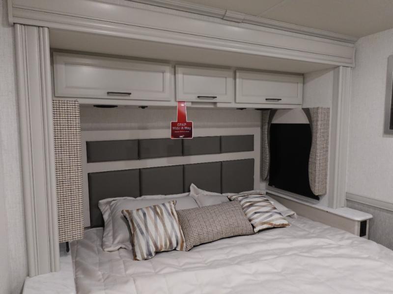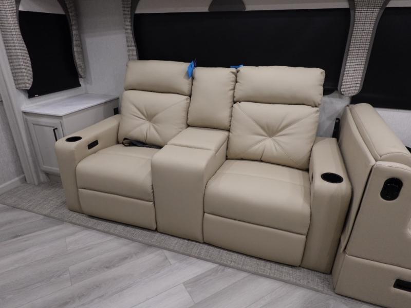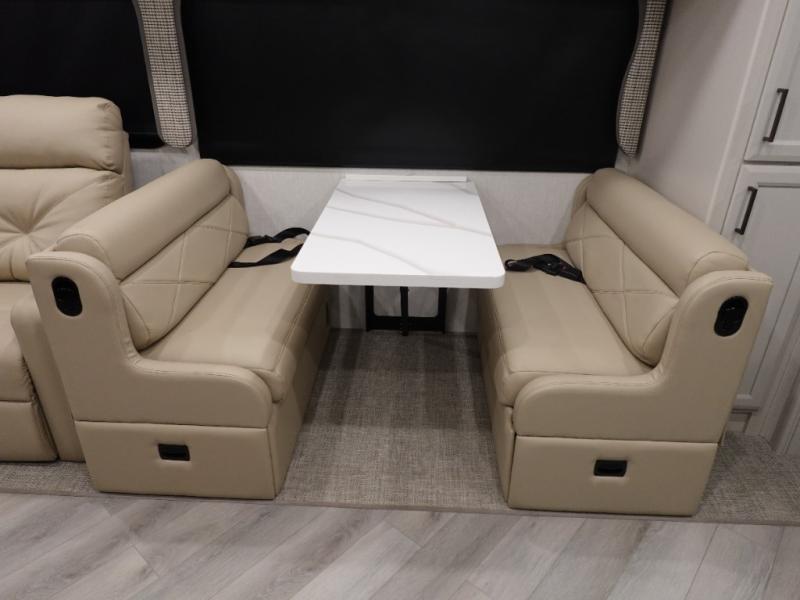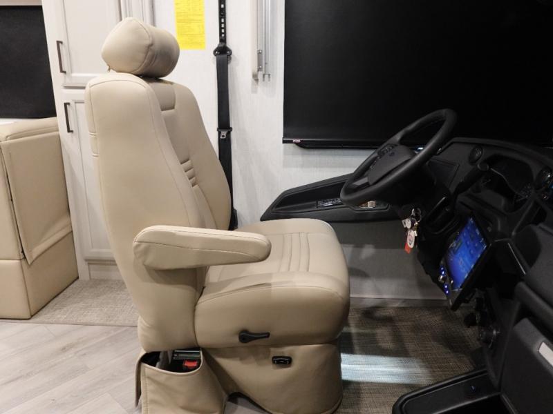 When you are ready to travel the countryside, this coach will get you there in comfort with luxury and residential features that you deserve. The driver and passenger will love the automotive style dash with color monitor and workstation, plus the pedestal table in between. Your guests can use the mid-coach half bath while you have your own master suite with a king bed slide and storage, plus a full rear bathroom all to yourself.