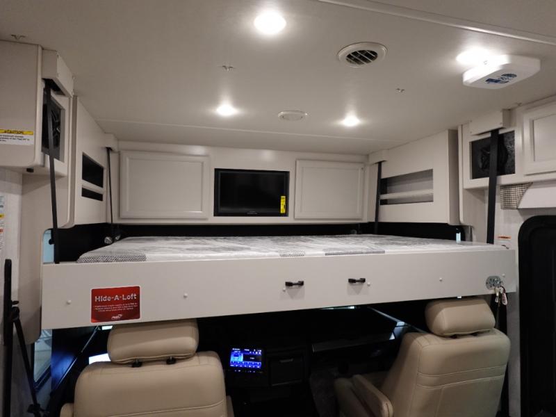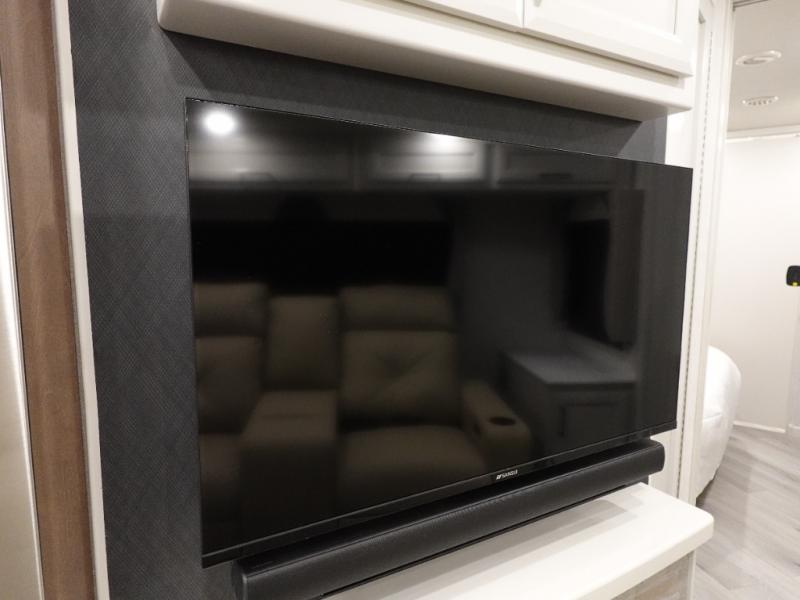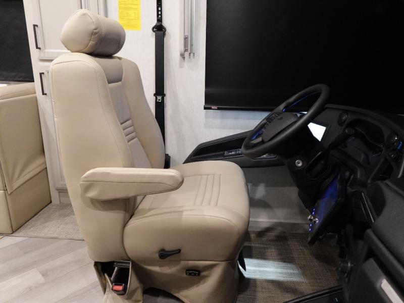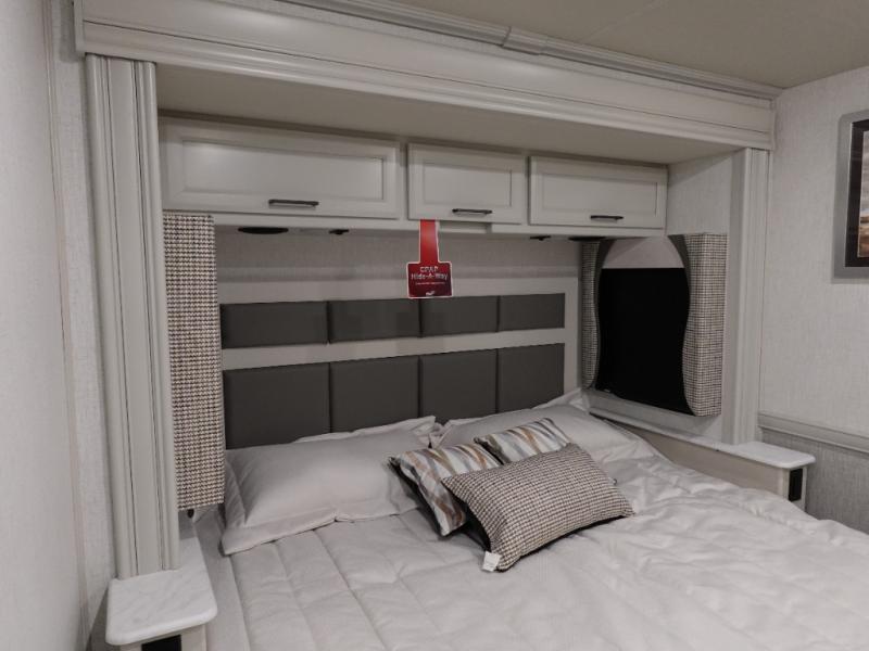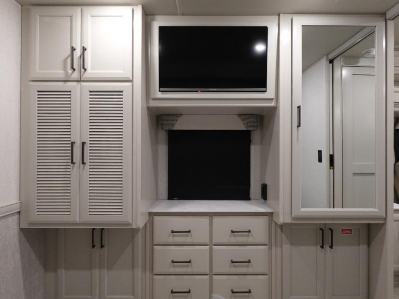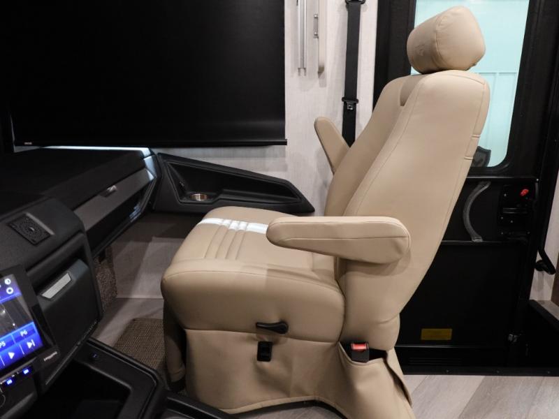 When you are ready to travel the countryside, this coach will get you there in comfort with luxury and residential features that you deserve. The driver and passenger will love the automotive style dash with color monitor and workstation, plus the pedestal table in between. Once you have setup for the evening, you might enjoy reclining back in the chairs or sitting on the theater seats, along with the rest EZ dinette and the Hide-A-Loft power overhead bunk. Your guests can use the mid-coach half bath while you have your own master suite with a king bed slide and storage, plus a full rear bathroom all to yourself.