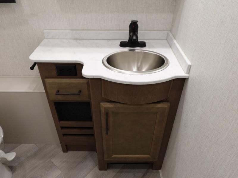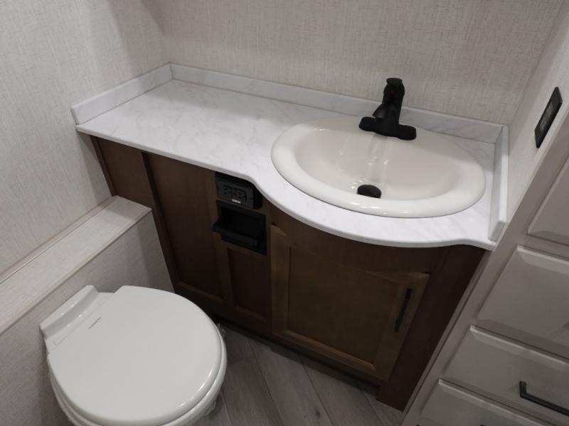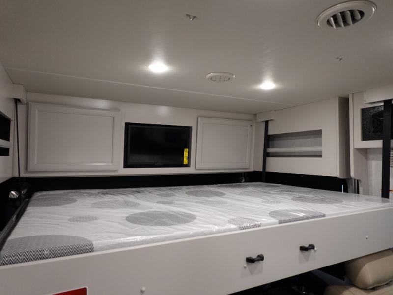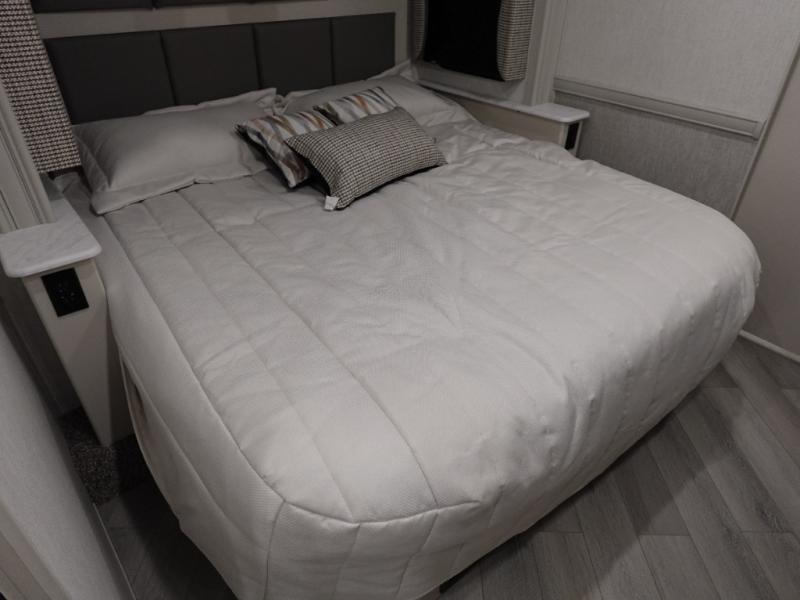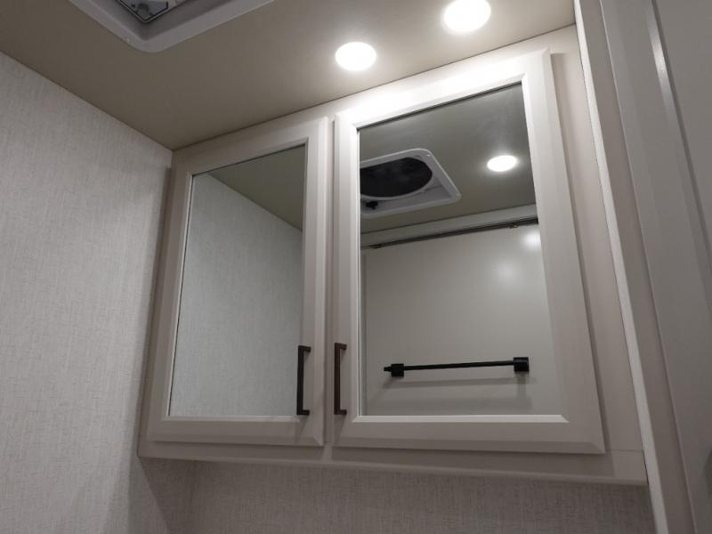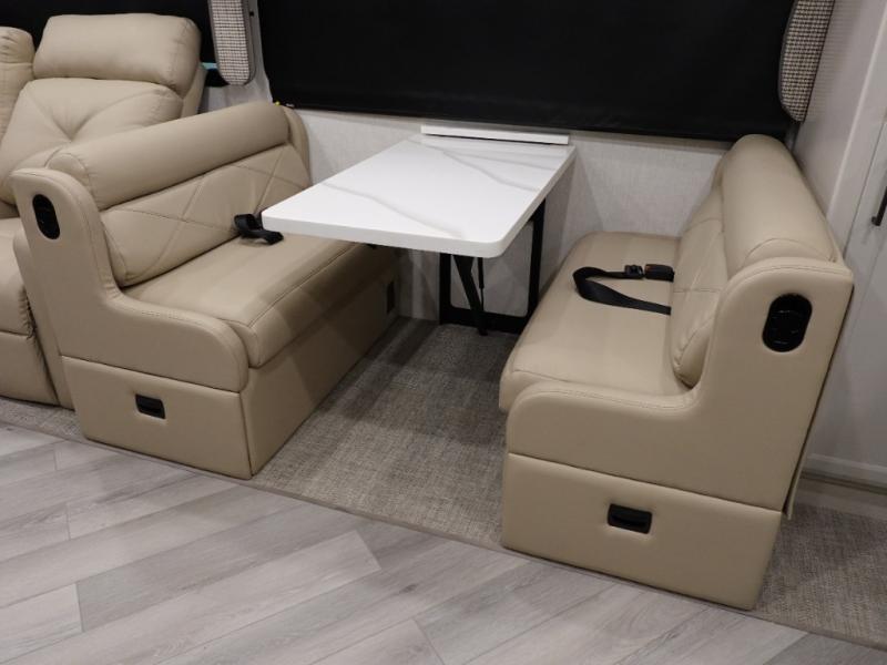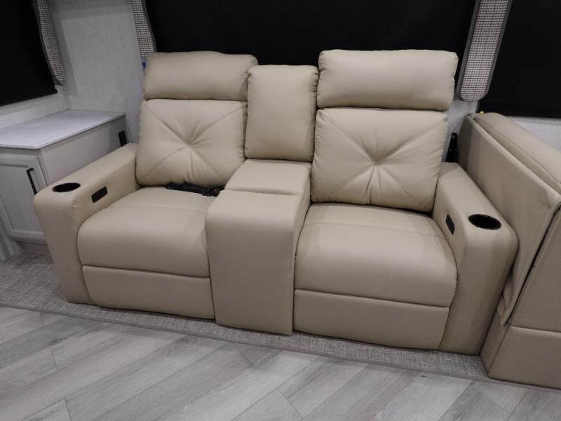 When you are ready to travel the countryside, this coach will get you there in comfort with luxury and residential features that you deserve. The driver and passenger will love the automotive style dash with color monitor and workstation, plus the pedestal table in between. Once you have setup for the evening, you might enjoy reclining back in the chairs or sitting on the theater seats, along with the rest EZ dinette and the Hide-A-Loft power overhead bunk. Your guests can use the mid-coach half bath while you have your own master suite with a king bed slide and storage, plus a full rear bathroom all to yourself.