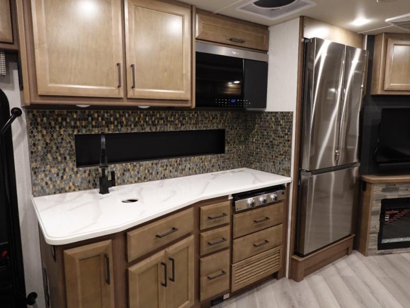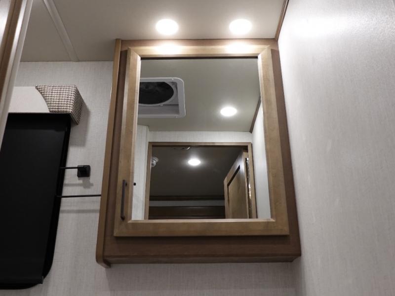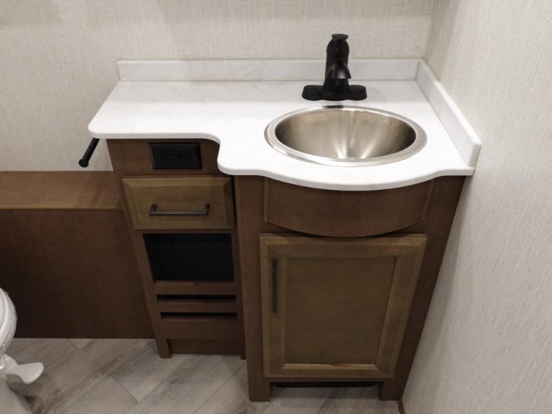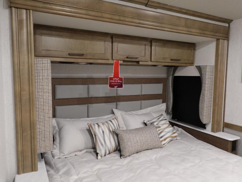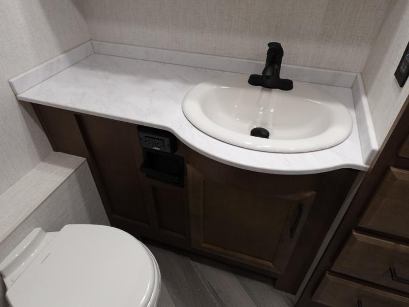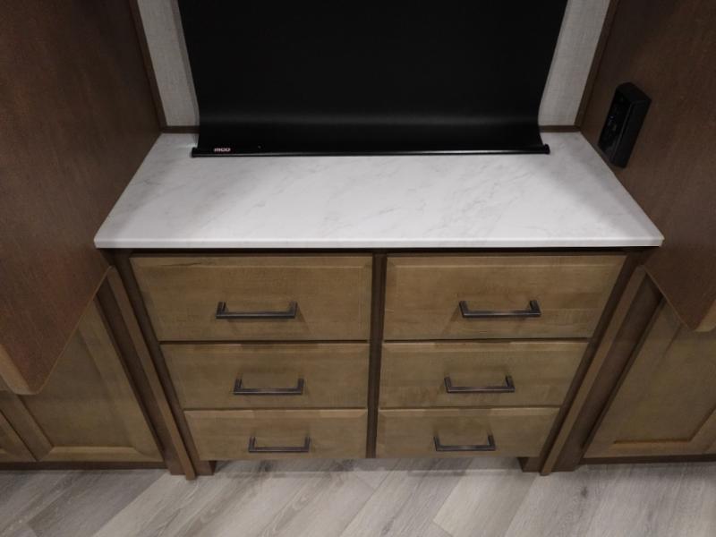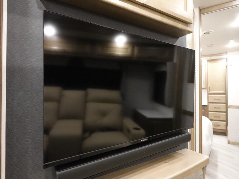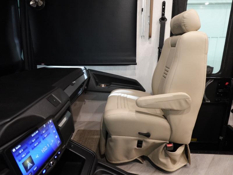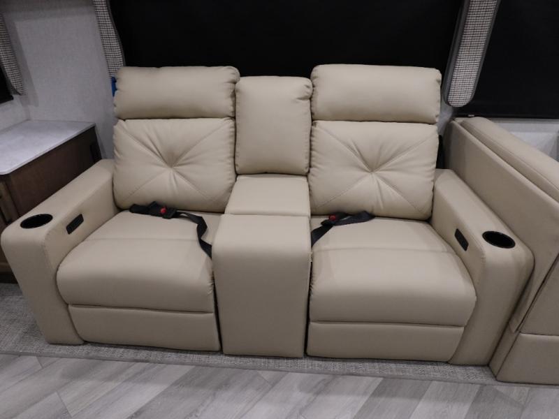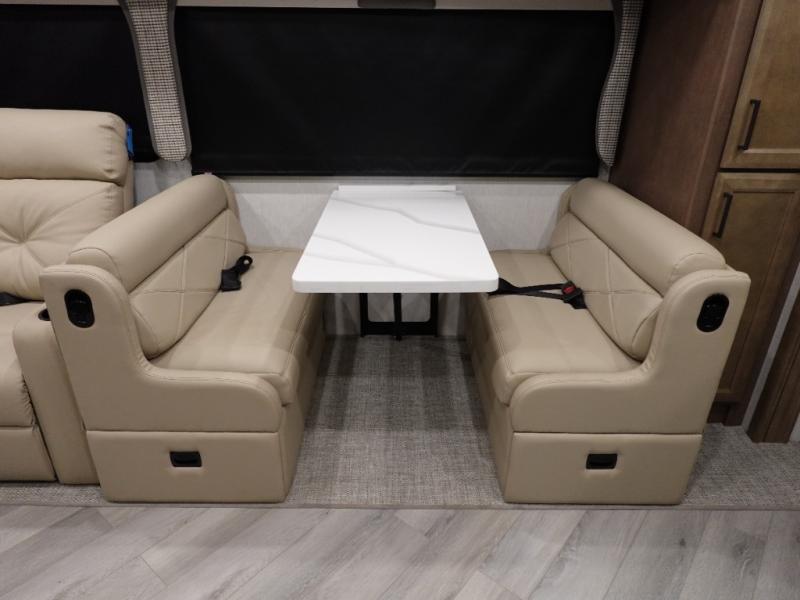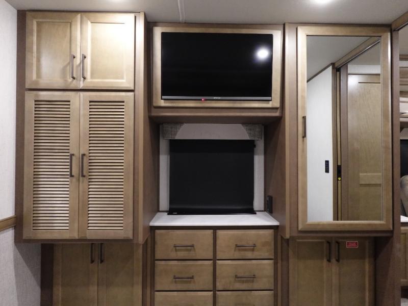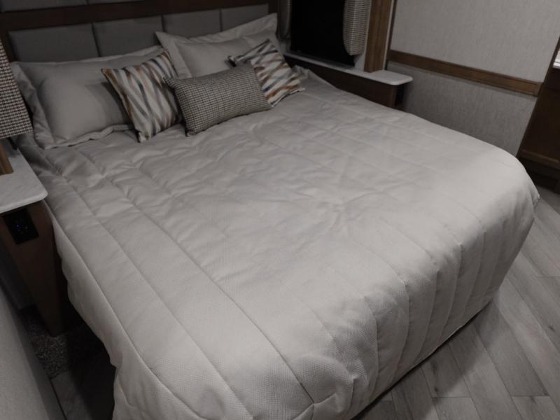 When you are ready to travel the countryside, this coach will get you there in comfort with luxury and residential features that you deserve. The driver and passenger will love the automotive style dash with color monitor and workstation, plus the pedestal table in between. Your guests can use the mid-coach half bath while you have your own master suite with a king bed slide and storage, plus a full rear bathroom all to yourself.