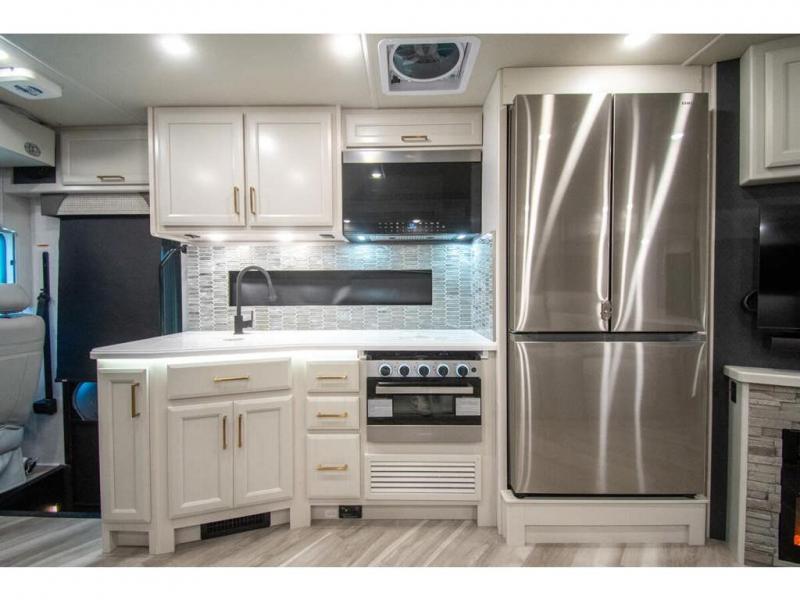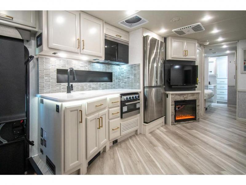 With any Bounder Class A gas motorhome by Fleetwood, you can travel in luxury and style with the power you desire to enjoy the ride as much as the destination. Beginning with the Power Platform Ford chassis, the enhanced safety features such as remote, power-heated mirrors with turn indicators and side cameras, and the color monitor for side and rear cameras, traveling is made easy. There is also an automotive one-piece windshield, a 100W solar panel, and WiFi Ranger Sky4 that come standard. A 5.5kW Onan generator will keep you powered up and you'll find plenty of storage both inside and out for personal belongings, camp gear, and more. Inside you will love the look of the durable, hand-laid Tarkett flooring, the energy efficient LED flush mount ceiling lighting, and the fiberglass shower with a glass door. Choose a Bounder Class A gas coach to discover even more stand-out features!