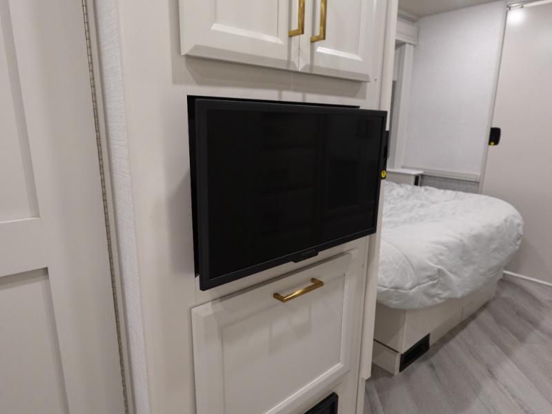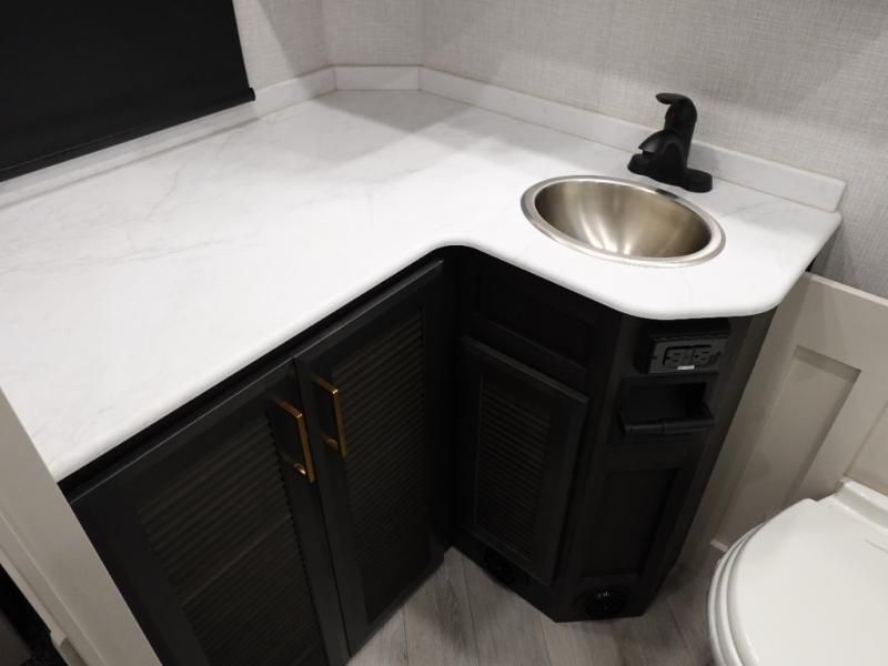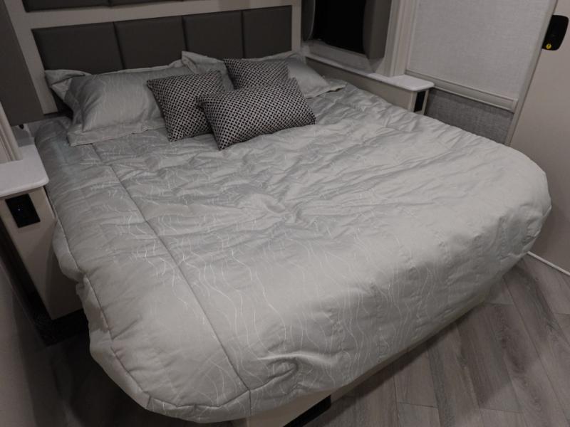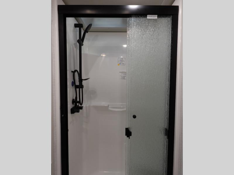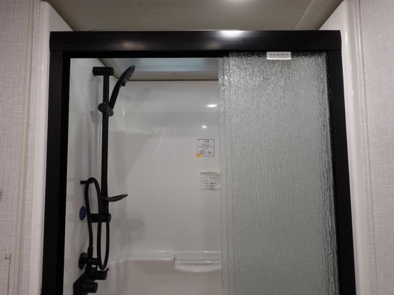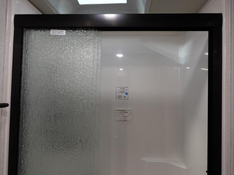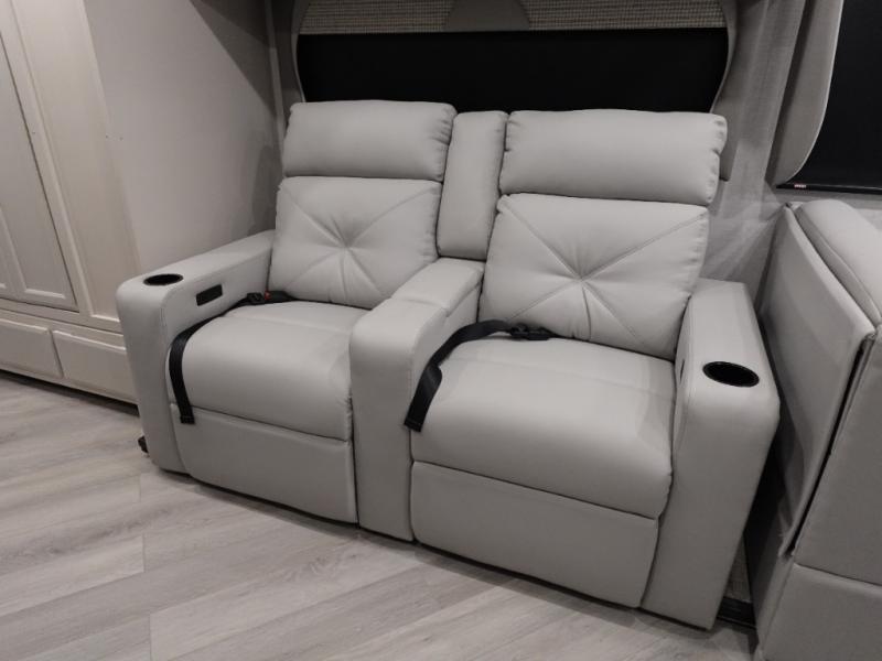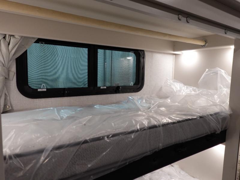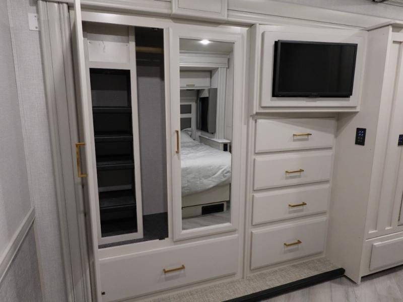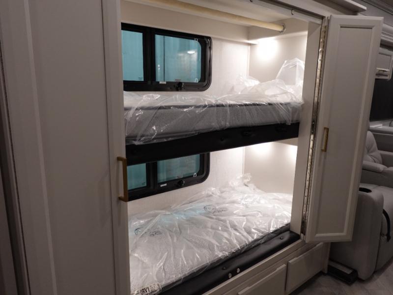 Luxurious, comfortable and spacious are just a few of the adjectives you will be thinking when you see this coach! There is a full-wall slide giving you plenty of interior space to move about, driver/passenger reclining, swivel seats with a pedestal table in between, and convertible bunk beds. You can configure the bunks as a wardrobe and seating space or a TV gaming center the kids are sure to love, and this space can be sectioned off for added privacy. There are two full bathrooms one with a 24" x 40" shower with a seat and another with a 30" x 38" shower with a seat; now that is convenience at its finest. The cook will have full kitchen amenities including a residential refrigerator and convection microwave, plus you can dine at the rest EZ dinette, offering even more sleeping space.