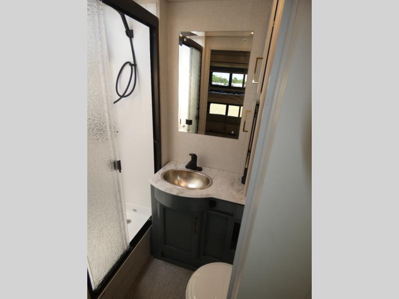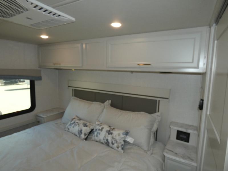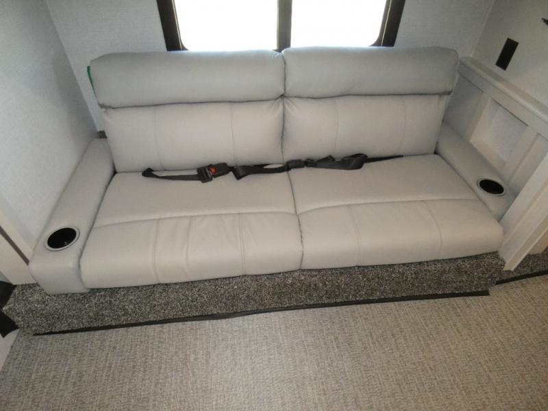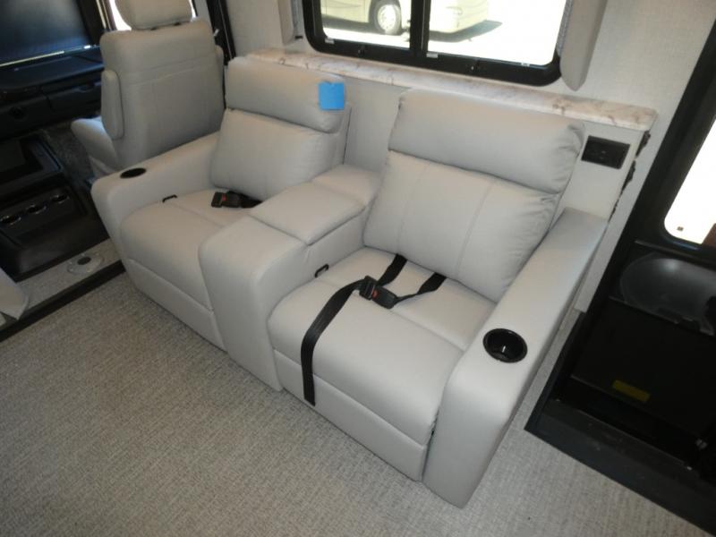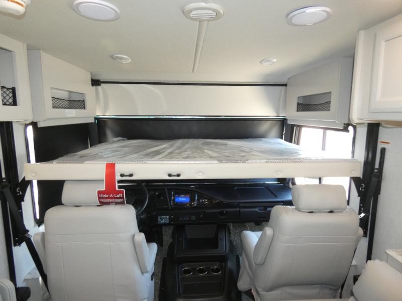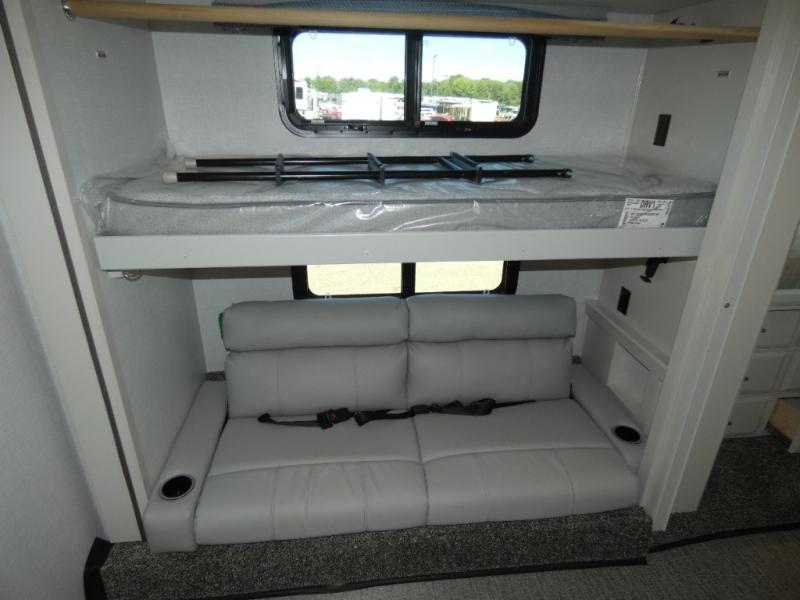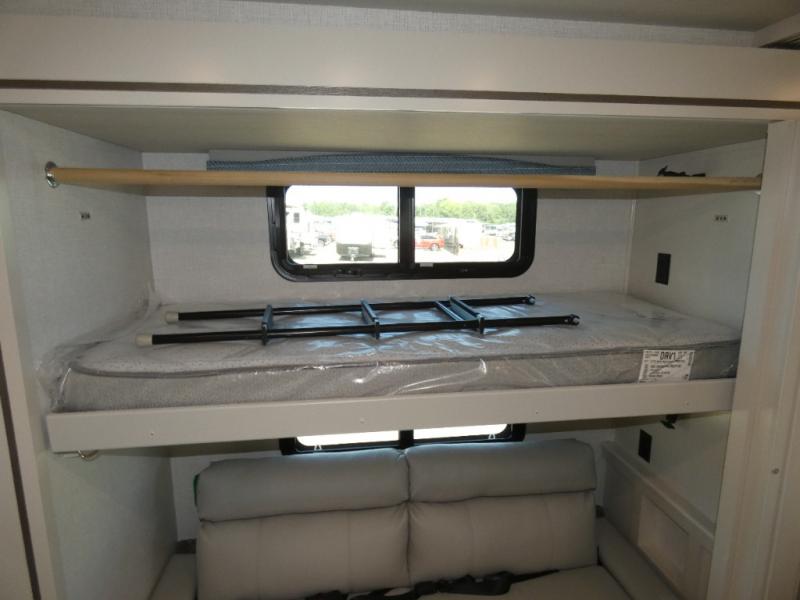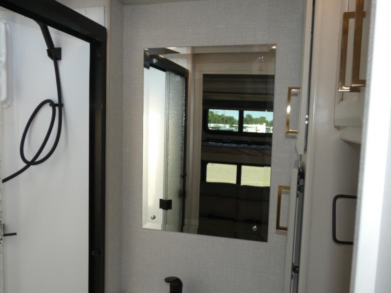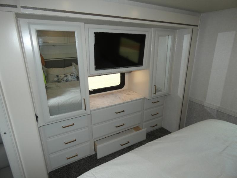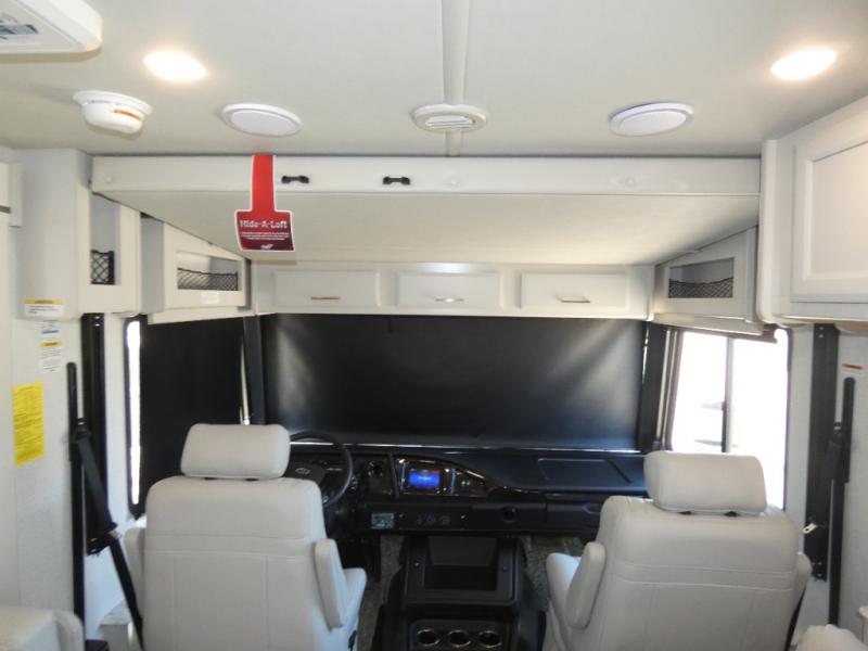 Experience a home away from home with this Flair Class A gas motorhome! The rear private bedroom has a Serenity Series RV king bed to lay your head on at night across from an LED TV with storage and wardrobes on either side of it. There are more sleeping spaces between the Hide-A-Loft electric drop down bunk over the cab, the living area sofa, and the flip-up top bunk above the jackknife sofa which has an LED TV and entertainment center. You could even transform the Dream Dinette into an extra sleeping space when you aren't using it to enjoy a meal prepared with the galley extension, three burner cooktop, and residential refrigerator. Everyone can freshen up in the full bathroom with the 34" x 22" shower and keep your towels close by with the linen closet inside too!