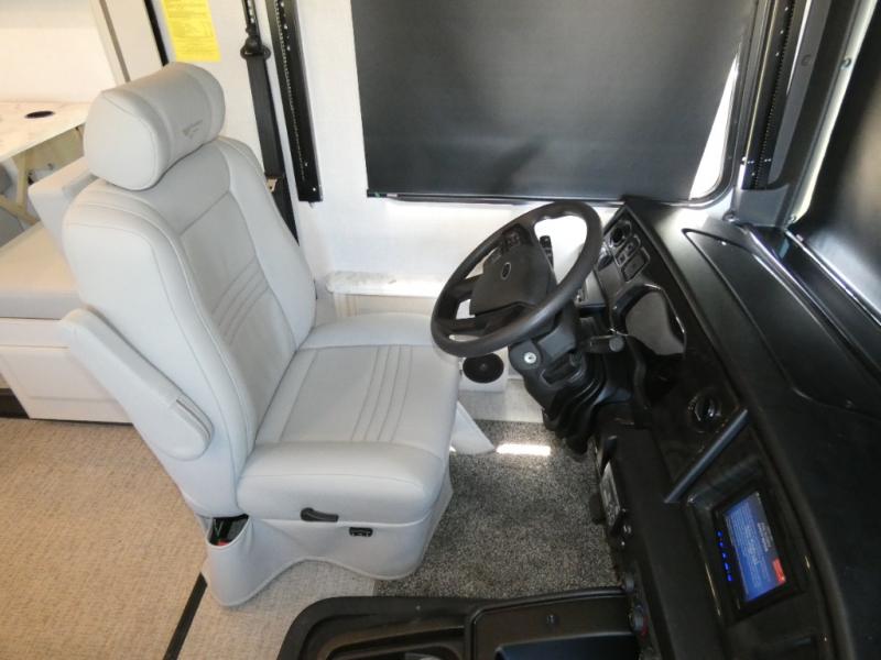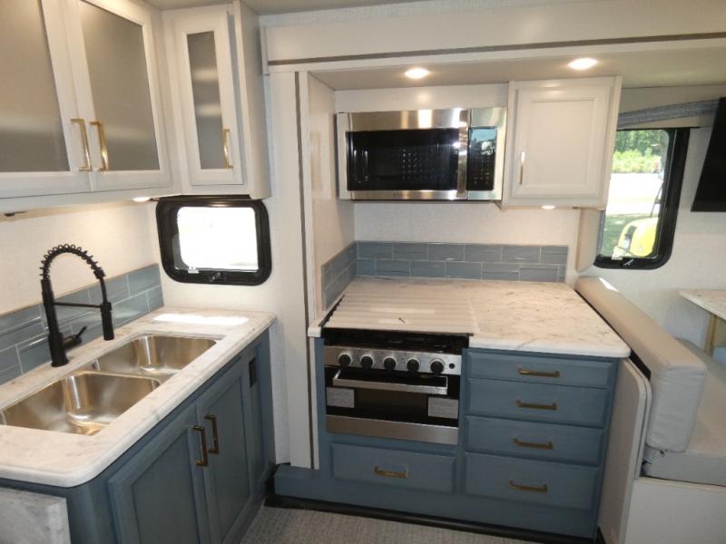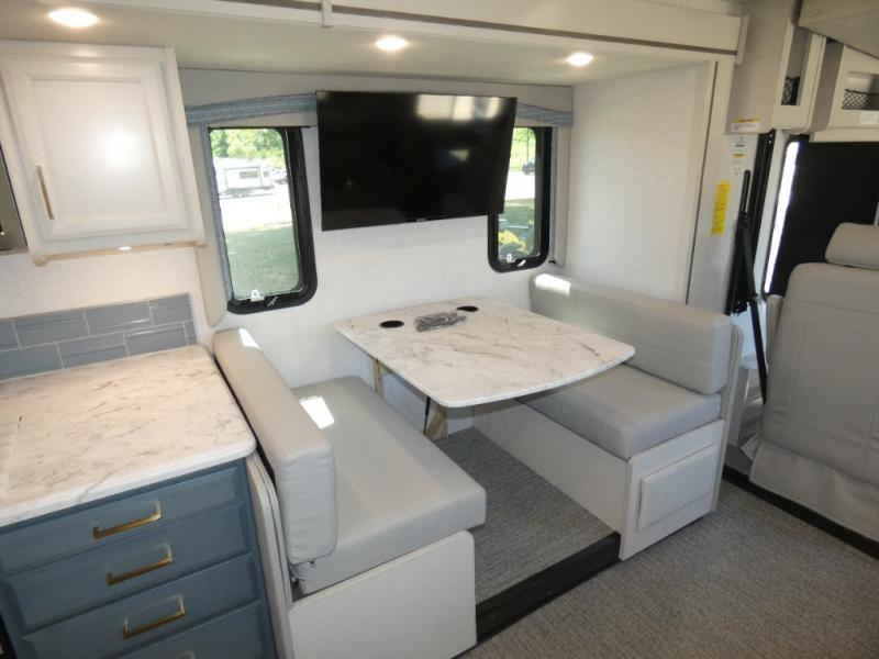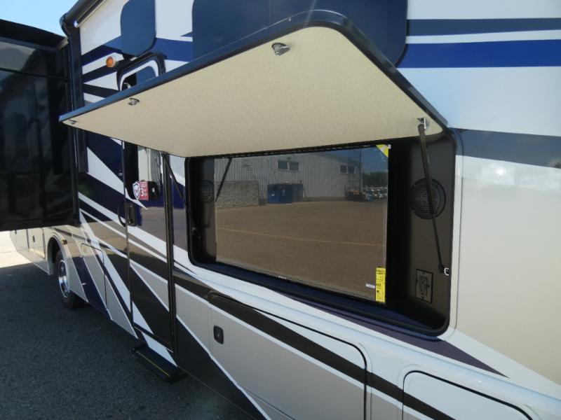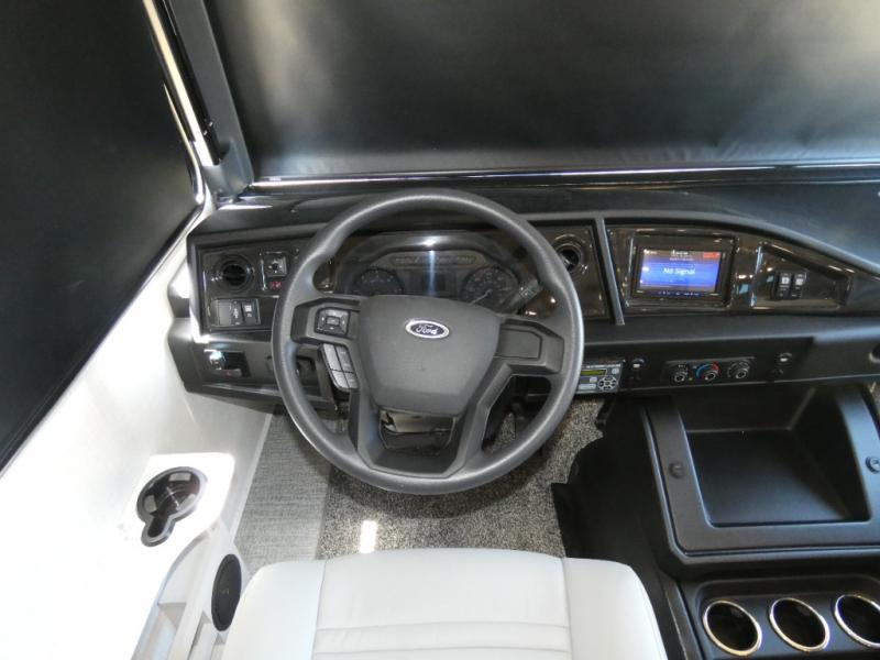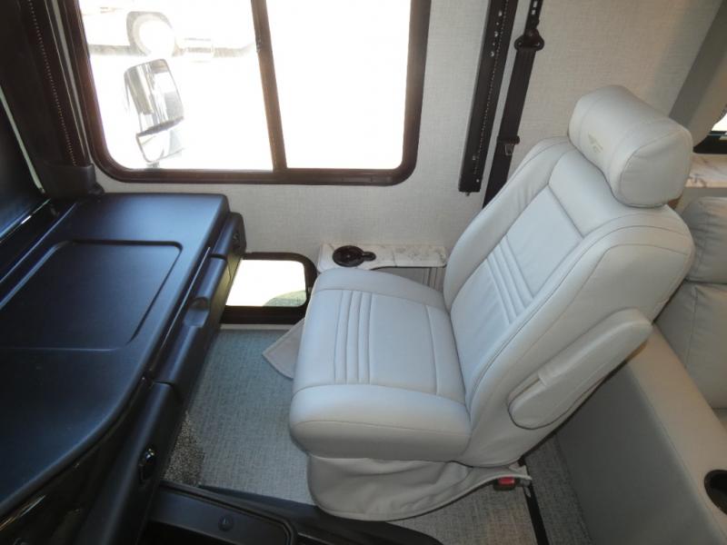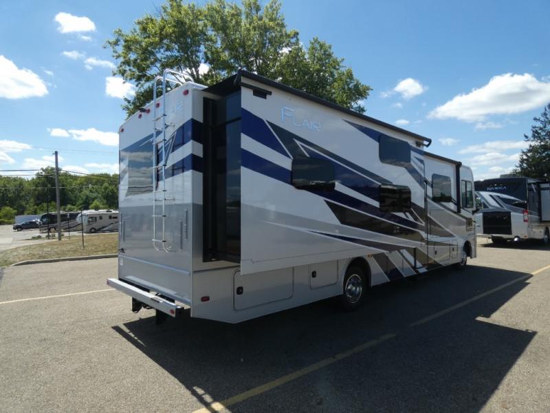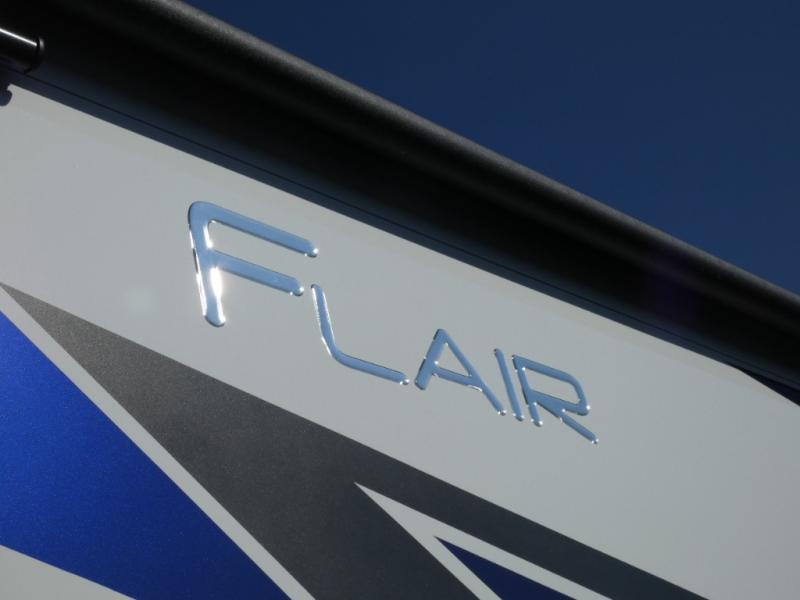 Step up your camping game by adding the Fleetwood Flair Class A gas motorhome to the line-up! The 7.3L 335HP engine with 468 LB/FT of torque forms the base, and the 8,000-LB towing capacity gives you the chance to bring a car with your coach. On the exterior you'll find an automotive, bonded one-piece windshield, exterior-mounted sideview cameras, and an exterior LED TV. The interior is decked out with a dash radio, an electronic instrument panel, and reclining/swivel cab chairs. There is also a workstation at the automotive-style dash, and the Bluetooth coach system in the bedroom has exterior speakers for fun party nights.