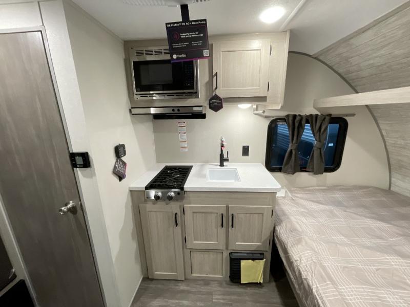 This lightweight travel trailer includes everything you need for comfortable camping trips at the lake. You can make your meals on the two burner cooktop or in the stainless steel microwave, and a 3.3 cu. ft. 12V refrigerator will keep leftovers fresh. A front queen bed provides a great night's rest, and there is a 29" booth dinette that will double as both dining and additional sleeping space. And a private bath with a 24" x 32" shower and toilet will let you easily freshen up without having to use the camp's facilities!