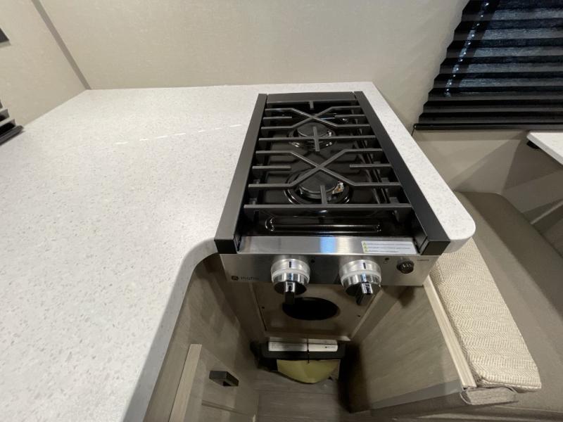 This lightweight travel trailer includes everything you need for comfortable camping trips at the lake. A front queen bed provides a great night's rest, and there is a booth dinette ideal to share meals. You'll appreciate the bedroom storage and overhead shelf, along with an overhead shelf with bins over the sofa to keep your space tidy. The rear corner kitchen includes a two burner gas range and microwave oven, and the private bath is conveniently located in the other rear corner!