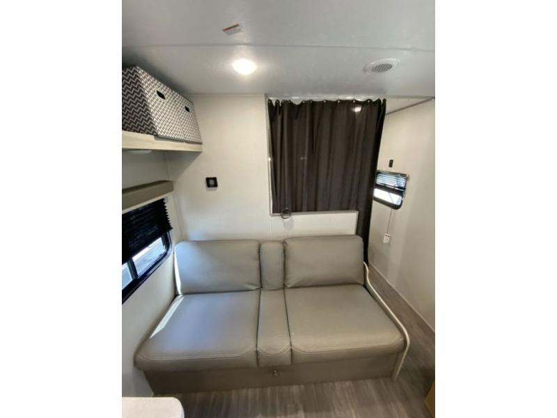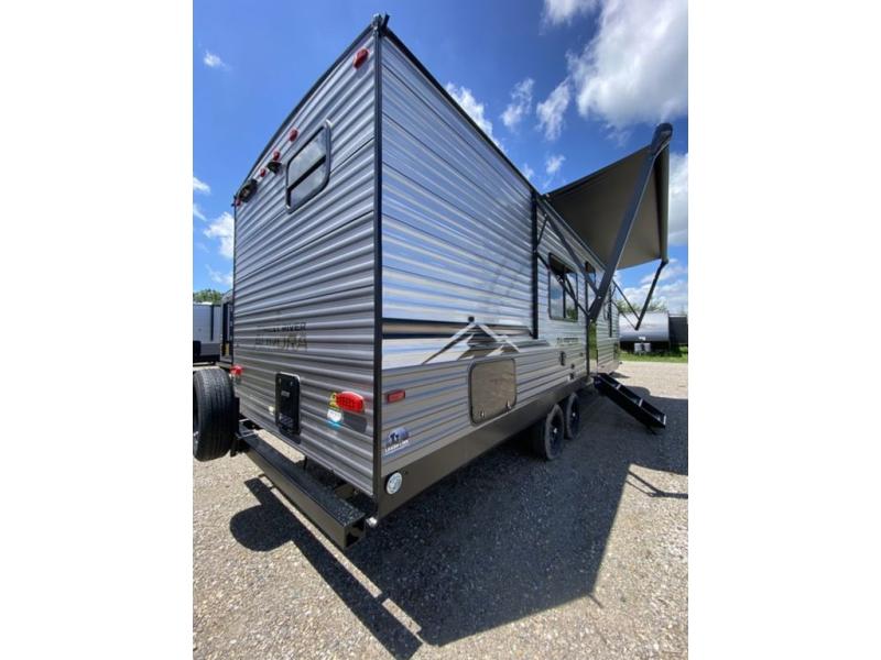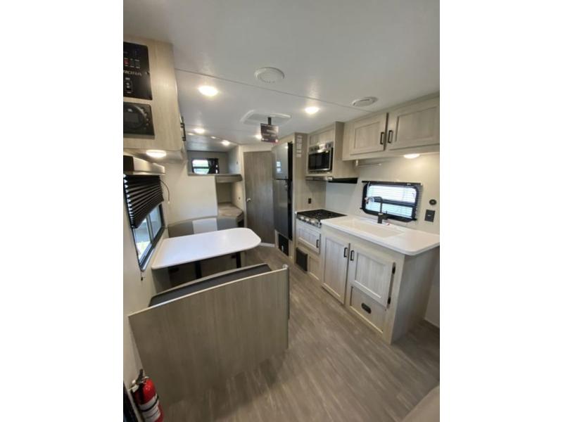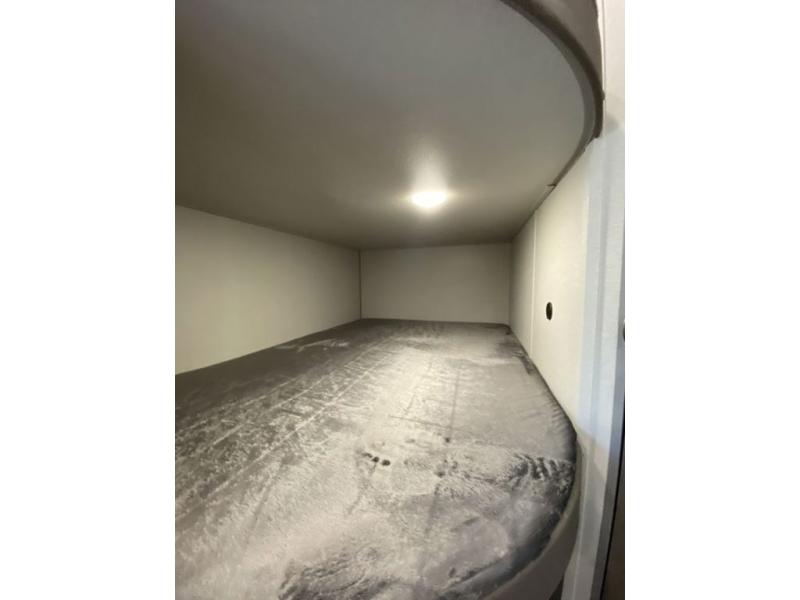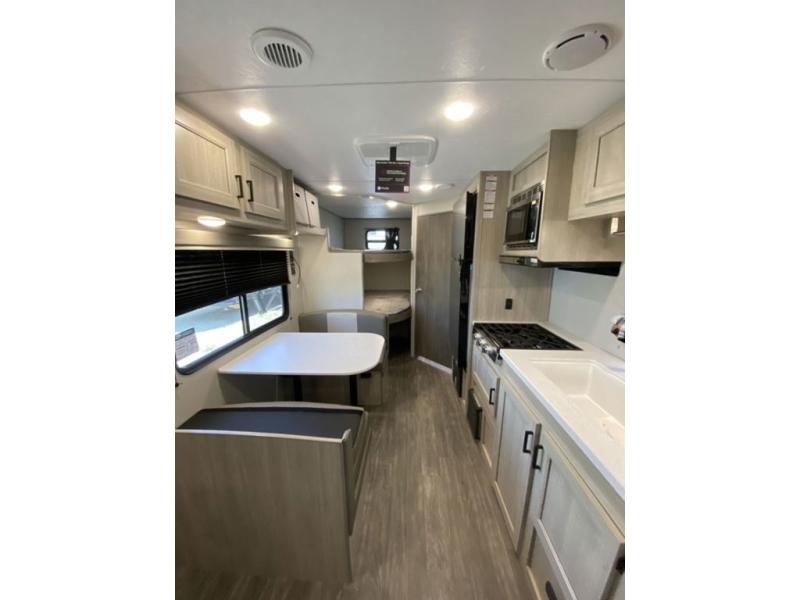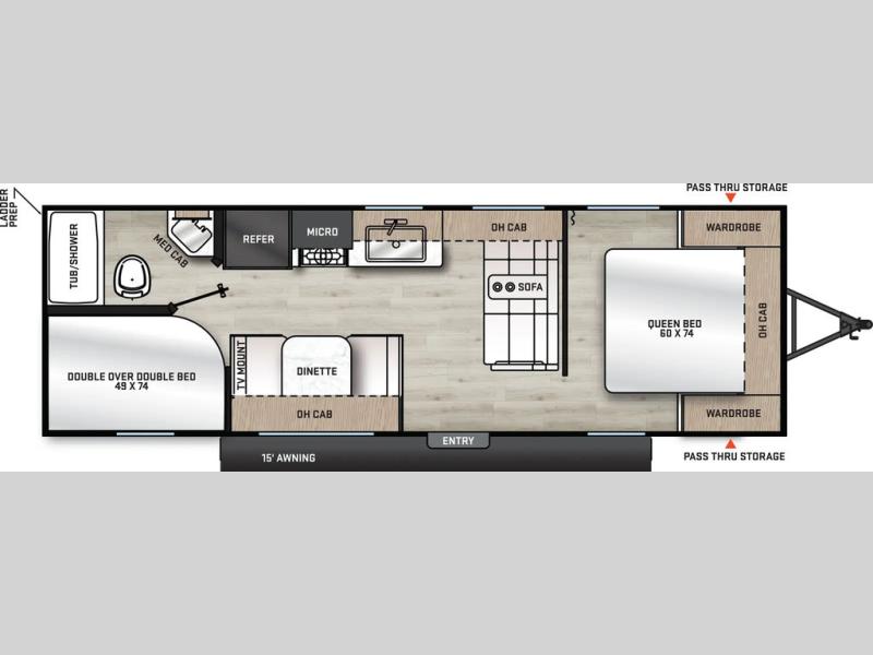 Pack your bags and head out on a fun weekend camping trip with this travel trailer! Whether you have a small family or a few guests wanting to come along, there will be enough sleeping spaces between the double-size bunk beds, the 60" x 74" queen bed in the front semi-private bedroom, and even the booth dinette. The chef can prepare meals indoors using the three burner cooktop or microwave oven, and there is a 12V 10.7 cu. ft. refrigerator for perishables. There is plenty of storage throughout with the overhead cabinets and wardrobes, as well as outside with the front pass-through storage area!
