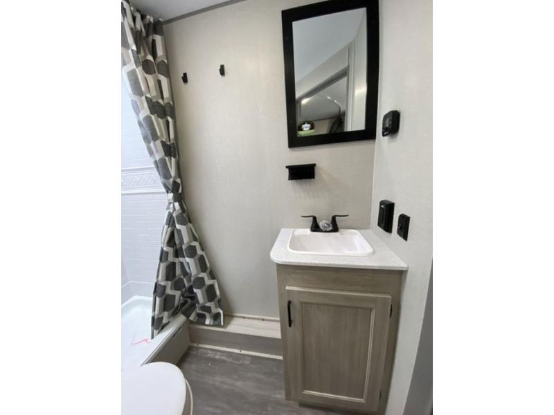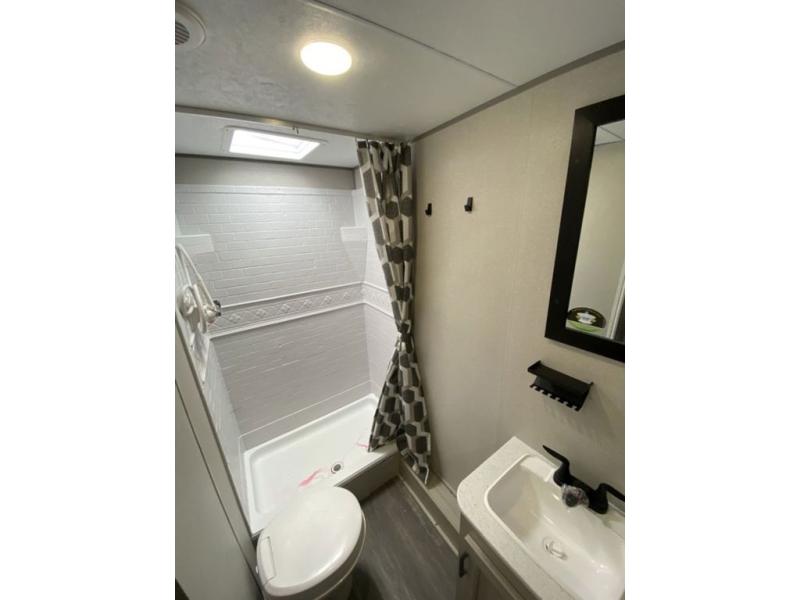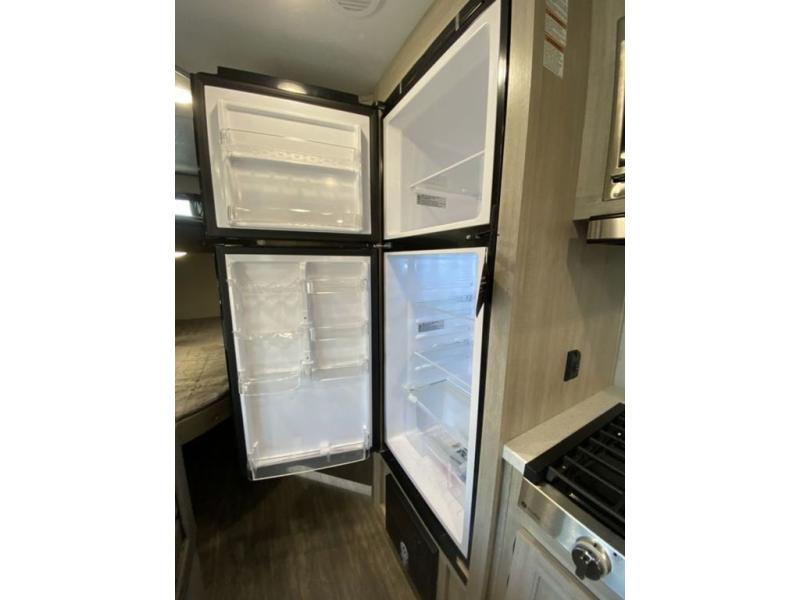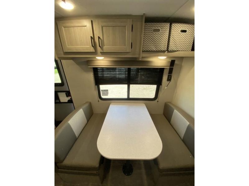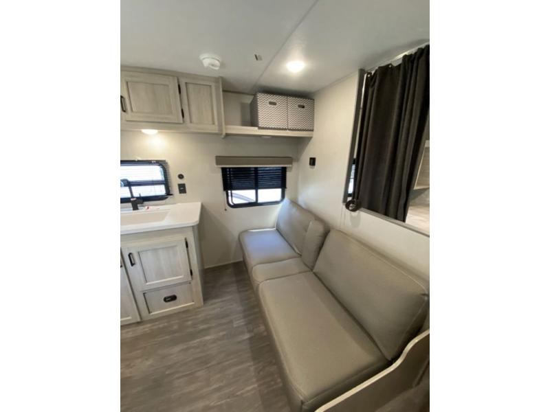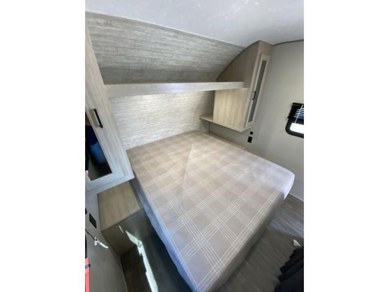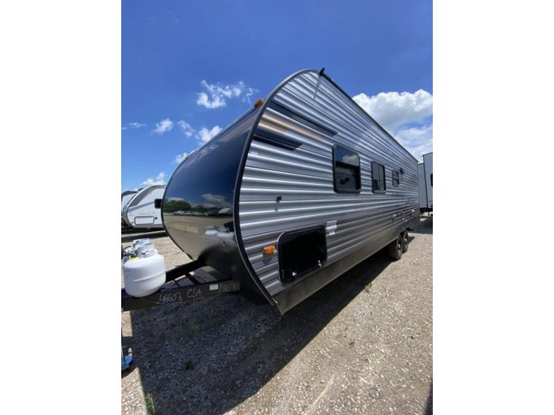 Pack your bags and head out on a fun weekend camping trip with this travel trailer! Whether you have a small family or a few guests wanting to come along, there will be enough sleeping spaces between the double-size bunk beds, the 60" x 74" queen bed in the front semi-private bedroom, and even the booth dinette. The chef can prepare meals indoors using the three burner cooktop or microwave oven, and there is a 12V 10.7 cu. ft. refrigerator for perishables. There is plenty of storage throughout with the overhead cabinets and wardrobes, as well as outside with the front pass-through storage area!