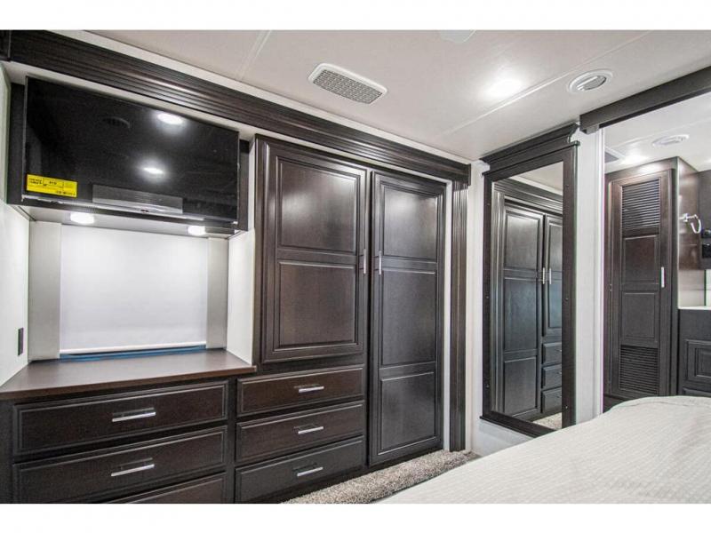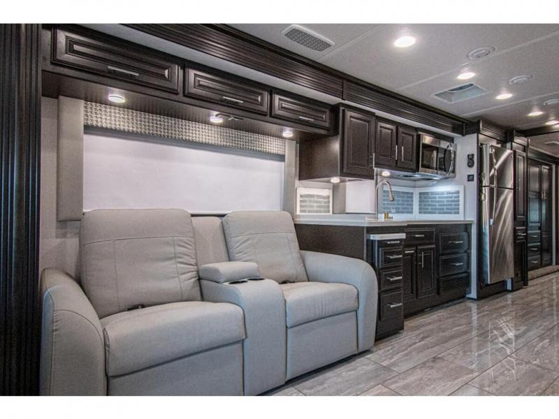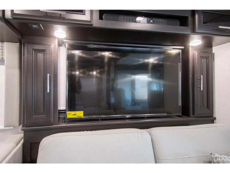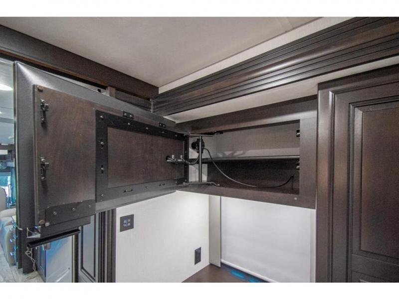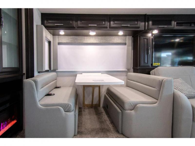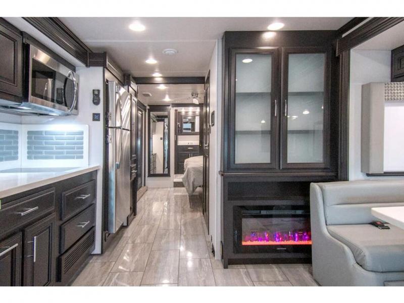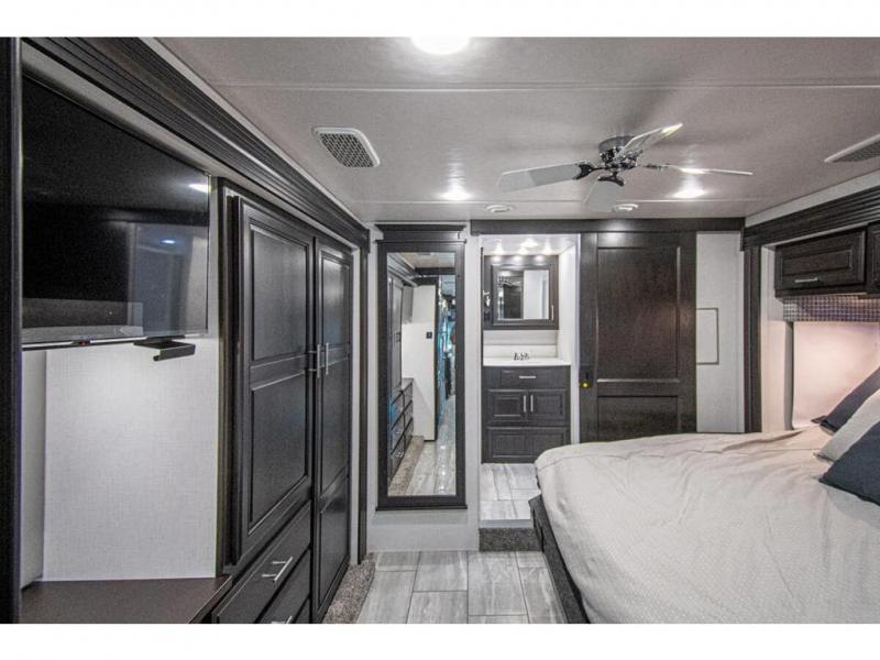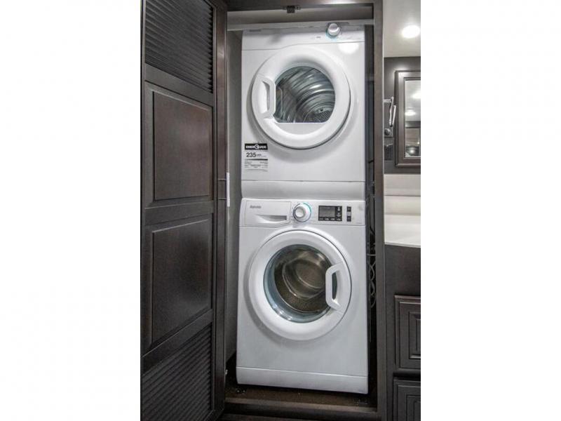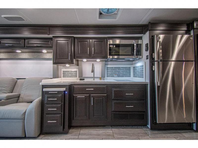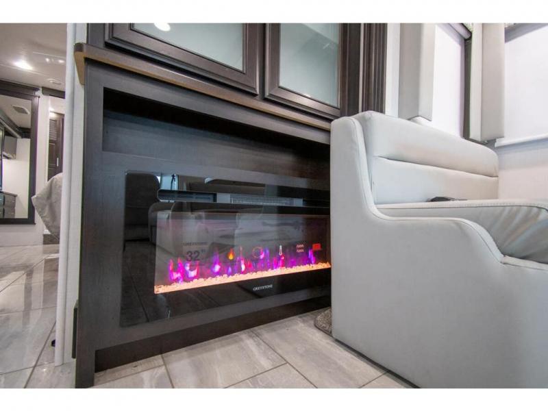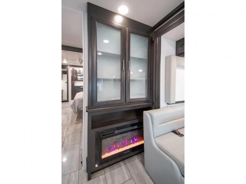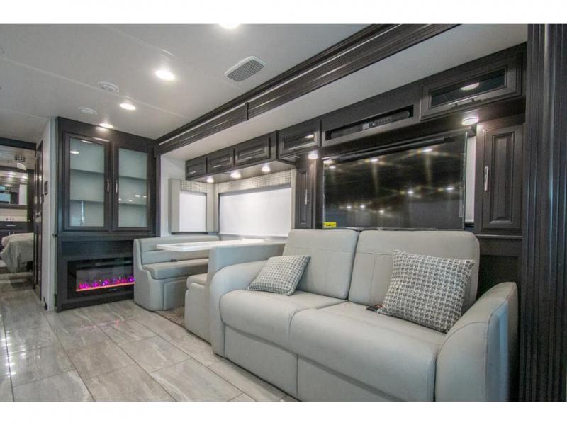 Triple slides plus a bath and a half means more guests can tag along in this comfortable coach. The master bedroom features a dresser base and a wardrobe, plus a 32" bedroom TV to watch your favorite shows at night. You will love the full rear bath that includes a spacious shower, cabinet storage, and a stackable washer and dryer. The main living area will feel more like home with a fireplace, two sofas, a booth dinette, and a 50" LED TV. This coach also includes a double door residential refrigerator, an over-the-range convection microwave, plus a large pantry to store snacks and paper goods.